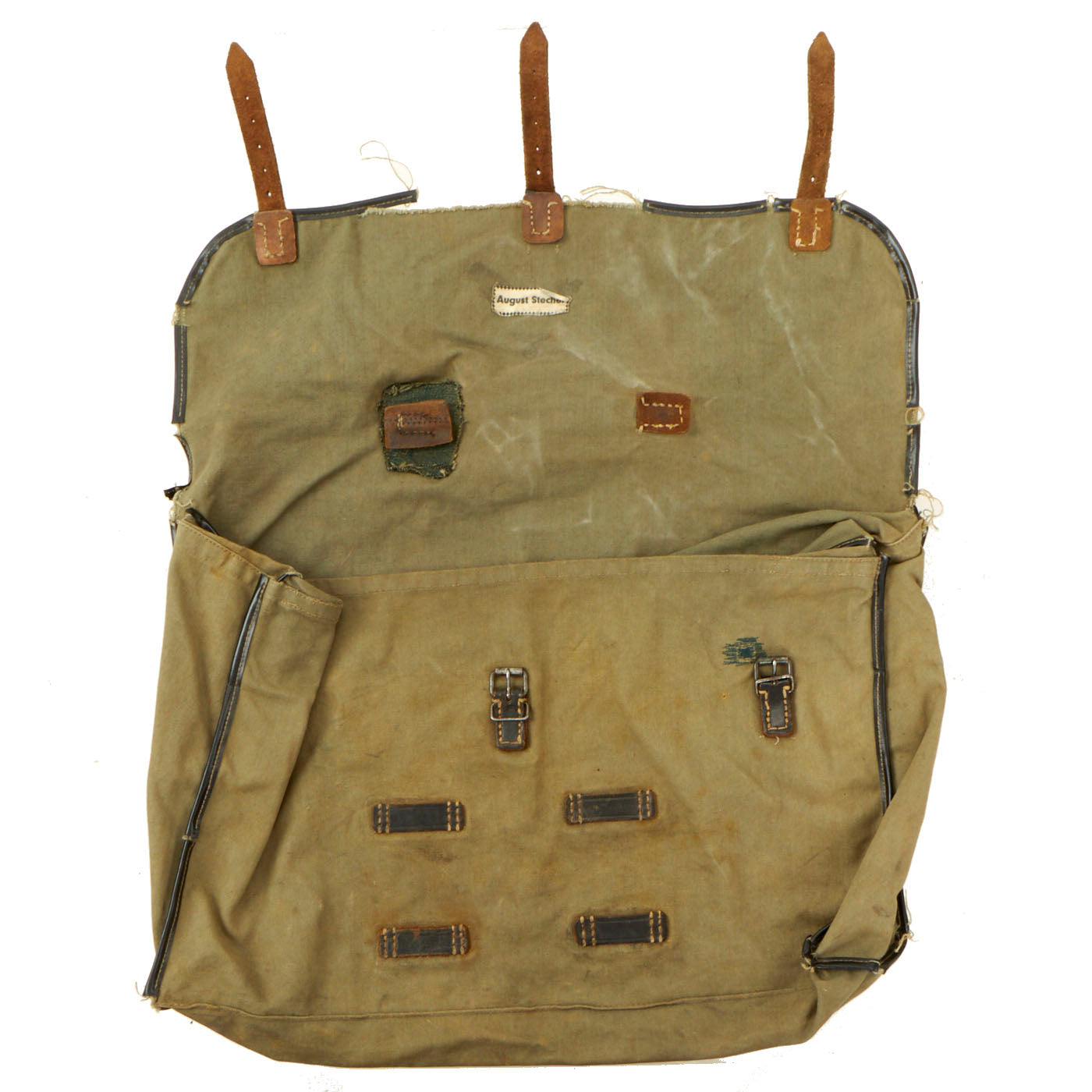 WWII German Named Garment Type Bag: The bag shows signs of use and has various field repairs to it. The bag has a named tag on the inside flap with the name AUGUST STECHER printed on it. We were able to locate information on the German soldier, who was unfortunately Killed In Action on the Eastern Front.