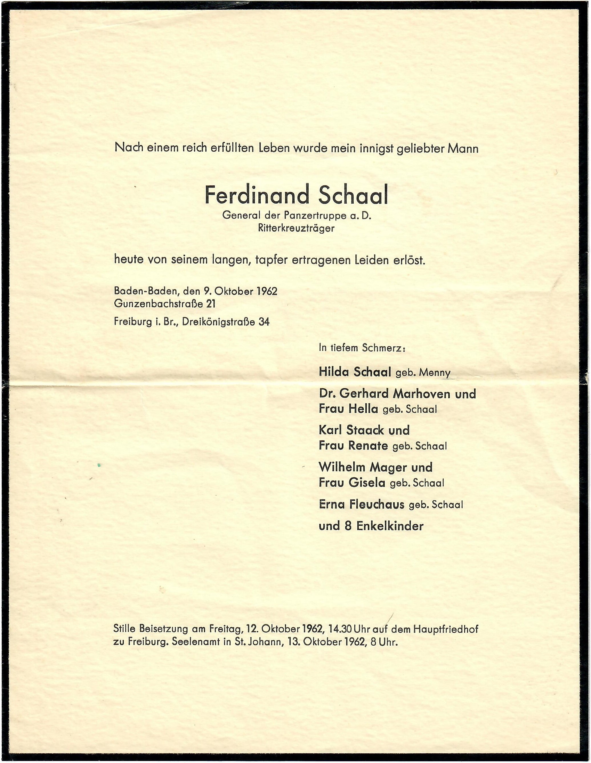 ● An original, 1962 dated Funeral Notice for Ferdinand Schaal, General der Panzertruppe a. D. Ritterkreuzträger. It states the following at the top: