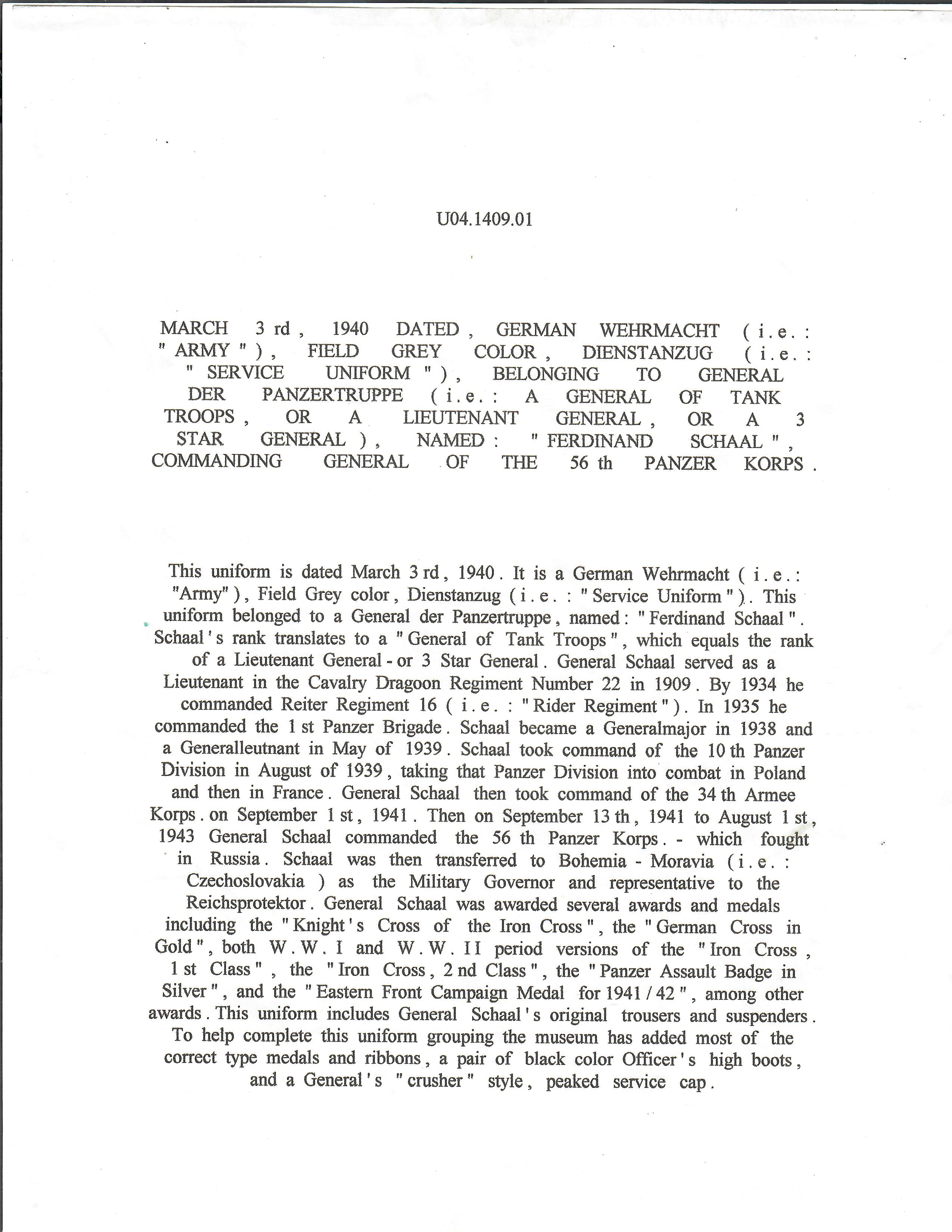 ● The original information / inventory listing from the A.A.F. Tank Museum, which gives a very detailed history of Schaal's military progression during the interwar years and during the war.