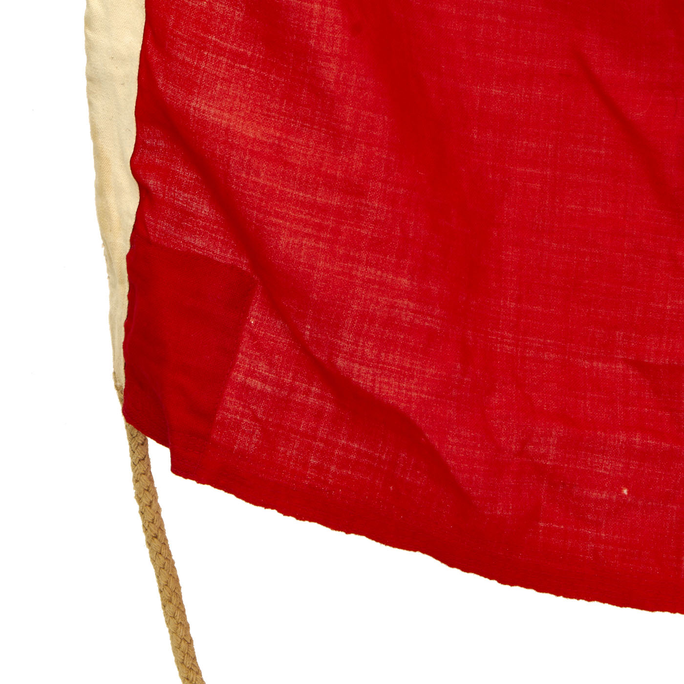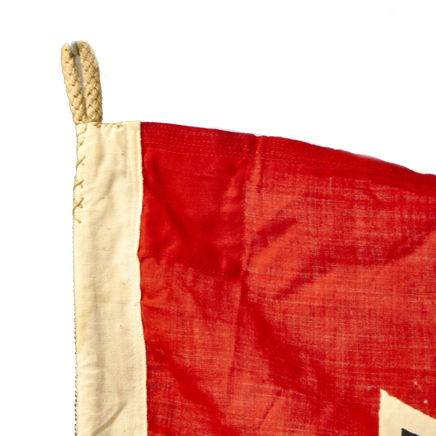 Constructed of wool with a bright red background with a large white central circle displaying a large Swas (hook cross) with the German Naval Balkenkreuz (Beam Cross) design also in black to the edges. In the top corner (Canton) is a black on white Eisernes Kreuz (Iron cross). It features a canvas header, with a halyard running the full length of the header, with a loop at the top and 46" of rope at the bottom.