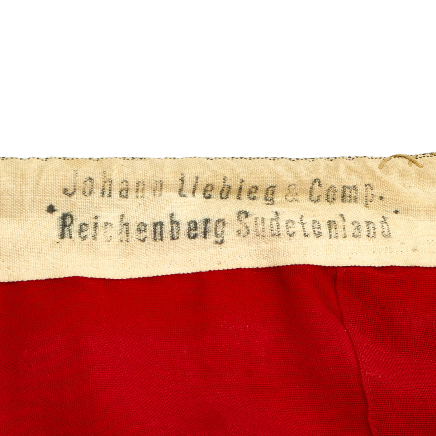 This battle flag is totally original and is in very good condition with some areas of light staining but nothing major. There is the usual age toning, but the red is still vibrant, and there is no major mothing we can see. There are a few small holes scatted throughout the flag. It is nicely stamped on the header with the manufacturer information fully legible: