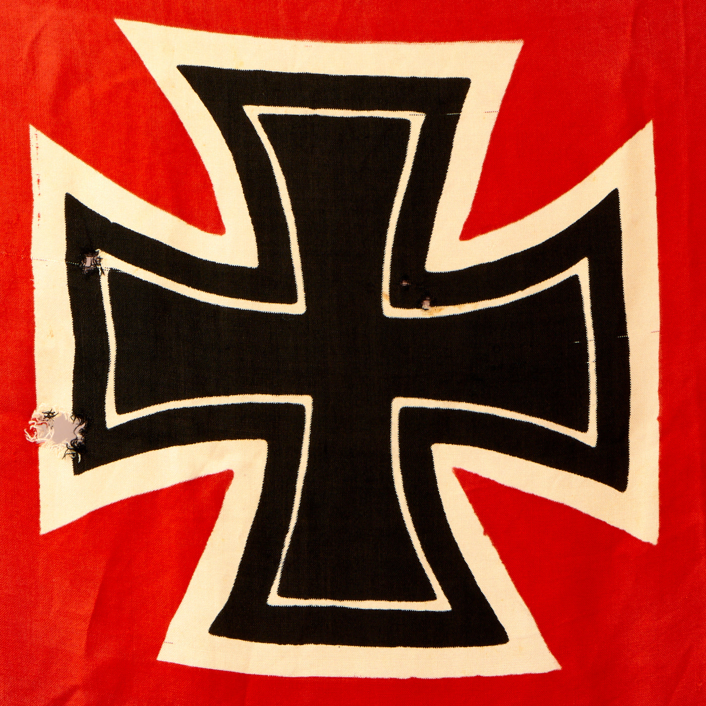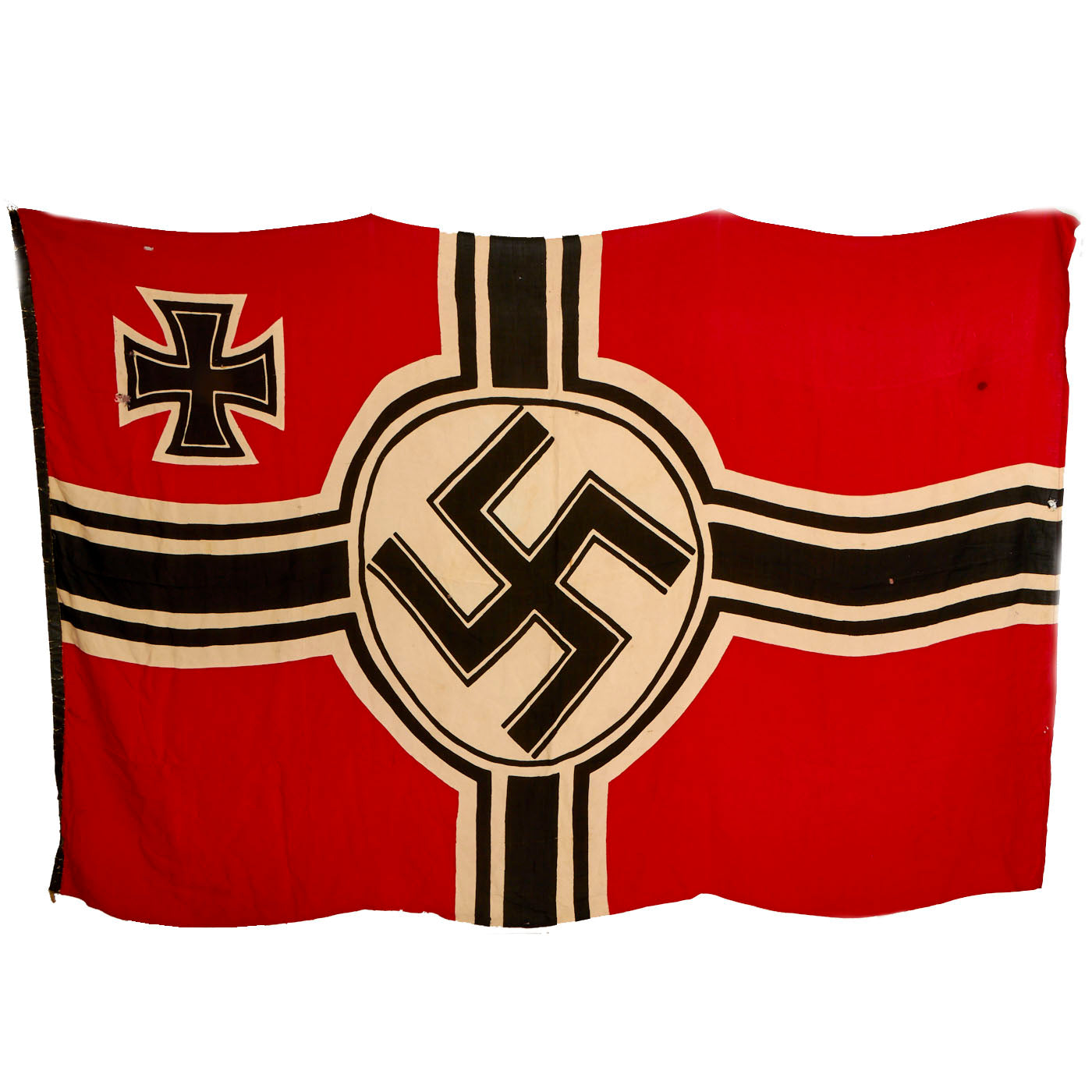 Constructed of wool with a bright red background with a large white central circle displaying a large Swas (hook cross) with the German Naval Balkenkreuz (Beam Cross) design also in black to the edges. In the top corner (Canton) is a black on white Eisernes Kreuz (Iron cross). It features a black coated canvas header, with a halyard running the full length of the header, with a loops at the top and bottom.