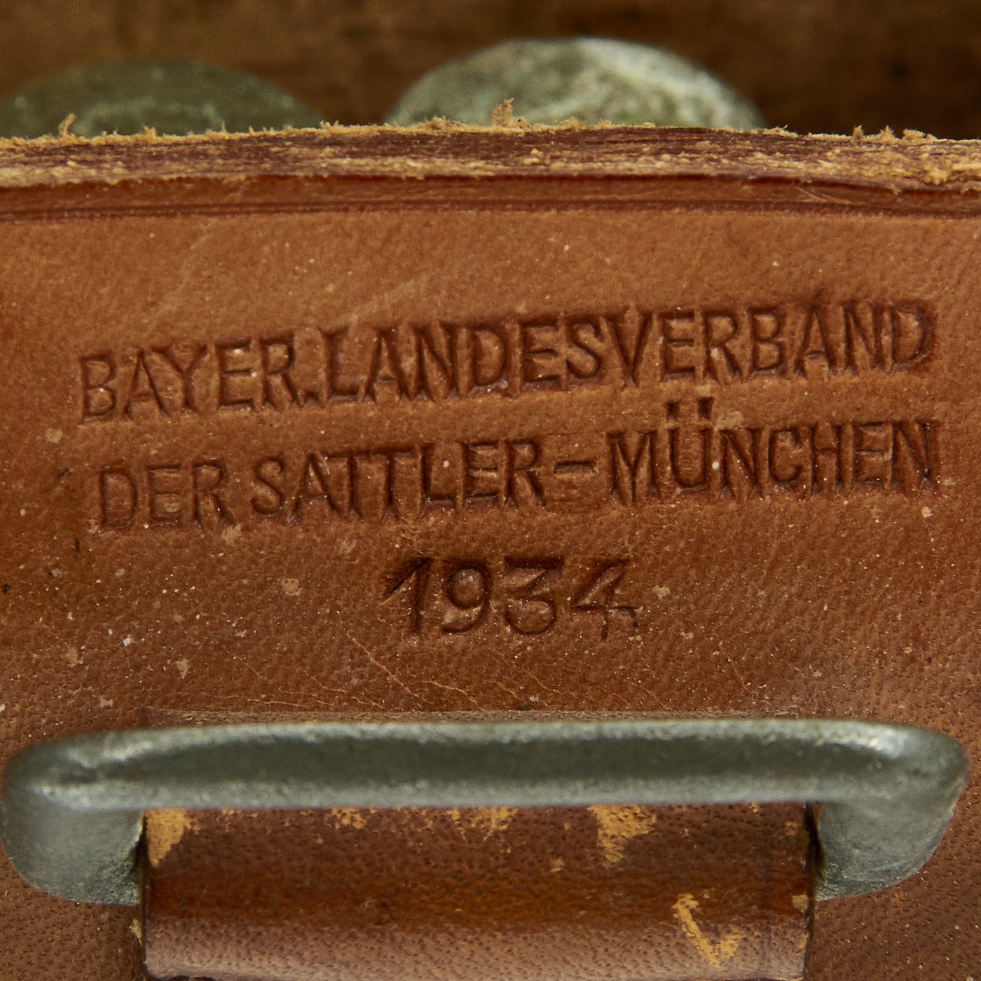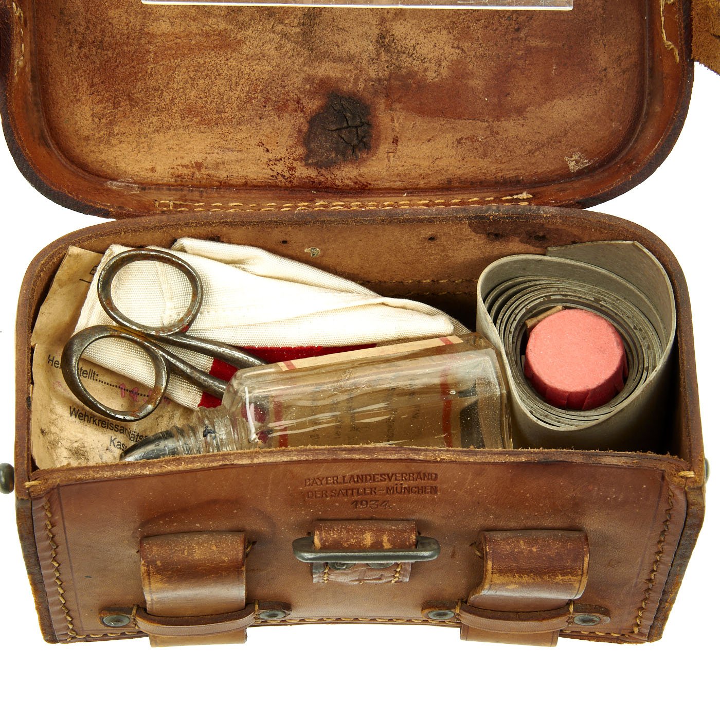 Original Item: Only One Available. This is an original Pre-WWII brown leather medic pouch. Nicely stamped on the top; SA NSDAP. The side is maker marked and dated 1934. Also included are the original medical supplies including: