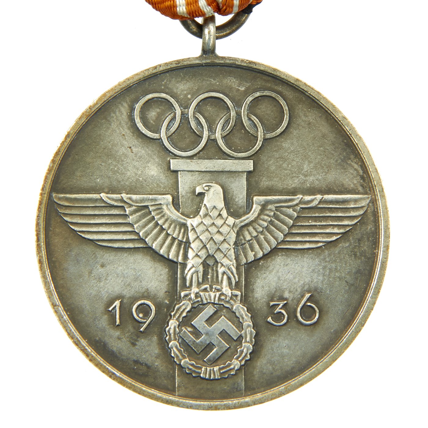 Original Item: Only One Available. This is an excellent condition 1936 Berlin Summer Olympic Games Medal. Constructed in silvered bronze, measures 37mm diameter, in extremely fine condition and complete with original ribbon.