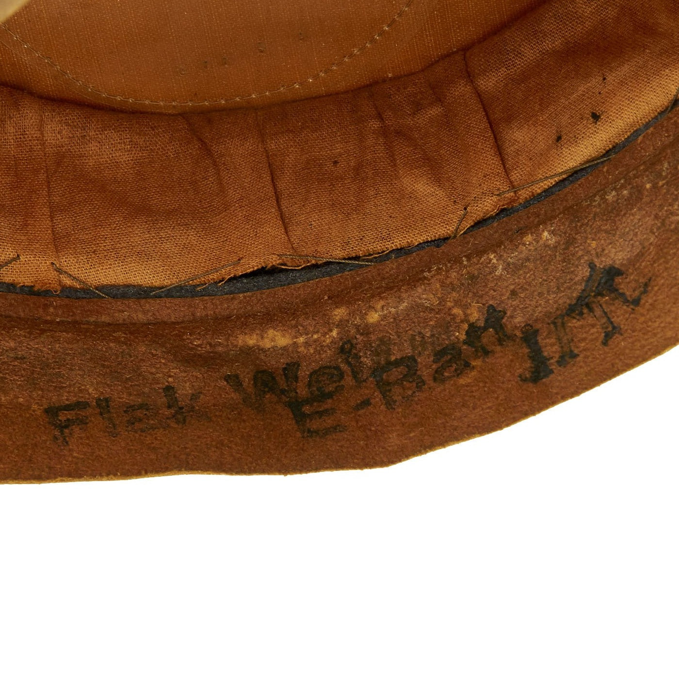 The body with its dark piping is in very good condition, aside from a few moth nips. The size 58 liner has a tan oilcloth interior, complete with the original moisture shield. The sweatband is very nice leather, though it does show wear and staining. Underneath the band is an ink stamped regimental marking, which unfortunately cannot be fully read. What we can read is: Flak Wei / E - Batt II. It also has the name Wittig on a piece of card stock in the celluloid diamond.