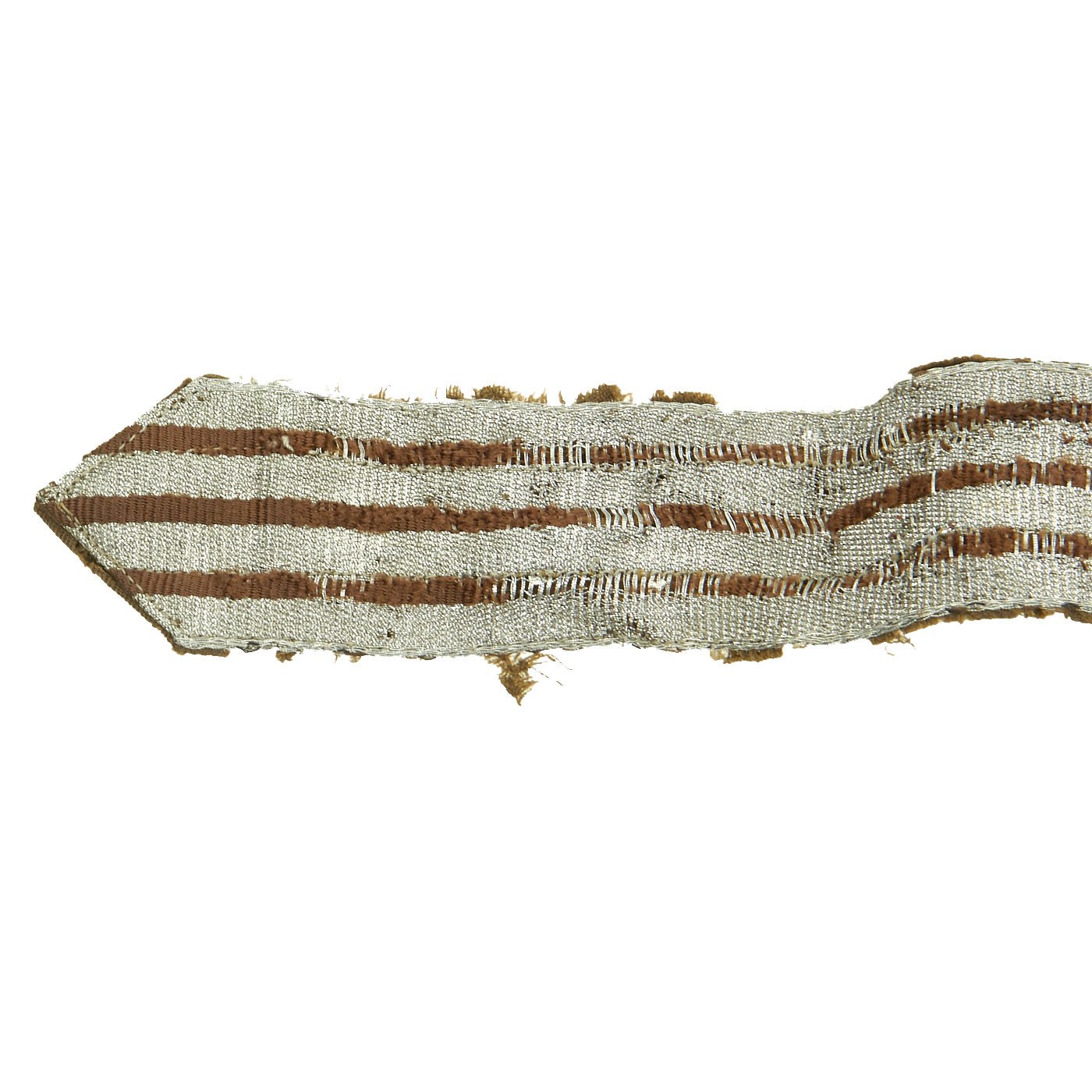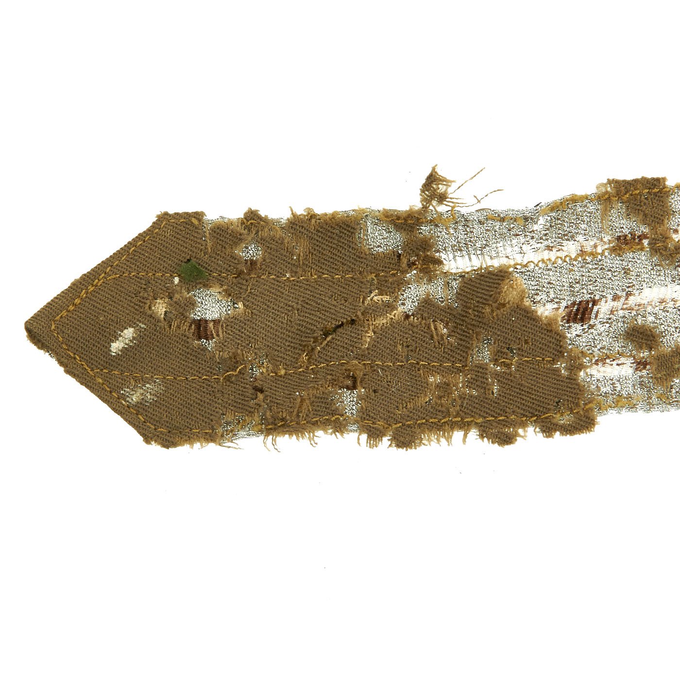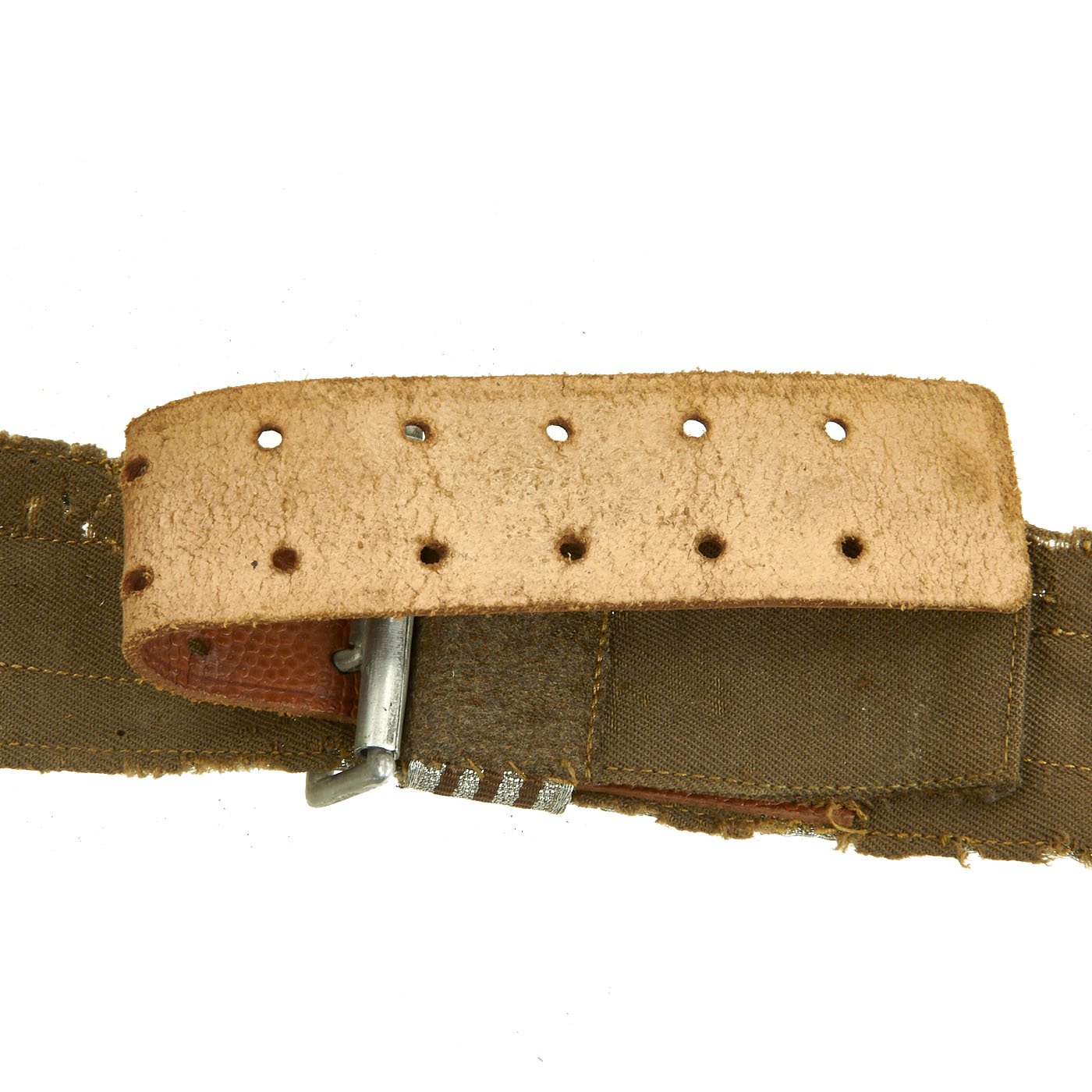 The buckle is attached by a double square ring to a woven bright silver/aluminum construction brocade belt. The belt pattern has three horizontal lines, and the two sliding vertical loops have the same pattern. These help hold the belt ends in place. The reverse is lined in a nice Green Field Gray fabric, and the length is adjusted with a hook that fits into eyelets on the left side of the belt. Unfortunately, the belt itself has deteriorated significantly since WWII. This looks to be a combination of wear, storage issues, and mothing. Wool was a very common component of these belts, and if improperly stored for a long period, it can deteriorate as well as suffer damage from clothing moths. The original green fabric of this example is now a more brown color, indicating it was probably stored for a long time in a hot attic.