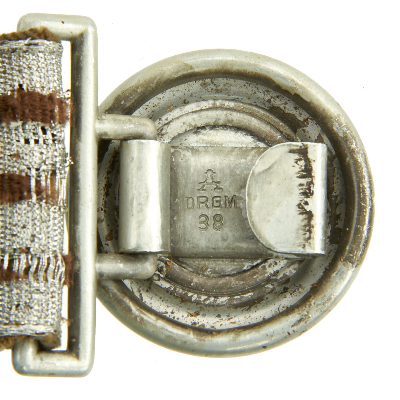 The back of the buckle clip is marked with the "barred A" trademark logo of F. W. Assmann & Söhne of Lüdenscheid, a large maker of belts, buttons, and other accoutrements. Below this is the DRGM marking, indicating it is a trademarked design, and 38. for the year of manufacture. The buckle is in good shape, with light wear, and clear frosting, and the opposing clasp is just as nice.