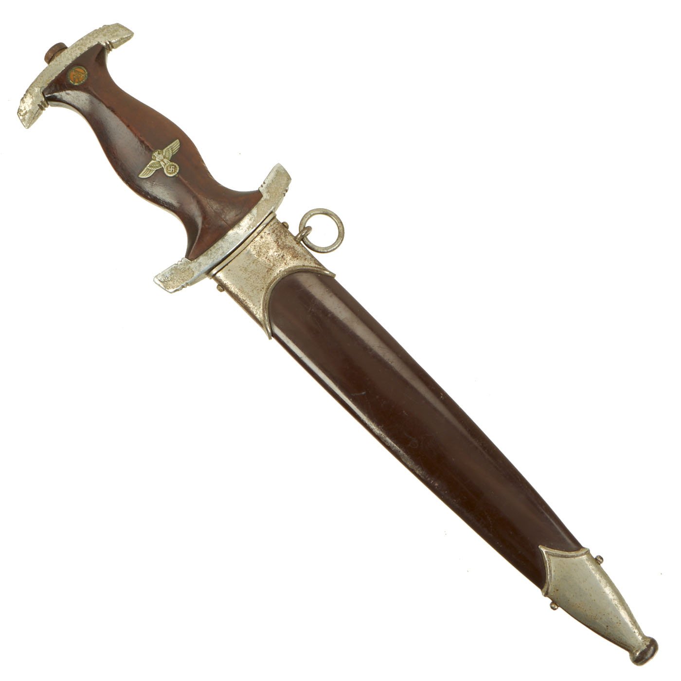 The SA or Brown Shirts, were a private political formation which Adolf AH and the NSDAP used to maintain order at organized Party meetings and demonstrations. The group was formed in 1921, and grew to a huge force of nearly 3,000,000 men by the later 1930's. To instill esprit de corps, as well as create employment for the Blade City of Solingen, it was decided each SA man would carry a dagger with his Brown Shirt uniform. Huge quantities needed to be produced to accommodate the demand. The dagger initially was produced of hand-fitted nickel mounts with attractive finished wood grip and brown anodized (a bluing process) finished scabbard.
