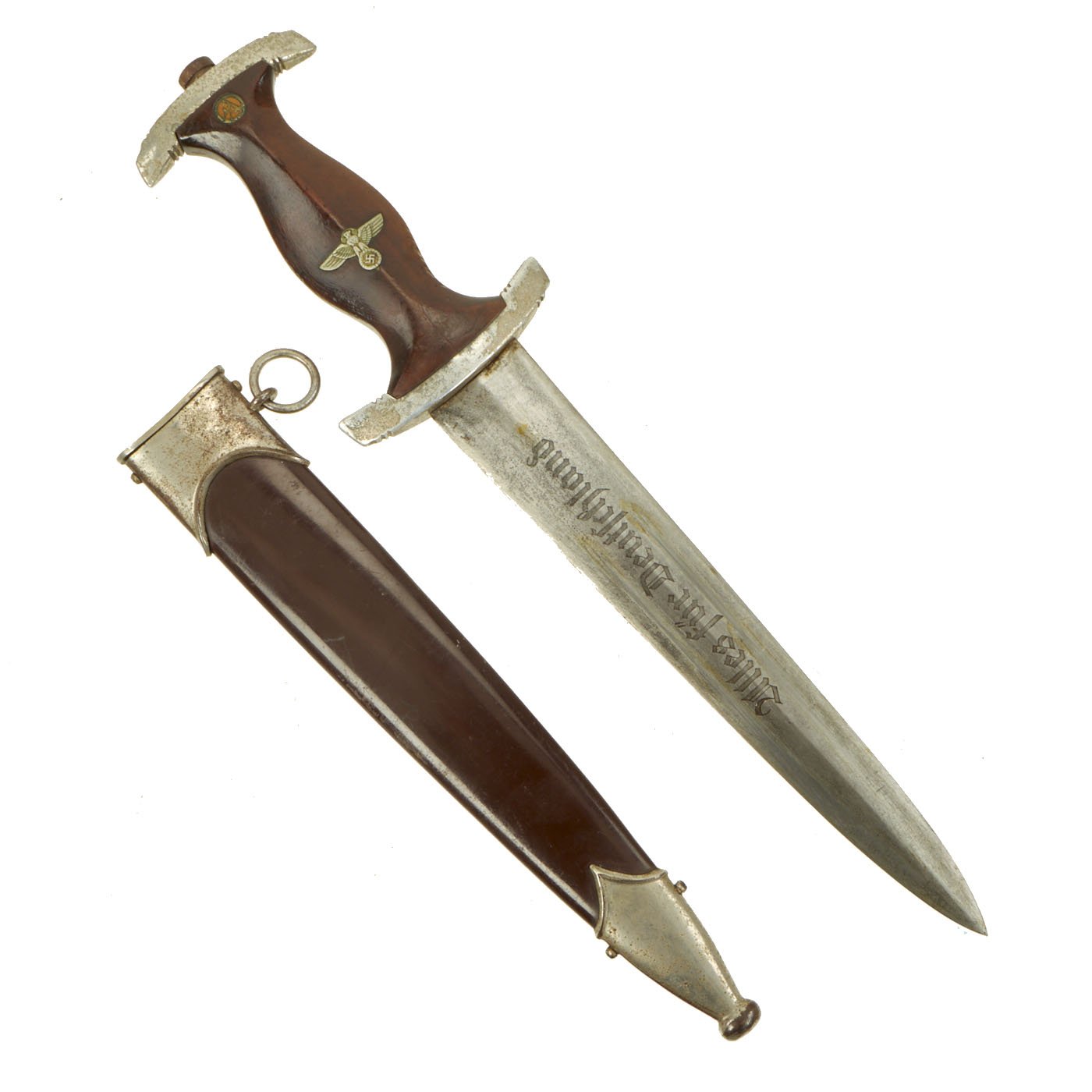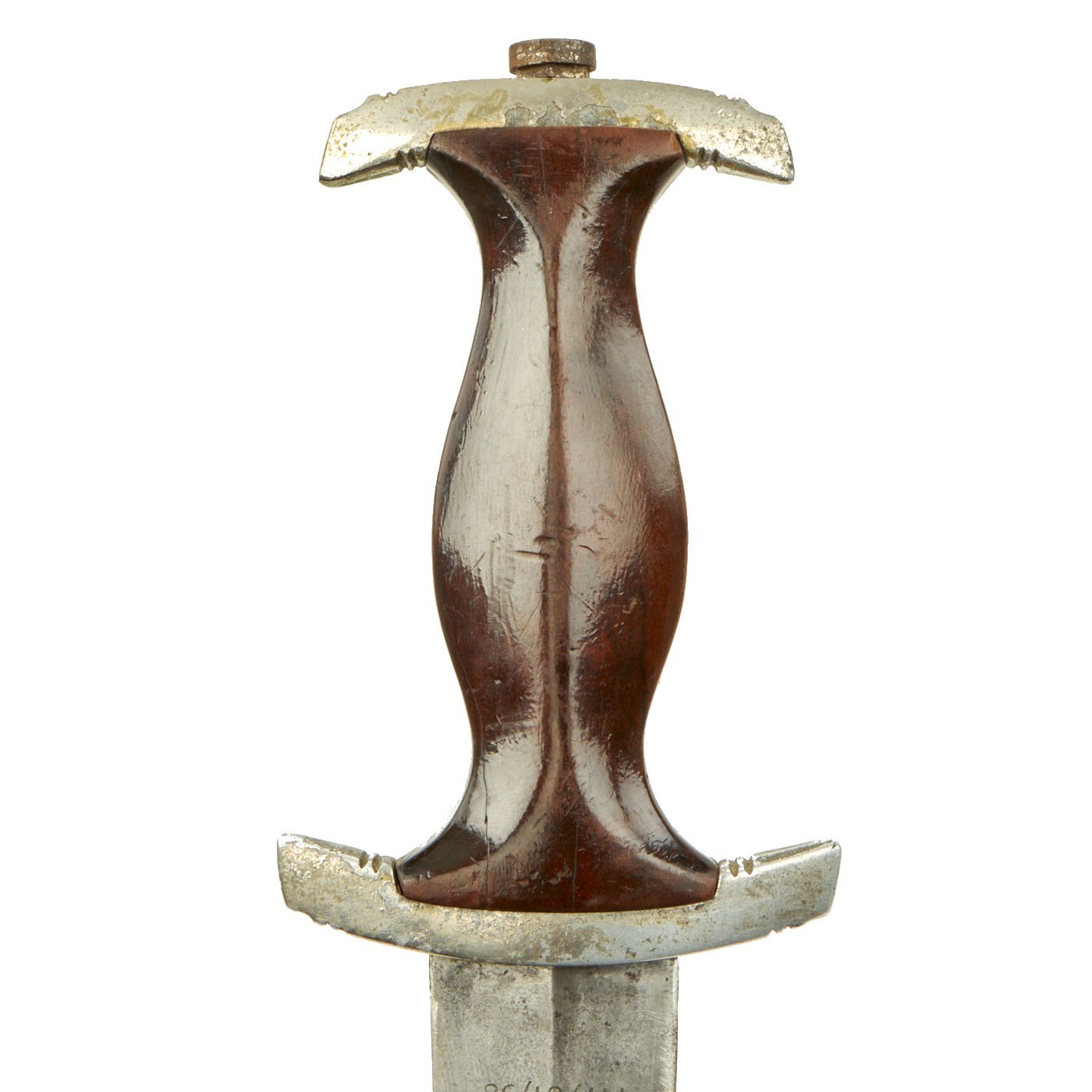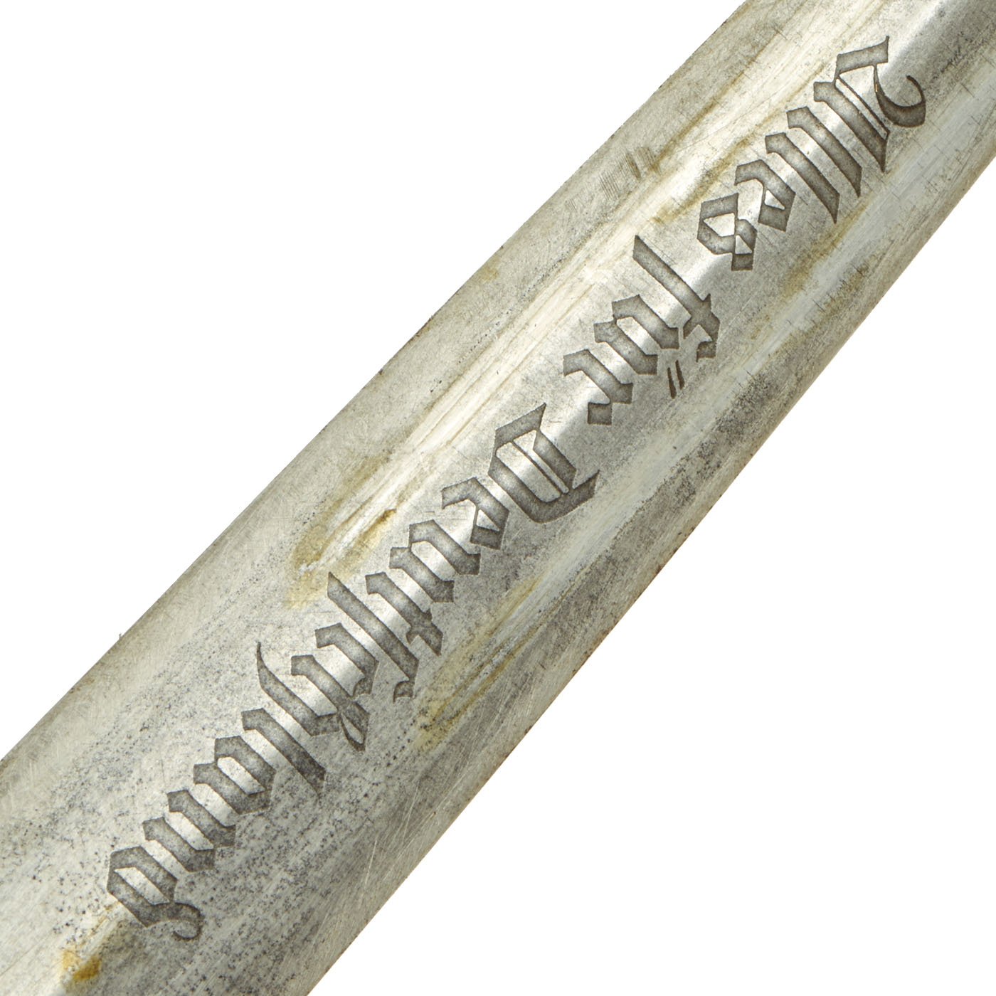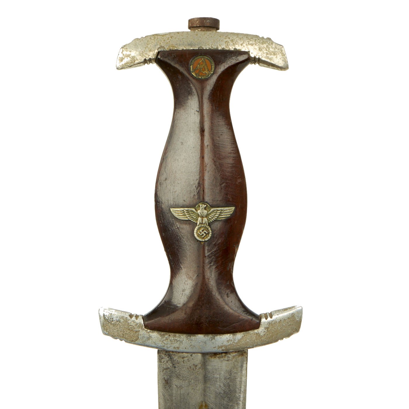 The blade was etched with the SA motto, Alles für Deutschland. Examples produced prior to 1935 were stamped with the German sector of the SA group on reverse lower crossguard. Later examples underwent standardization through the RZM ministry. These pieces were produced of cheaper plated zinc-base fittings and scabbards were simply painted brown.