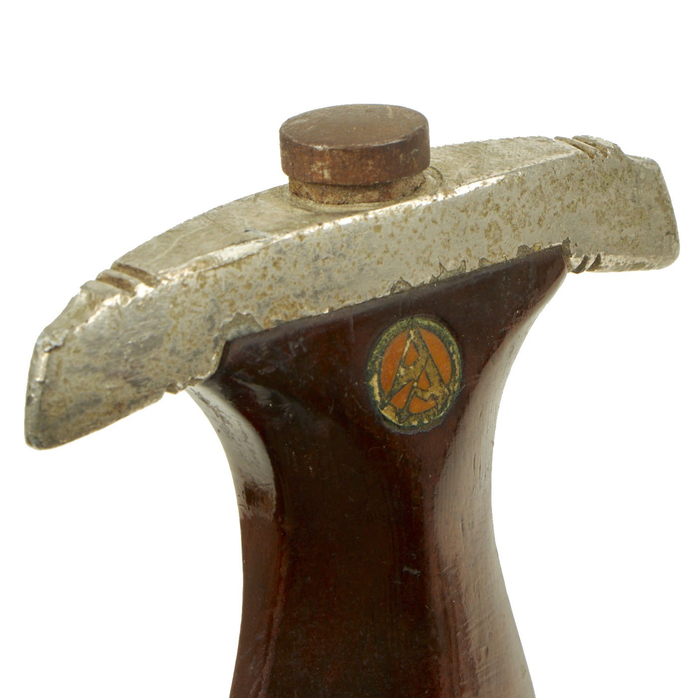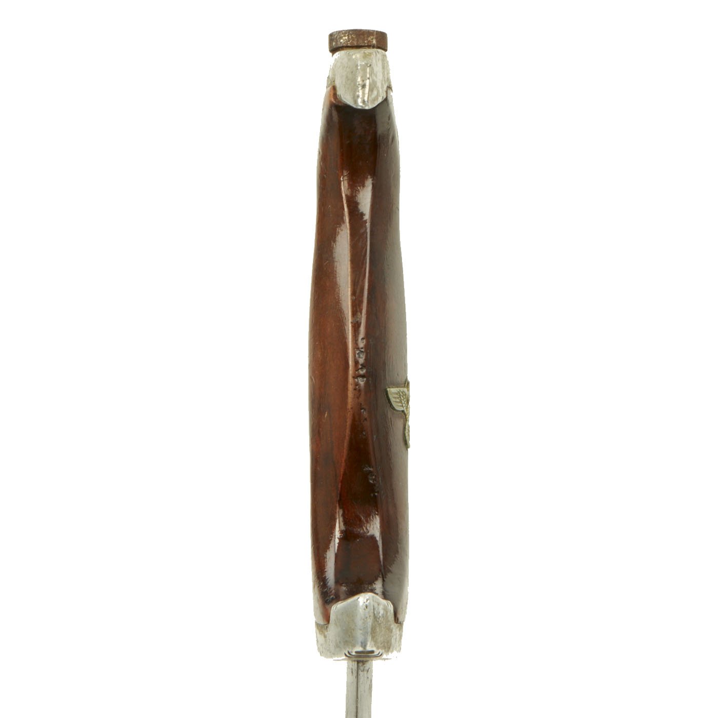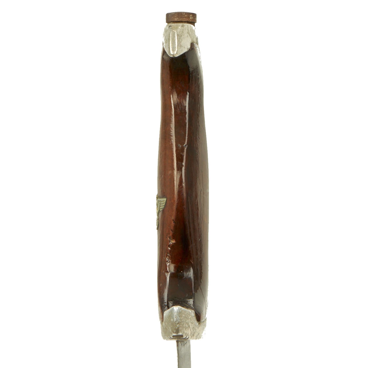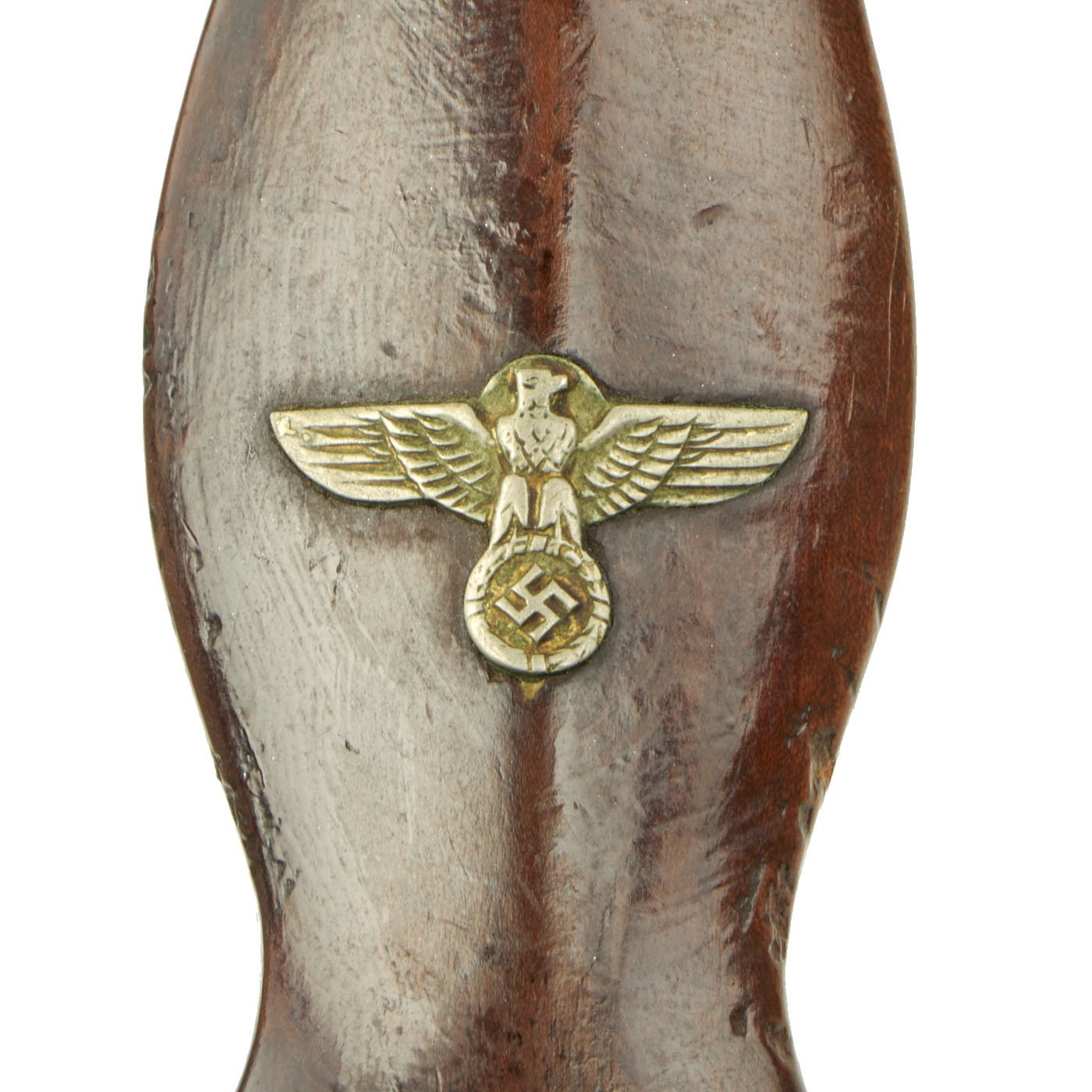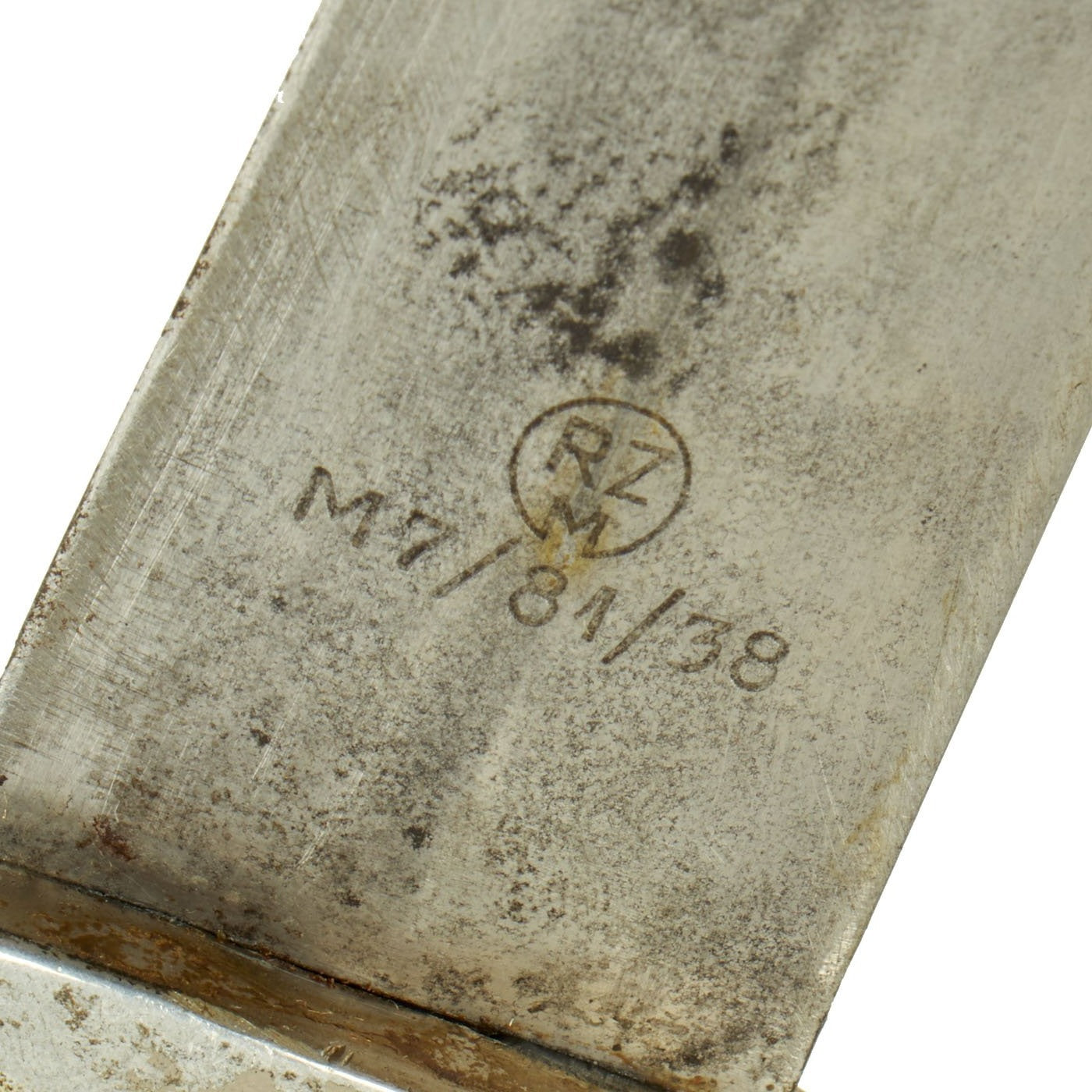 This marking indicates the dagger was made by RZM Dagger contractor "81", which records show is the rare maker Karl Tiegel, Tiegelwerk (Tiegel Works), located in Riemberg, then part of the Schlesien Bezirk (Silesian District) Breslau. Post-war this area was returned to Poland, and is now known as Rościsławice, and is part of the Lower Silesian Vovoidship. Tiegel also operated a depot in Solingen-Gräfrath, part of the legendary "City of Blades" in western Germany. Per J. Anthony Carter's fine work GERMAN SWORD AND KNIFE MAKERS, this metalworking business was first founded in 1877 to produce butchers' kitchen and professional knives. They produced some SA and NSKK daggers during WWII, first with their own trademark during the early years, and later with their RZM code during the 1938-1940 period. This is the only example of a Karl Tiegel edged weapon that we have ever seen, and the firm is assumed to have been abandoned and probably destroyed during the Russian advance in 1945.