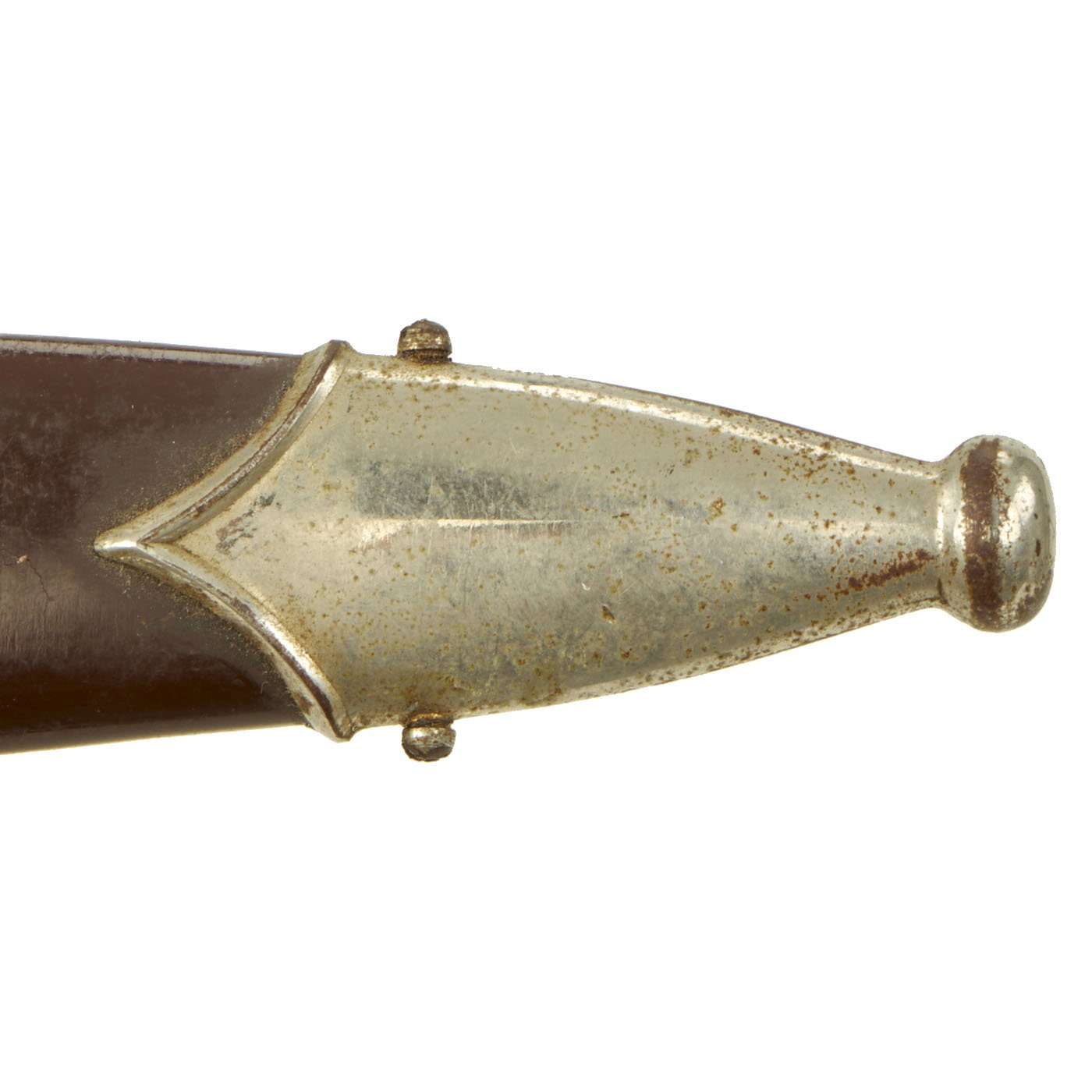 The scabbard shell is straight throughout and has very good original brown enamel paint. It has just a bit of scuffing and the usual crazing in the finish, with only small areas of finish loss. The scabbard shell is equipped with matching plated steel mounts, which are in good condition overall, with some light wear and oxidation.. There is some very light denting of the ball on the chape, which is typical. They nicely match the crossguards and are complete with all four dome head screws, though the lower screws have definitely had the heads damaged a bit.