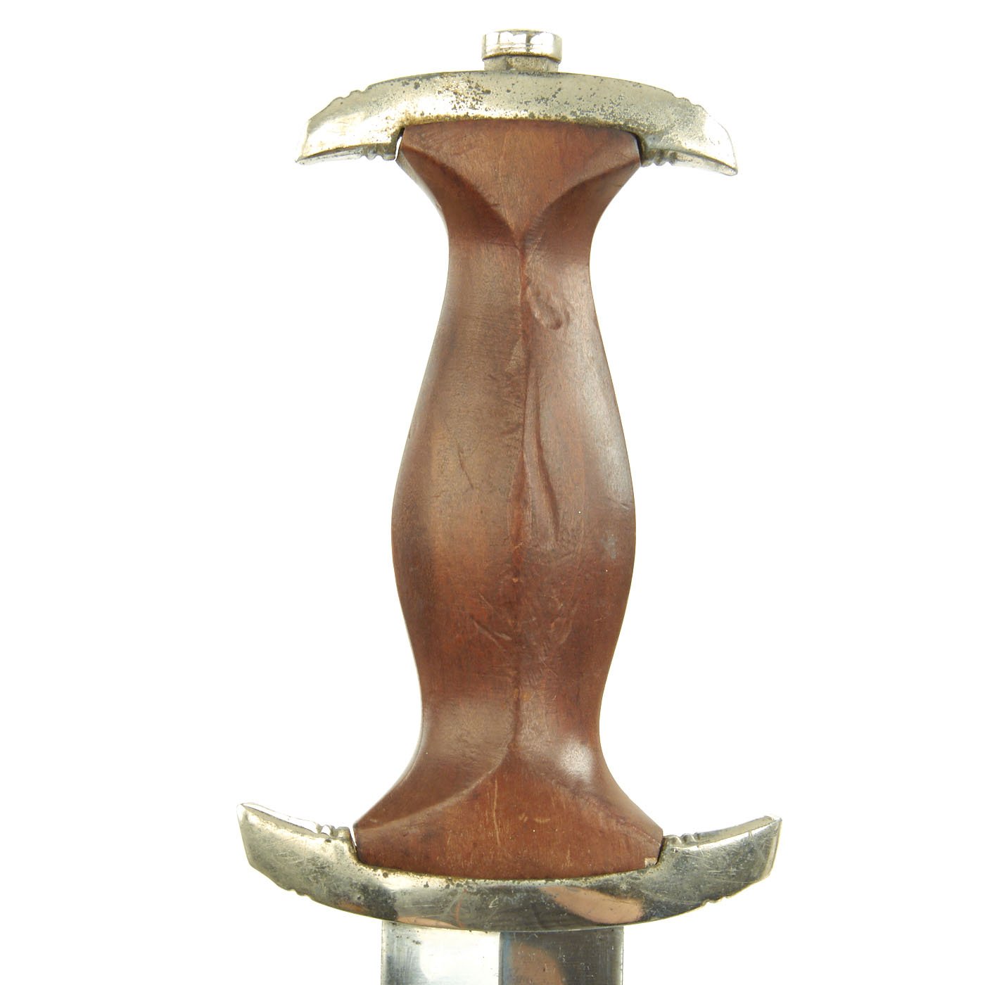 Original Item: Only One Available. This excellent condition mid-war period produced SA Dagger has nickel-plated fittings throughout. The crossguards and tang nut are nickel plated aluminum, and have about 75% of the plating intact, with some plating flaking and oxidation in areas. There is some oxidation where the grip wood meets the guards, which is typical. There is not any major chipping or dents in the fittings, just the usual effects of age.