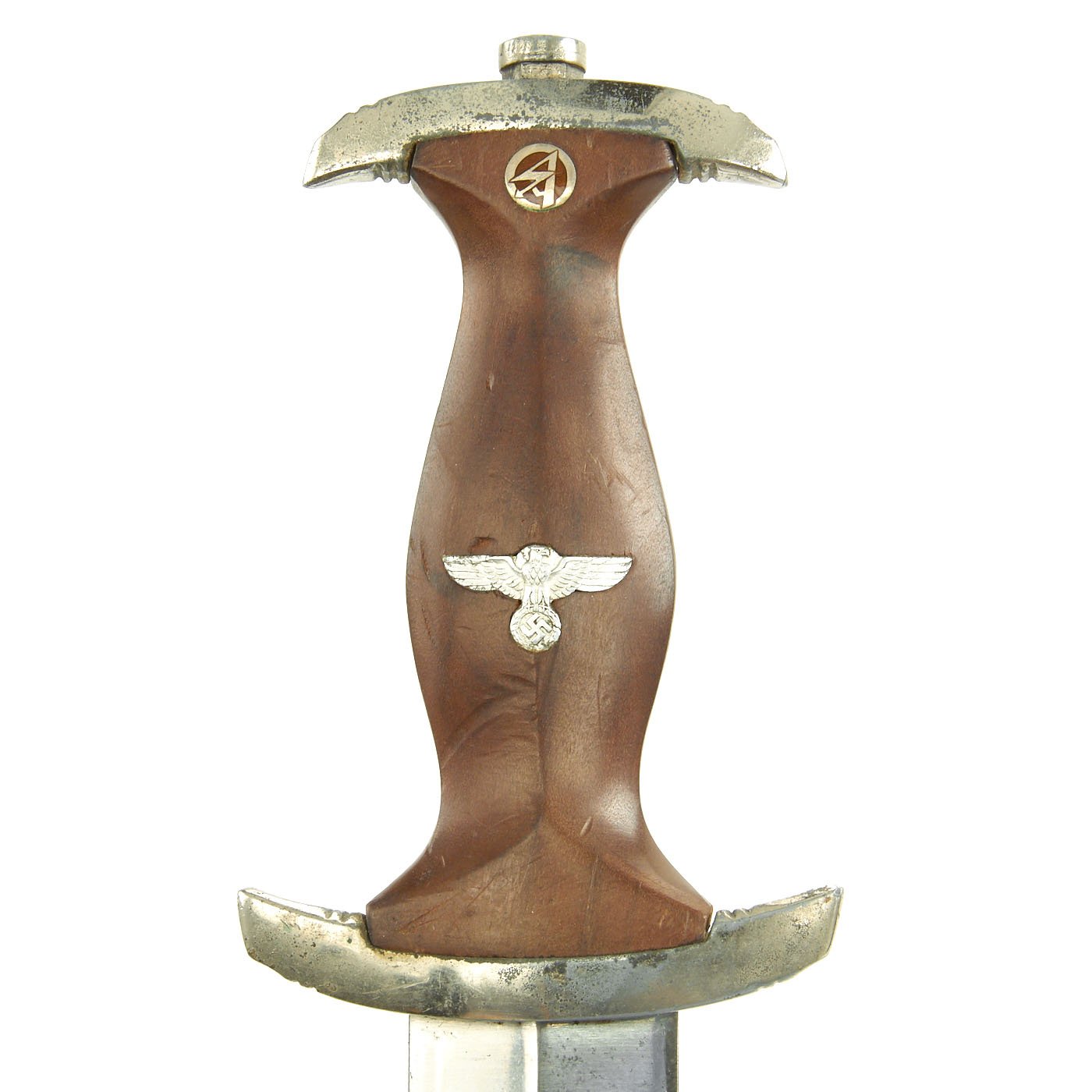 The SA or Brown Shirts, were a private political formation which Adolf AH and the NSDAP used to maintain order at organized Party meetings and demonstrations. The group was formed in 1921, and grew to a huge force of nearly 3,000,000 men by the later 1930's. To instill esprit de corps, as well as create employment for the Blade City of Solingen, it was decided each SA man would carry a dagger with his Brown Shirt uniform. Huge quantities needed to be produced to accommodate the demand. The dagger initially was produced of hand-fitted nickel mounts with attractive finished wood grip and brown anodized (a bluing process) finished scabbard.