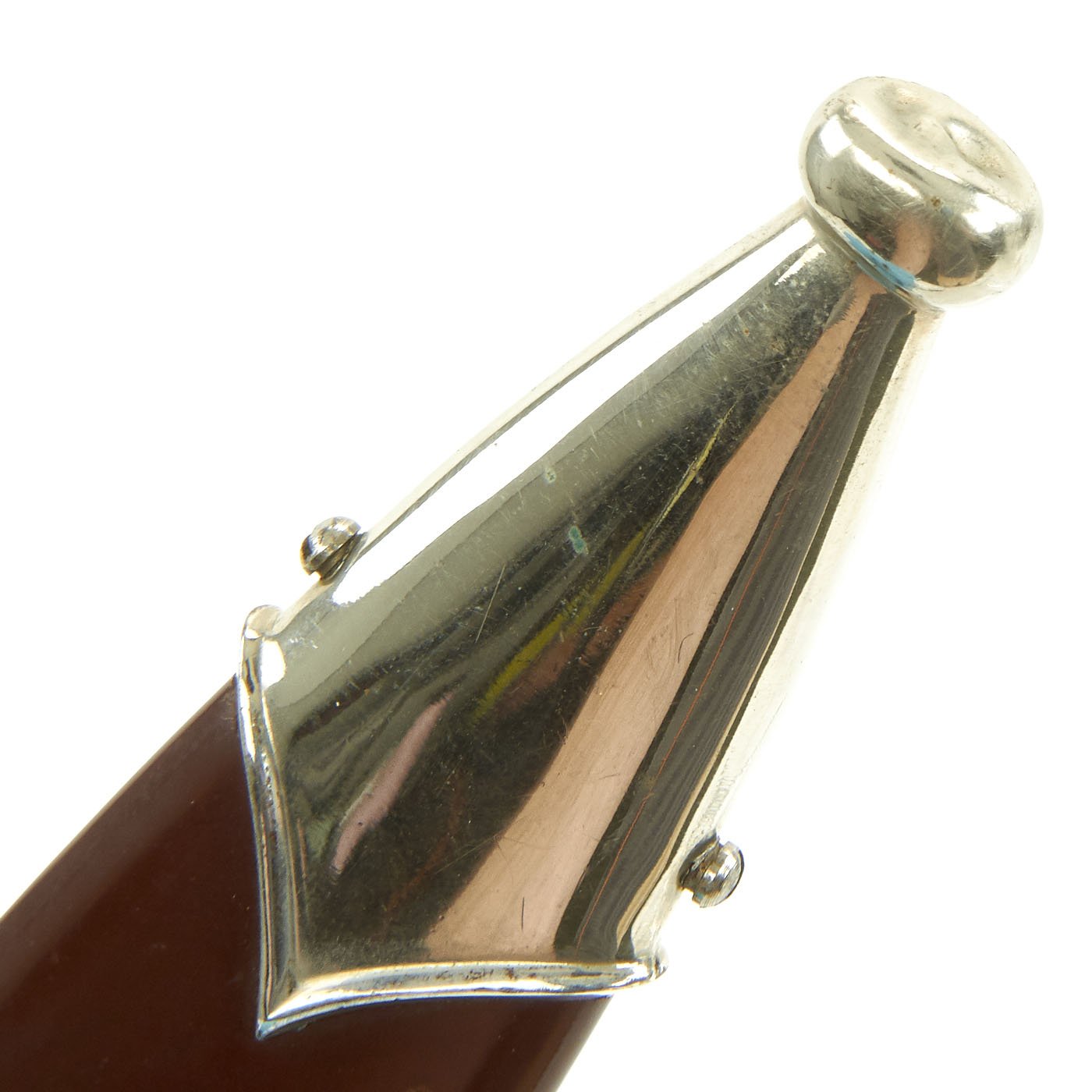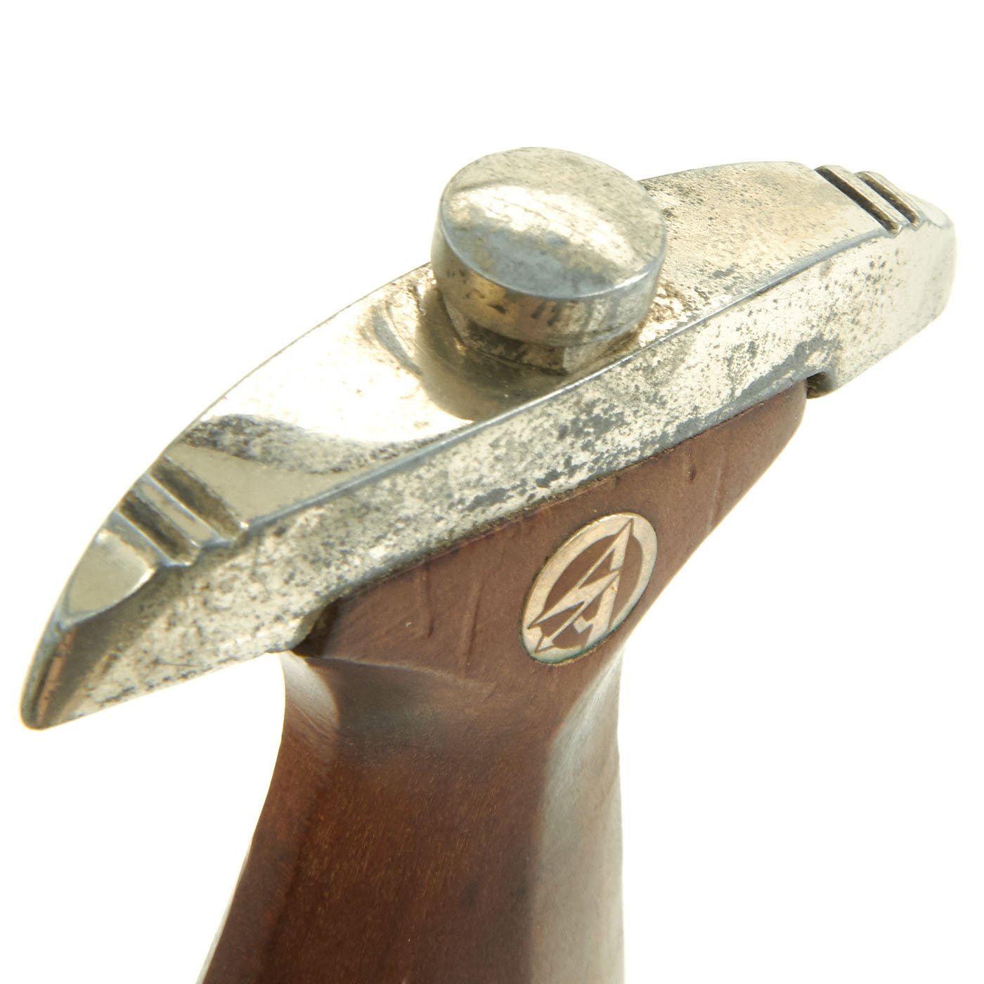 The grip is a fine product having a nice red mahogany tone in the surfaces and having medium center ridge construction. This grip is in very good condition with great grain, and fits the crossguards well. The symbol button is nicely set having fully intact translucent enameling, and the plating intact with just a bit of verdigris. The details are still there to the inlaid aluminum eagle, including the beak, breast feathering, wing feathering, talons, wreath and mobile swas.