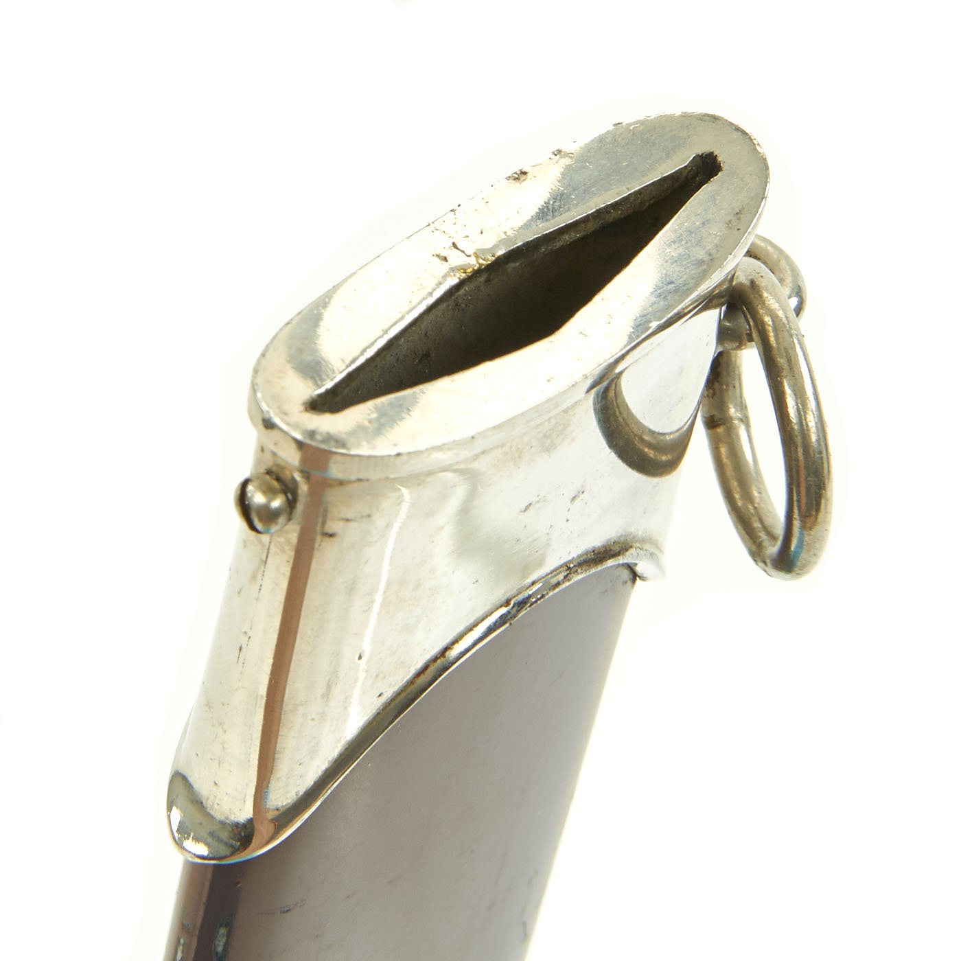 The scabbard shell is straight throughout and has good original brown paint. It has a few chips, but does not look to have been repainted at any time. The scabbard shell is equipped with fine matching nickel-plated steel mounts. These mounts are in very good condition overall, with only light denting to the lower ball. They nicely match the crossguards and are complete with all four dome head screws. This really is a nice solid scabbard.