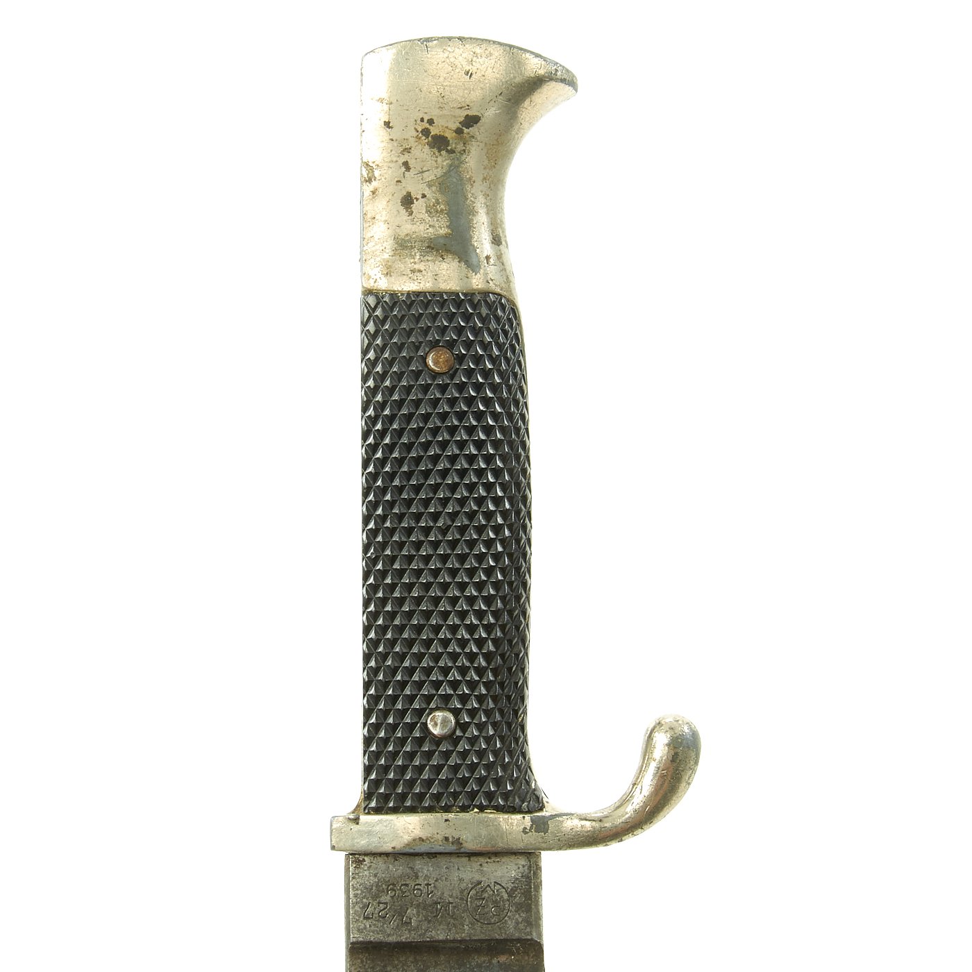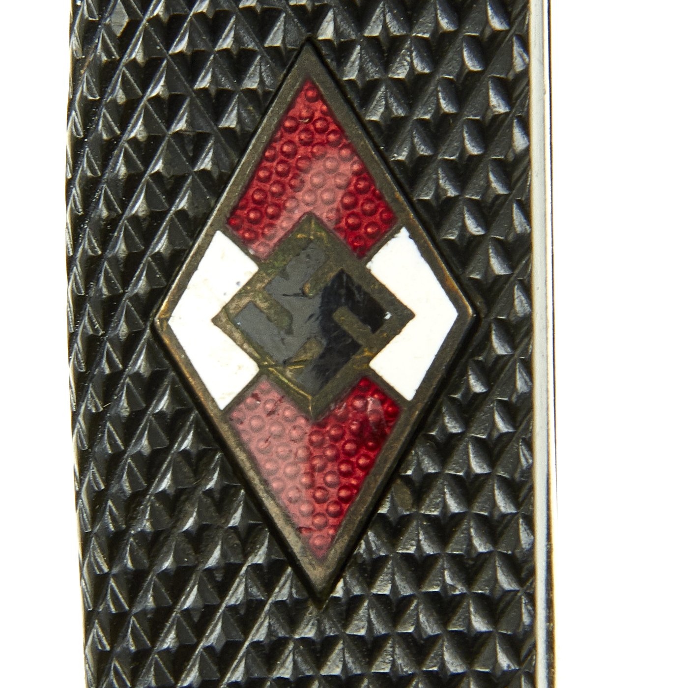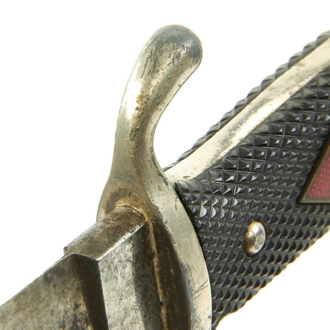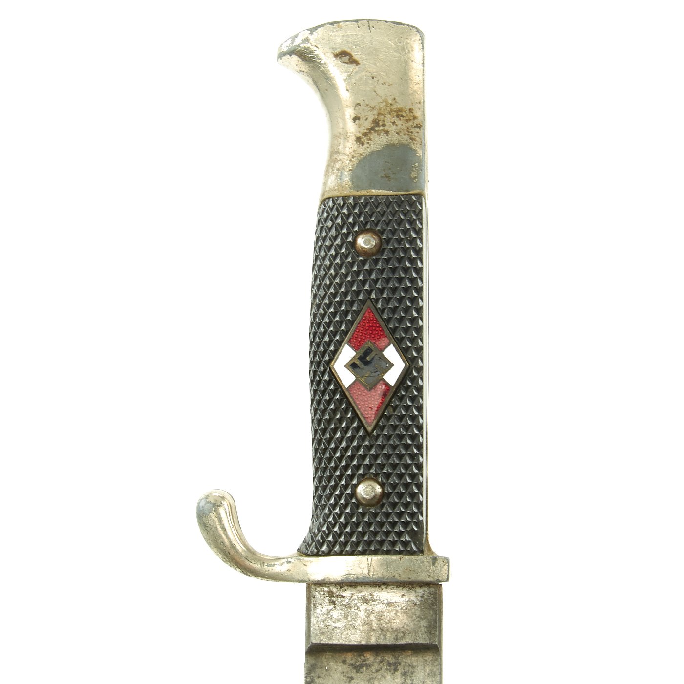 These knives were given to boys who were educated in the paramilitary organization, which they often continued to carry into their military service. Unlike the early pattern knives, these have a thicker blade with a raised ricasso, which significantly strengthened the blade. They also do not have the HJ motto etched on the blade, and often are marked not with a maker, but a German RZM Code.