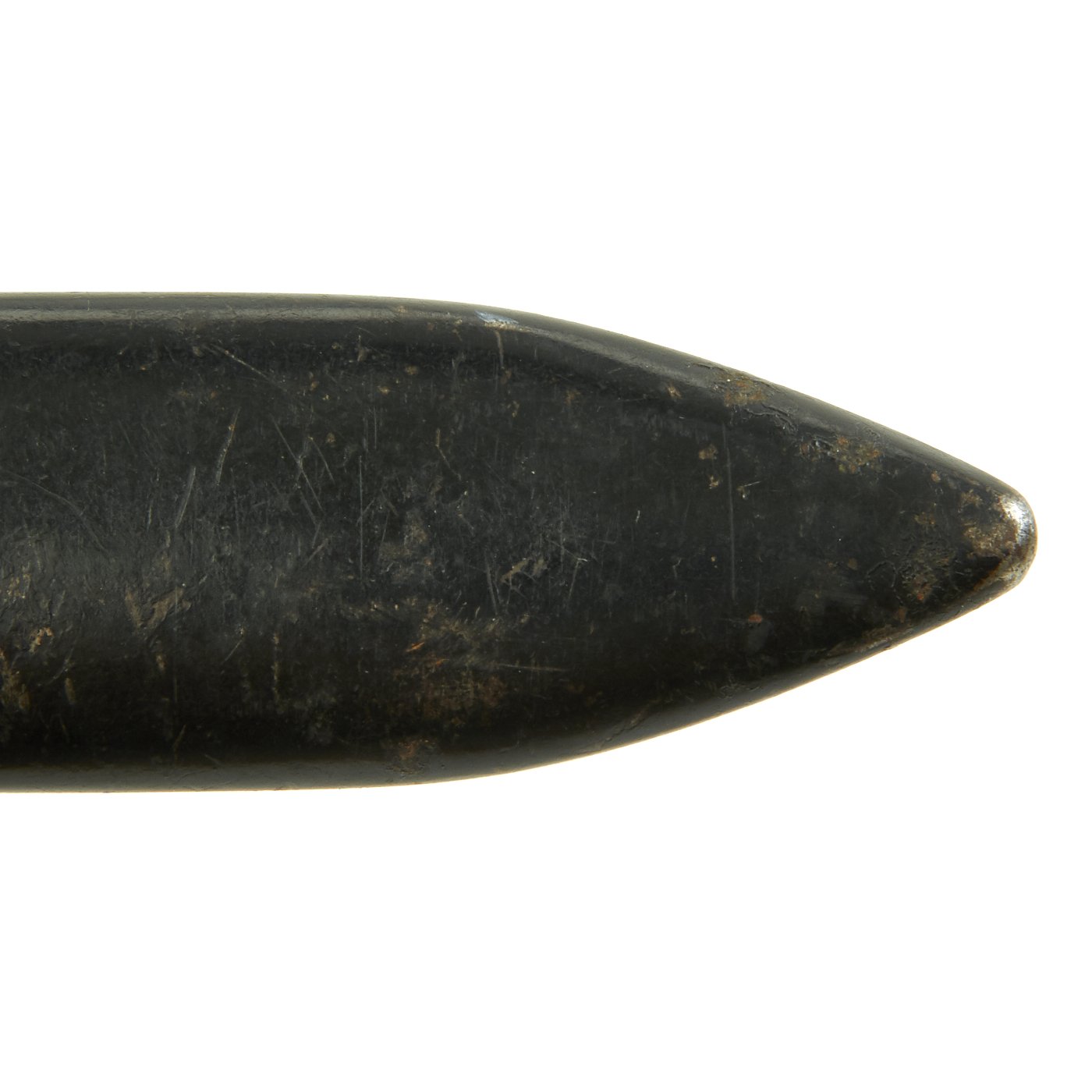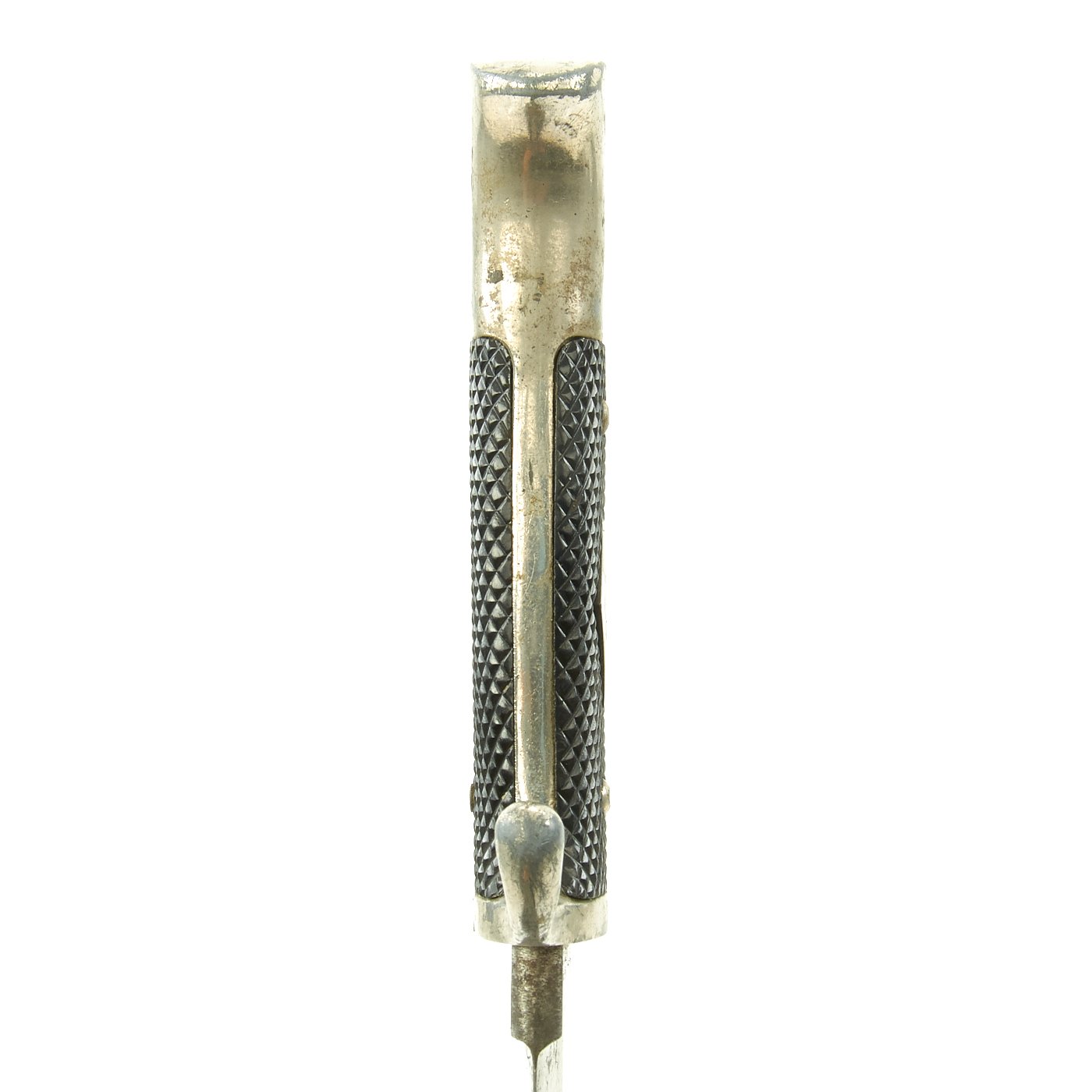 The hilt has about 75% of the original nickel plating remaining, with some areas where the base metal is exposed. The grip plates are the black checkered bakelite variety and are in very good condition, with just a bit of wear. They are retained by steel nickel plated rivets with dressed obverse heads, which have lost their plating. The enamel grip insignia retains very bright colors and has a clean surface, with almost completely intact enamel. The plating has worn off the insignia, and the brass has faded to a nice patina. It is loose in the grip plate, as the bakelite can shrink, but this also confirms authenticity.
