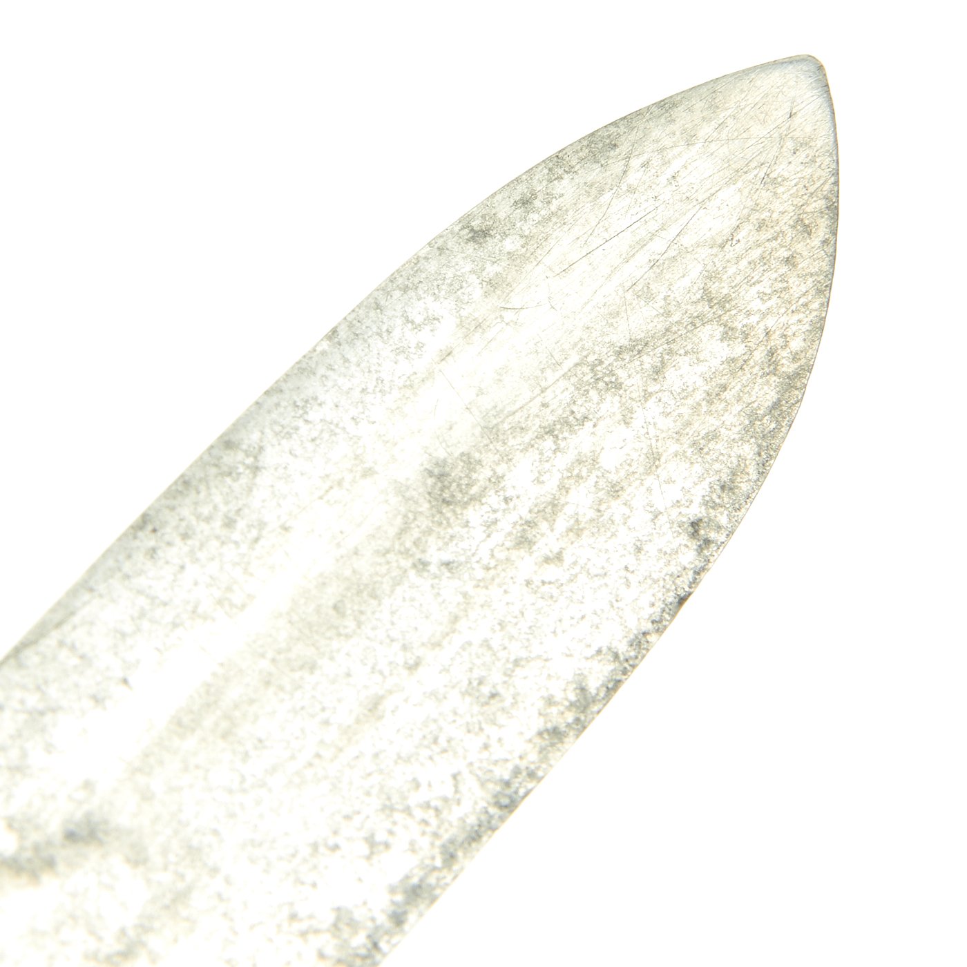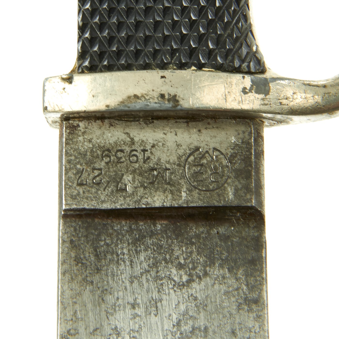 The blade of this example is in very good condition, without the oversharpening often seen. There is some light staining and damage to the edge as shown. This could be early sharpened out, however that would lose part of the lovely patina this item has. The original leather blade buffer is missing. The reverse ricasso is stamped with an ((RZM)) circle, next to code M7/72 over date 1939.
