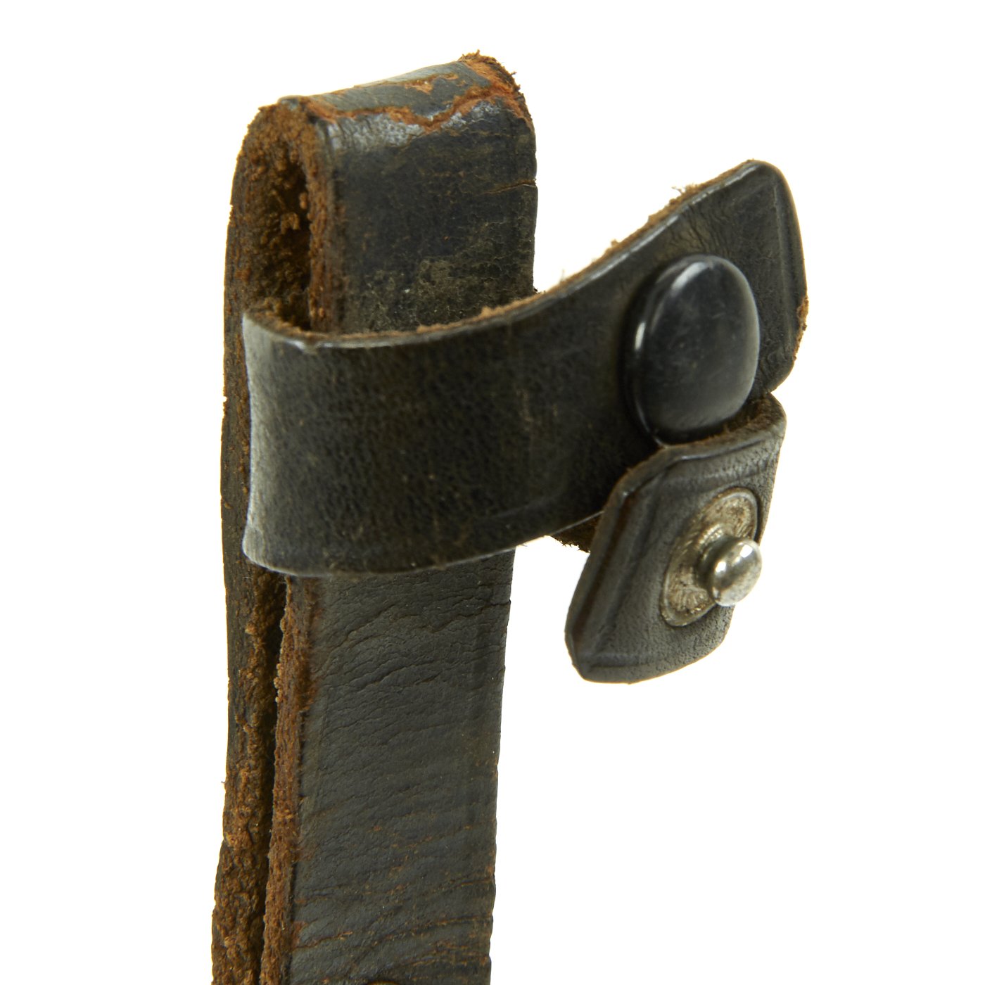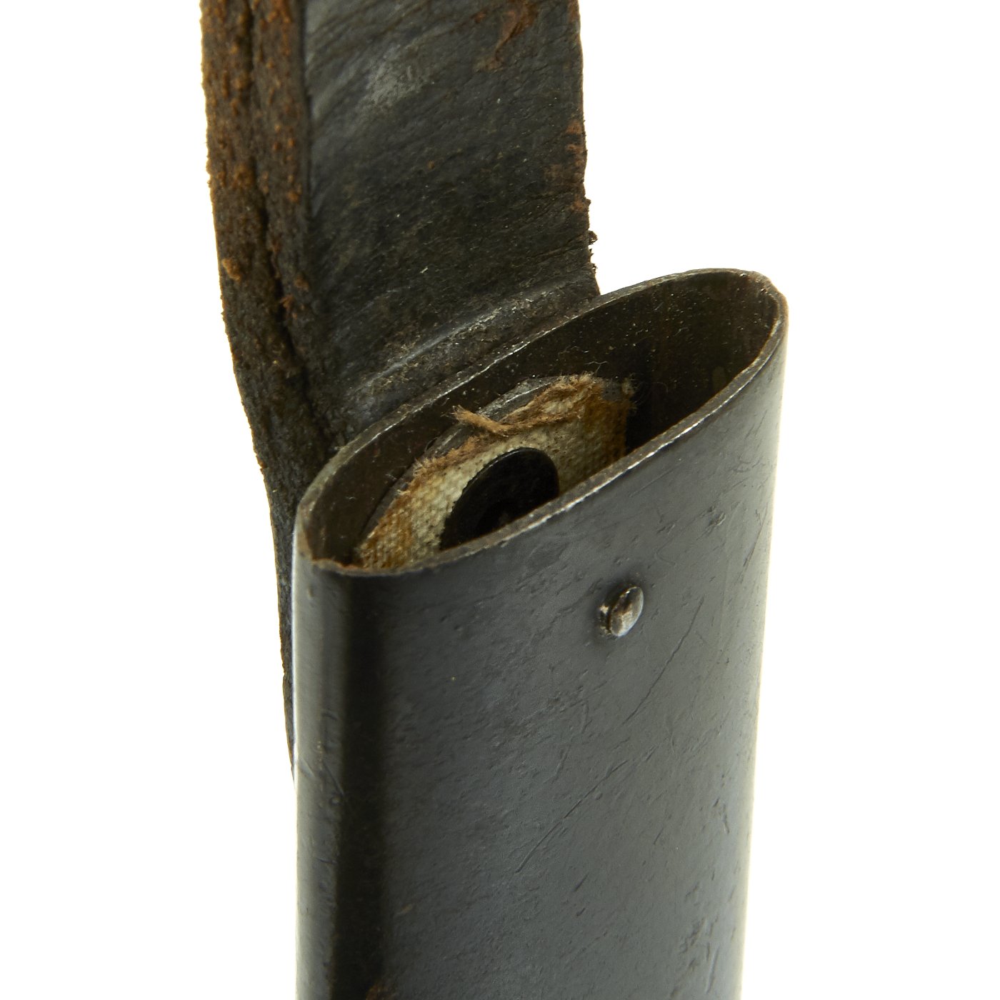 The scabbard is completely straight throughout with no dents, and still has over 90% of the black enamel intact. There is the expected checking and crazing, as well as some chipping. The belt loop is black finished leather, with most of the original finish present, and some cracking. The securing strap is intact, and still snaps securely.