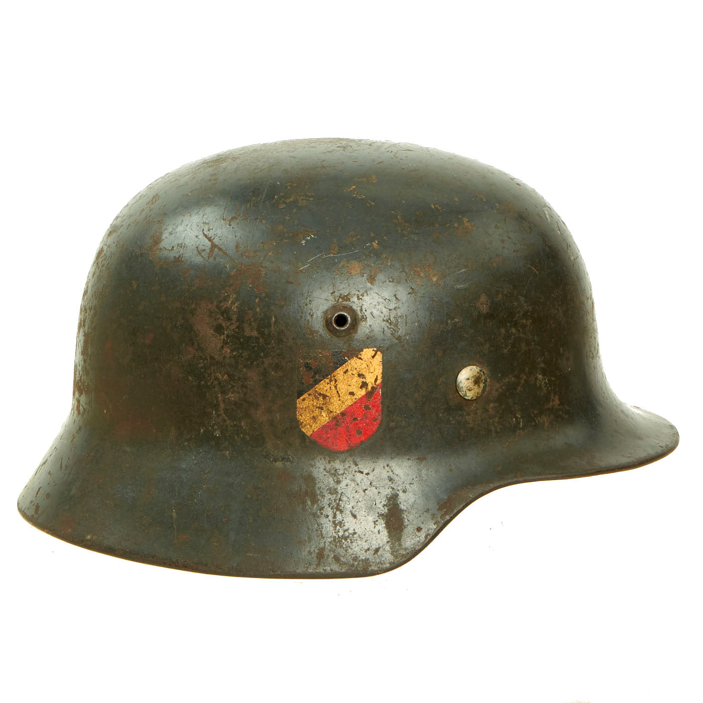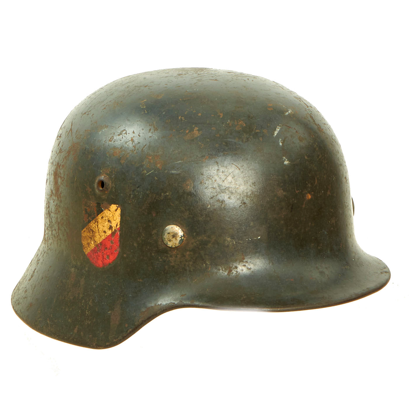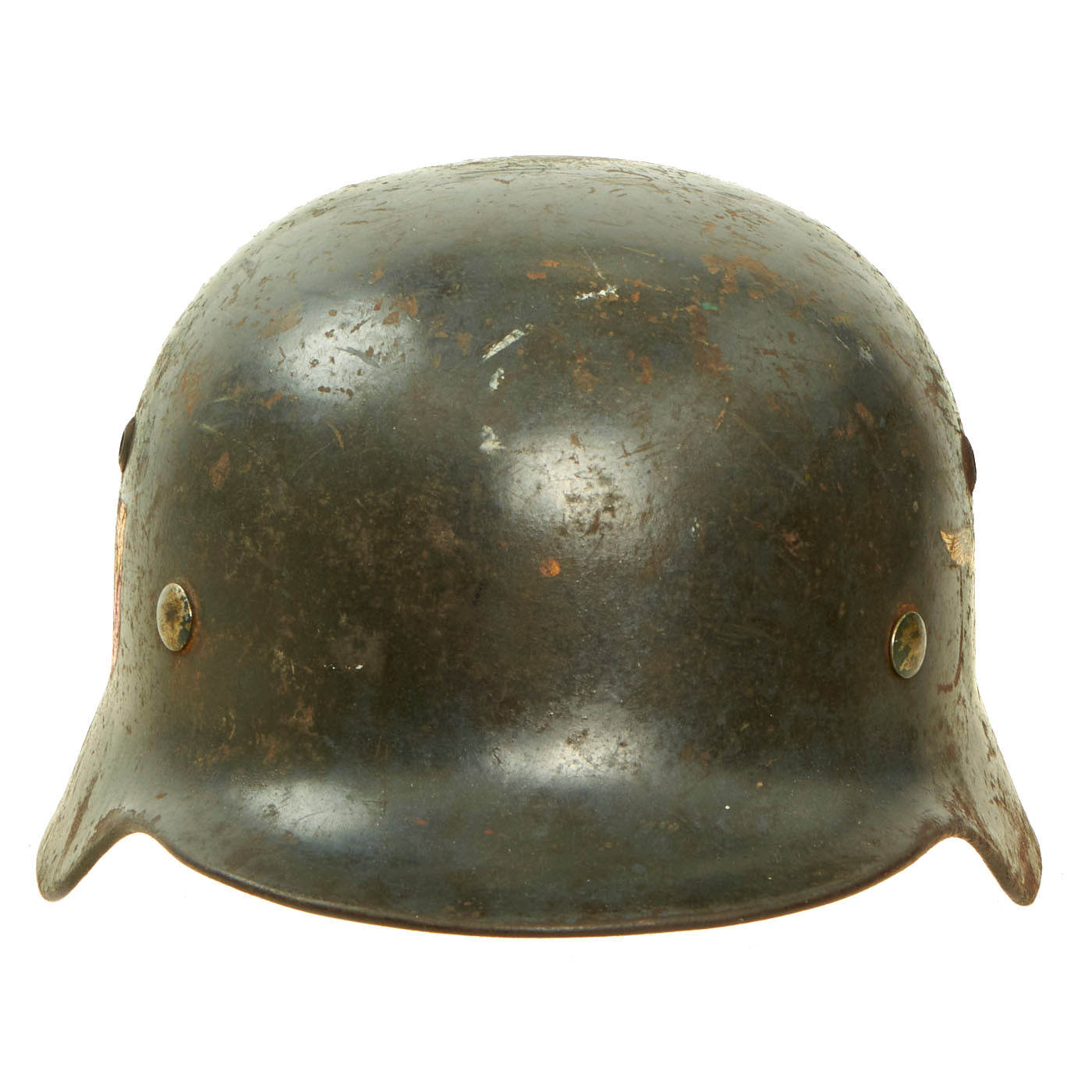 Original Item: Only One Available. This is a very nice all original Model 1935 German WWII "double decal" helmet, showing some fantastic period wear! It features a Luftwaffe Eagle decal on the left side, and a "National Colors" decal on the right. The use of the second decal was discontinued in 1940, and in 1943 it was ordered that helmets with the national colors have them removed, so finding a helmet with both still intact is a real treat!