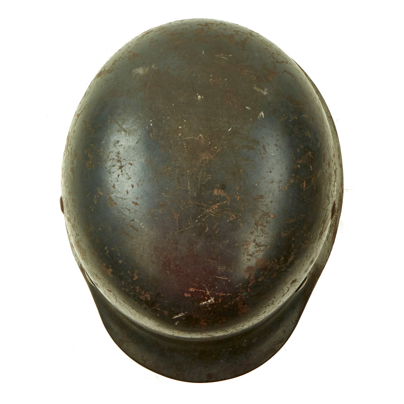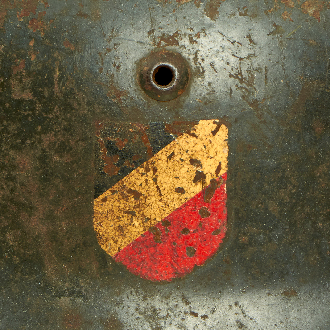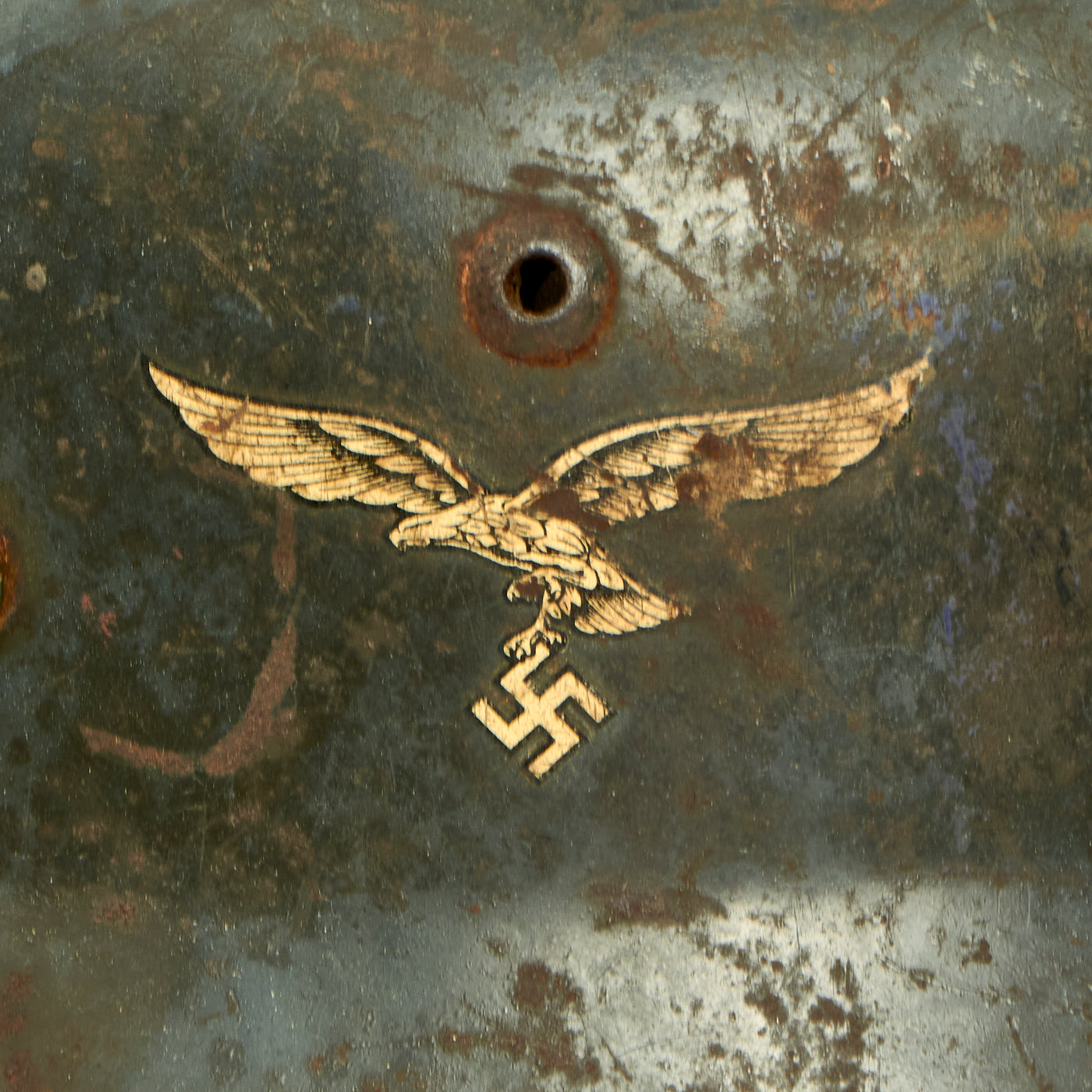 This stamped sheet steel construction helmet retains about 75% of the original correct smooth blue-gray Luftwaffe fliegerblau (flyer's blue) used on early helmets, which would later become textured, and is in good condition overall. There are are scrapes and scuffs through the paint, and overall wear consistent with long service, but no major damage. There is scattered light rust on the exterior, as well as the interior. The National Colors decal is retained at about 75%, with checking from age and some wear, as well as some chips and scrapes. The Luftwaffe decal is retained at about 80%, with wear and flaking, and some scrapes, which have removed part of the eagle's left wing. They have a lovely service worn look.