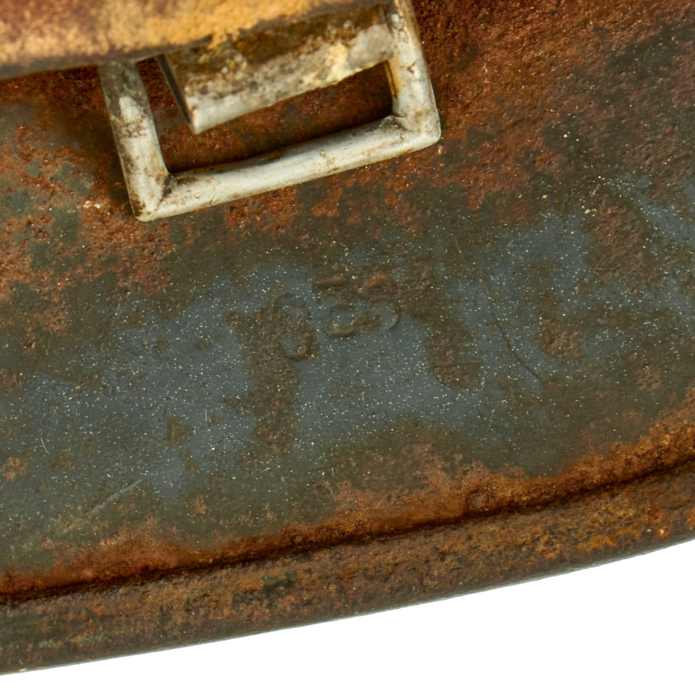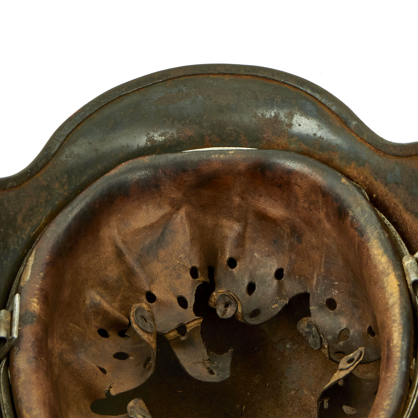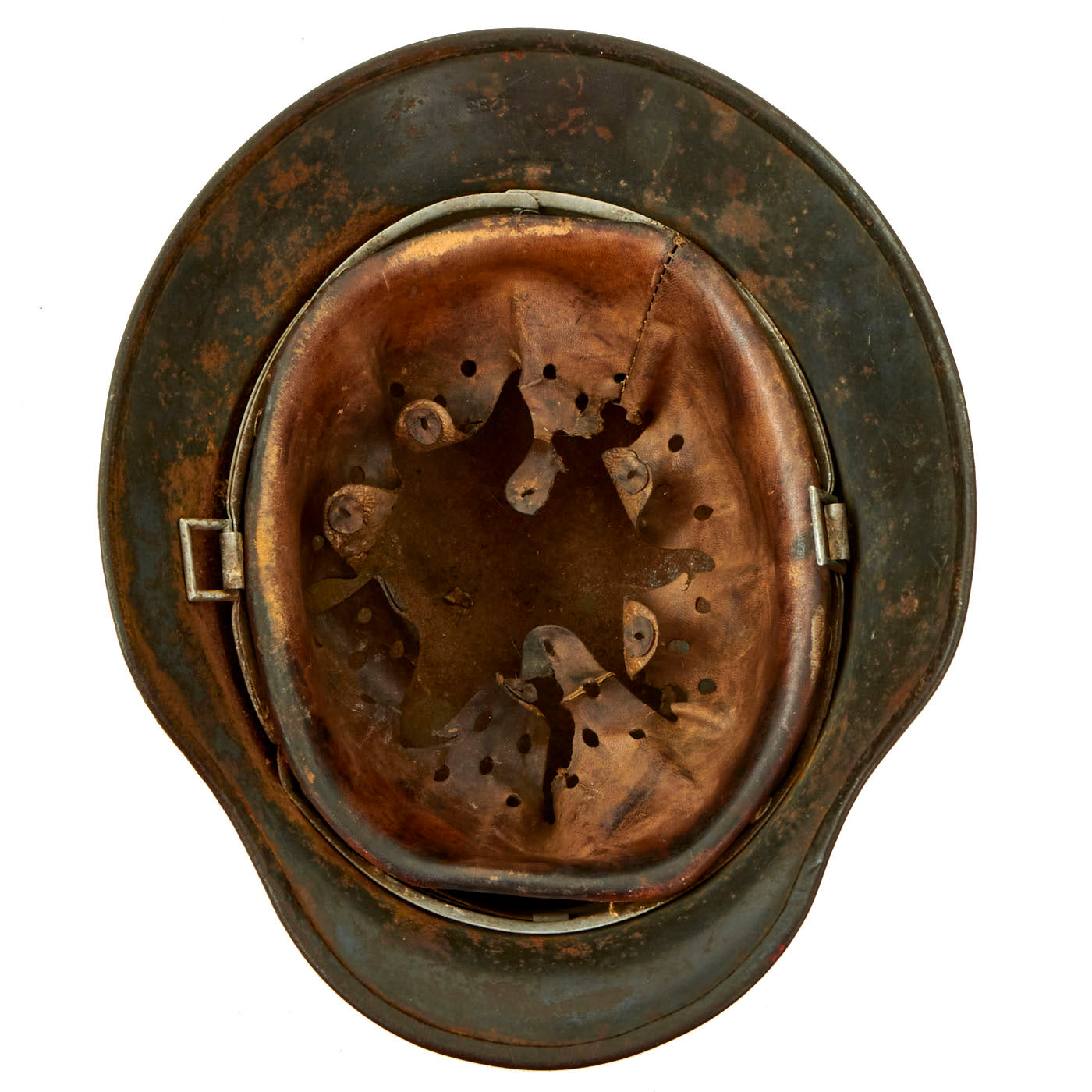 This stamped sheet steel construction helmet retains about 75% of the original correct smooth blue-gray Luftwaffe fliegerblau (flyer's blue) used on early helmets, which would later become textured, and is in good condition overall. There are are scrapes and scuffs through the paint, and overall wear consistent with long service, but no major damage. There is scattered light rust on the exterior, as well as the interior. The National Colors decal is retained at about 75%, with checking from age and some wear, as well as some chips and scrapes. The Luftwaffe decal is retained at about 80%, with wear and flaking, and some scrapes, which have removed part of the eagle's left wing. They have a lovely service worn look.
