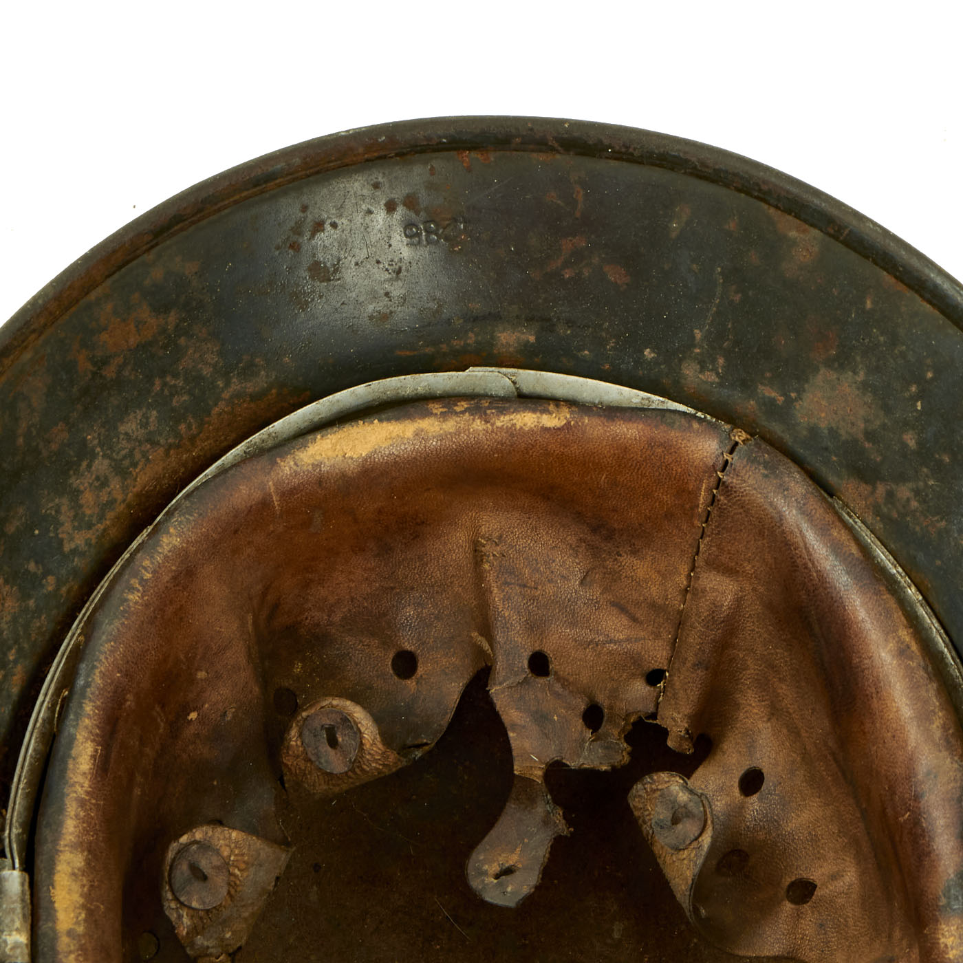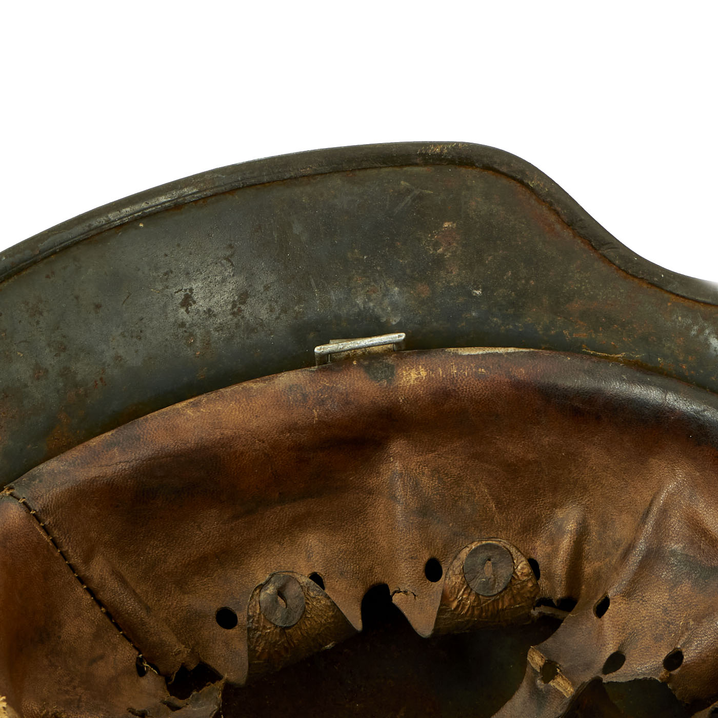 All three liner split pins are still intact, however they are nickel silver finished, so most of the original paint has worn away. The helmet still has its correct M31 liner with all of the 8 fingers present, however they are in delicate condition, cracked with two about to fall right off. The rest of the leather definitely shows wear. The liner band is aluminum, with square aluminum chin strap loops attached to reinforced sides. This is the last pattern before the move to galvanized steel bands, as even with the reinforced sides, the aluminum could bend, as it did on this example. The left exterior of the liner band is marked 64 n. A. / 56, indicating that it is a size 56 liner for a size 64 shell. The right side has the full maker information clearly stamped: