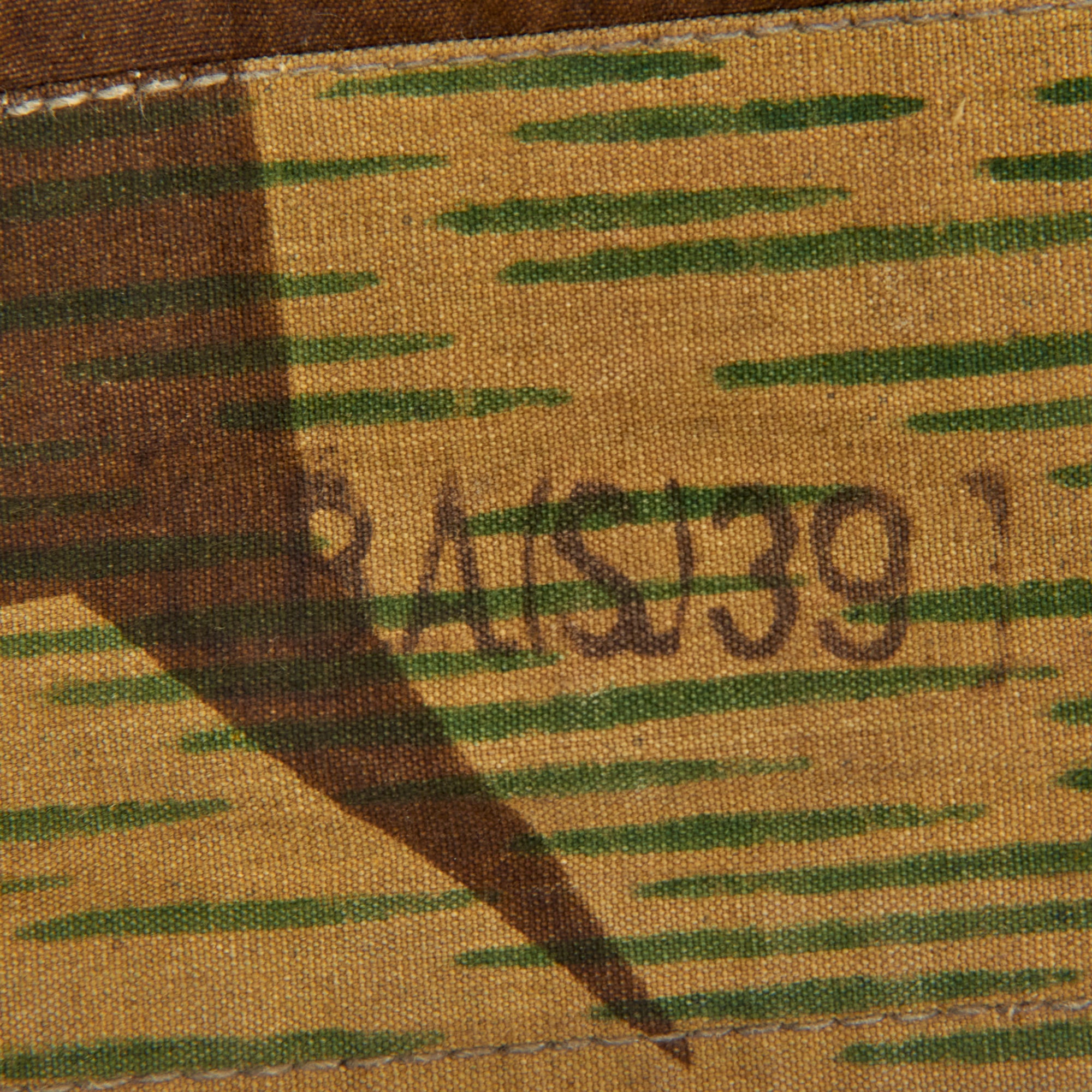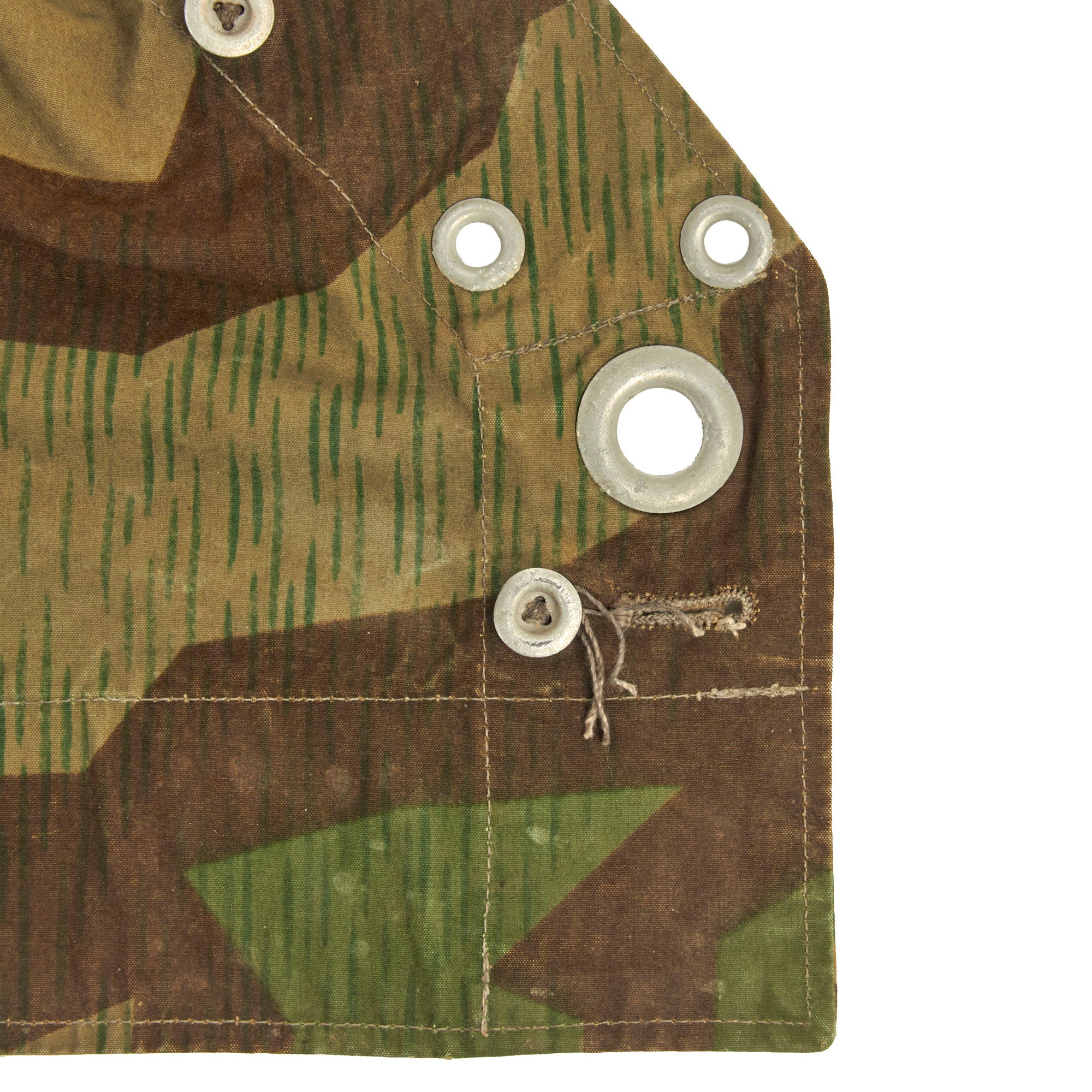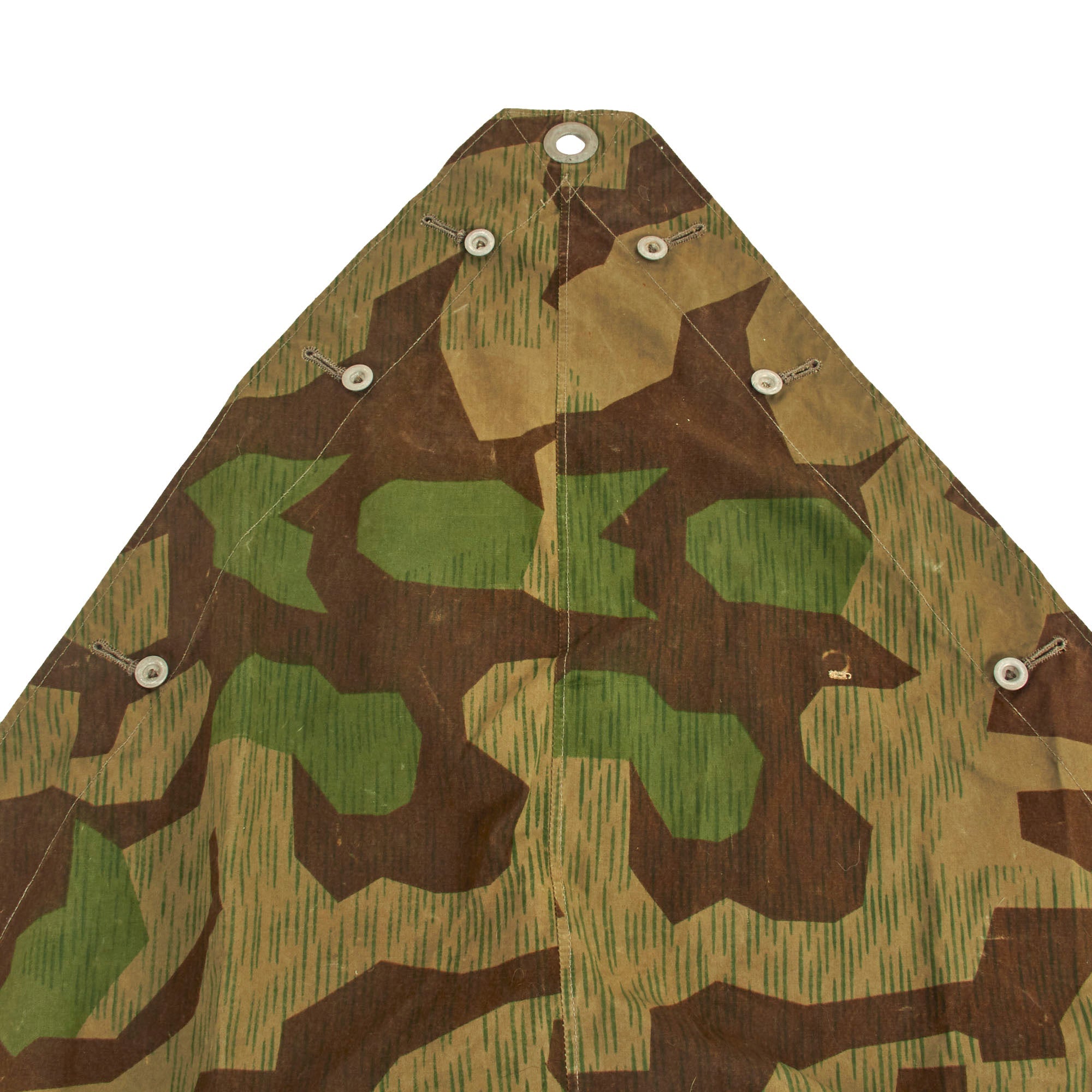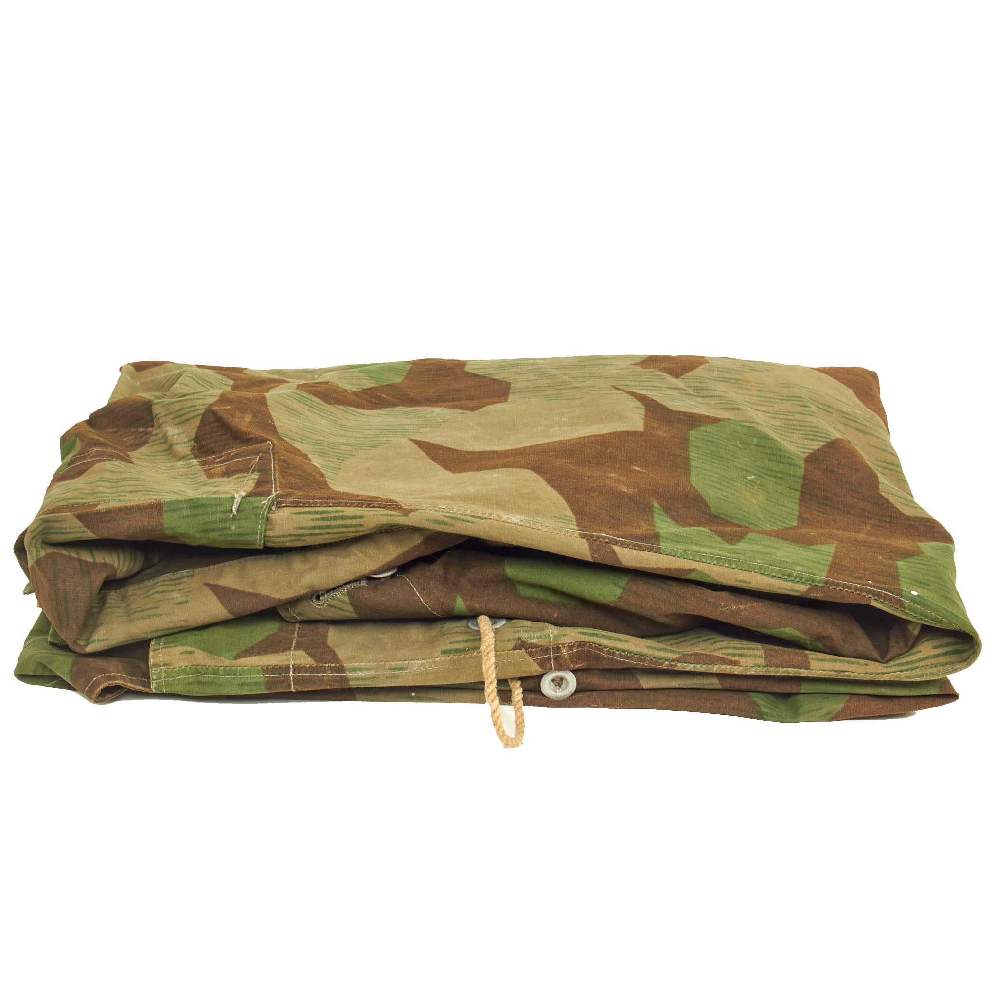 This example was made from the Luftwaffe, and is Splinter Pattern "A" on one side, with Pattern "B" on the other side. It shows only light wear with a few stains and paint marks, probably the result of long term storage. All the aluminum buttons look to be included, as well as the small section of twine rope through the two grommets.