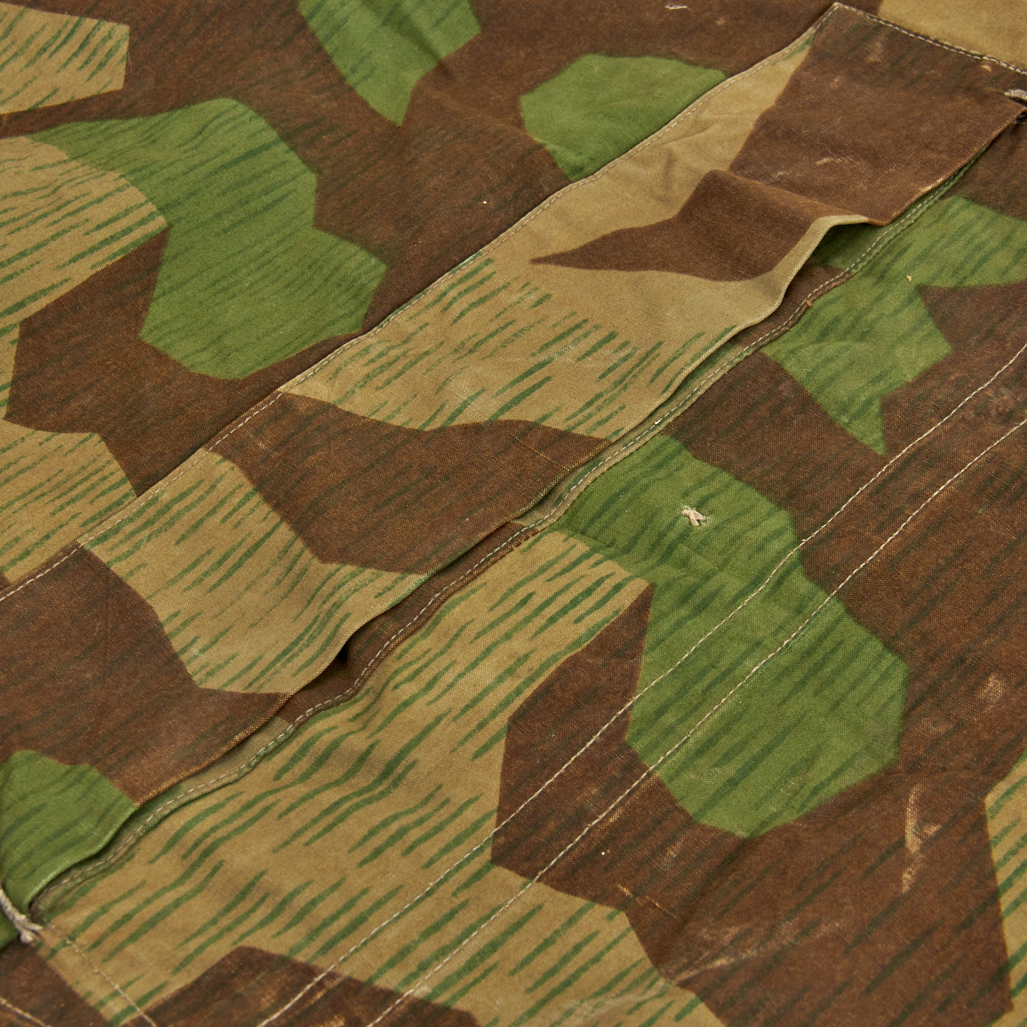 Original Item: Only One Available. The German Zeltbahn or Army Tent Quarter was a multi-purpose piece of German army regulation equipment that was issued to Wehrmacht soldiers during WWII. This piece of camouflaged material could be combined with three other to make a proper tent, or other quantities to construct shelters of various sizes, it was also used for camouflage, as a poncho or even a stretcher. This example comes in the very attractive reversible German Army Splinter pattern, with most of the original aluminum buttons still present.