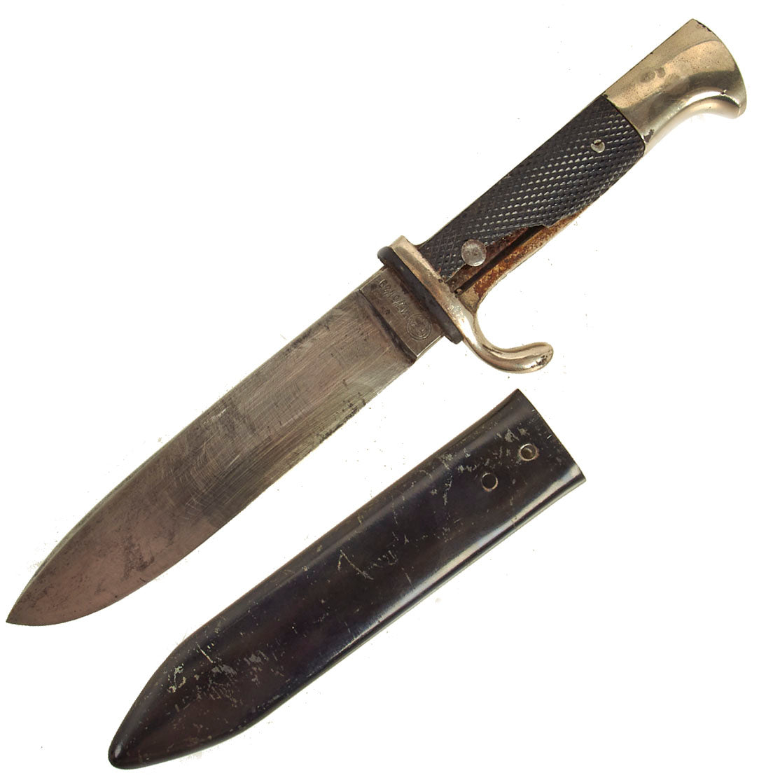 AH believed German youth to be the future of his 3rd Reich. The HJ (AH Jugend) was formed officially in 1935, and with the exception of NSDAP ideology indoctrination was very similar to the Boy Scouts. Beginning at about the age of ten years, both boys (AH Jugend) and girls (Bund Deutscher Mädel) were enlisted in the Party-run organization. The boys only were given HJ Knives after having passed minor exams. The knives had nickeled hilts with black checkered grip plates. The obverse plate was fitted with an enameled HJ swas insignia. Through 1937, these knives were etched with the motto of the organization, Blut und Ehre! (Blood and Honor!). Examples produced after this date were made with plain blades usually bearing an RZM marking.