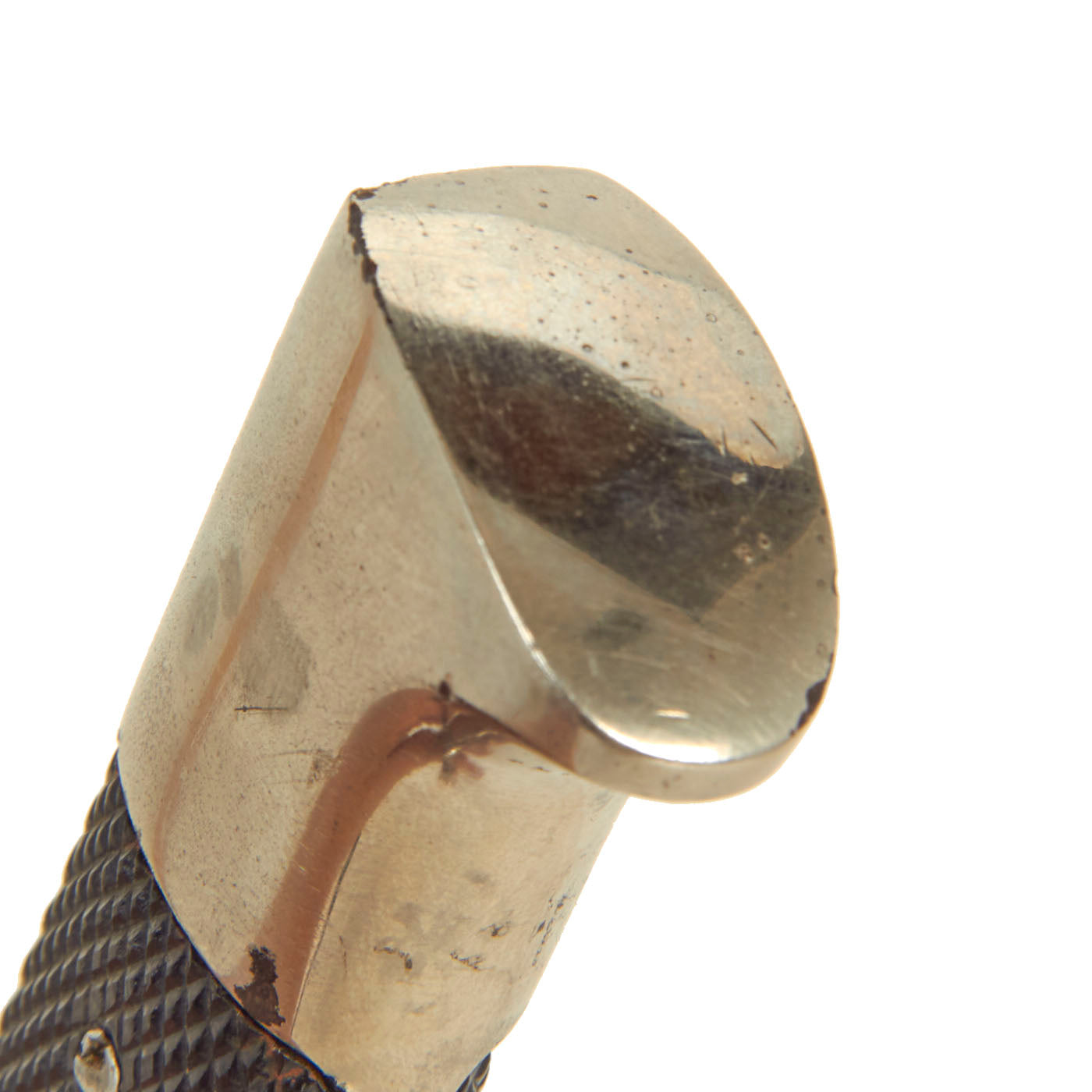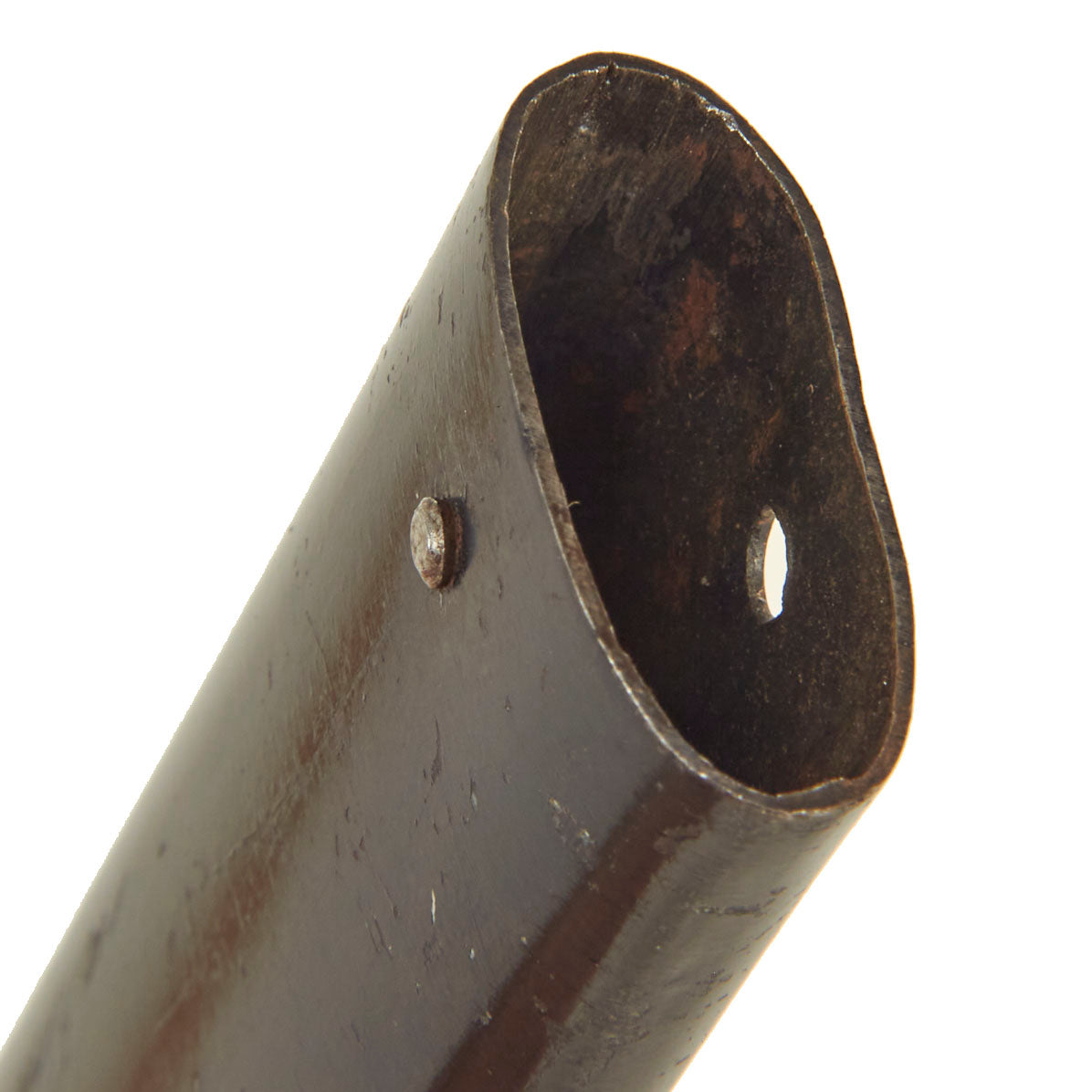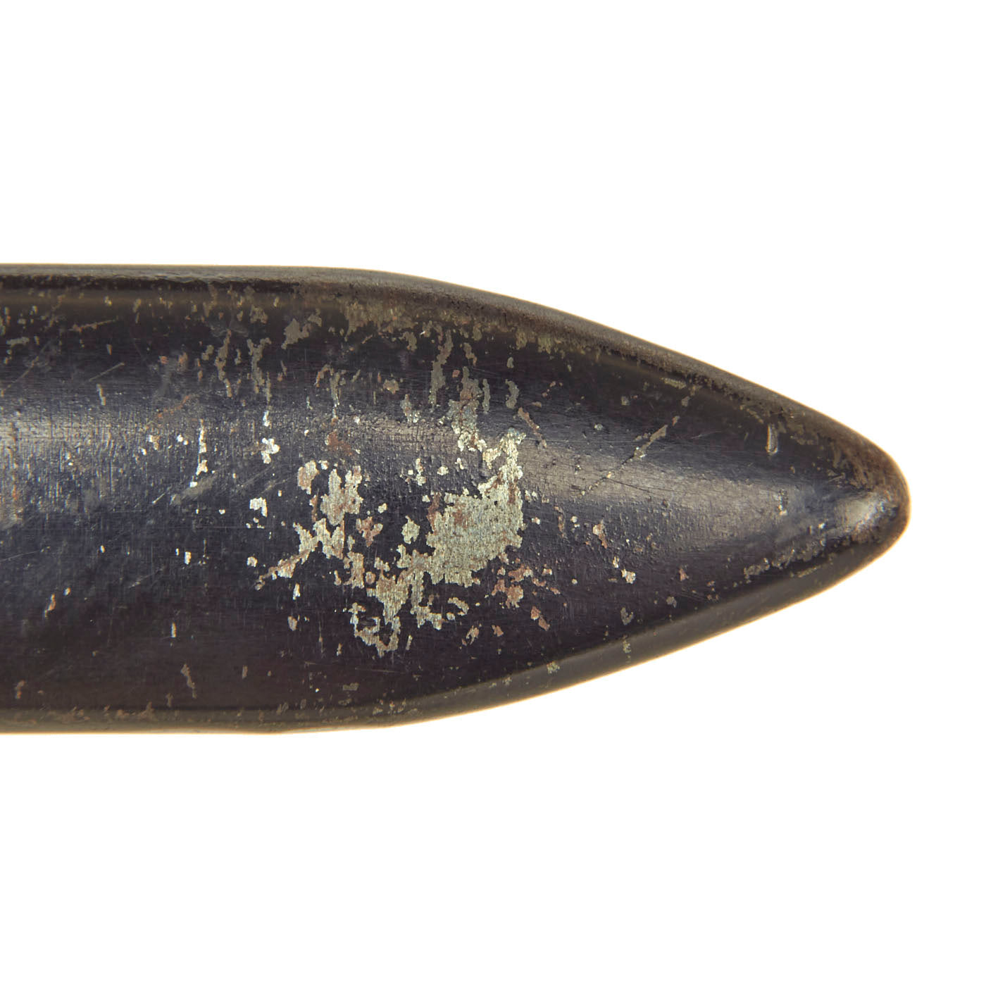 The scabbard shell is the typical tapered example with the standard black enamel finish, which is retained at over 85%. There is just a bit of light crazing, and the original rolling marks on the metal can still be seen through the finish. The leather hanger and belt loop are unfortunately missing completely.