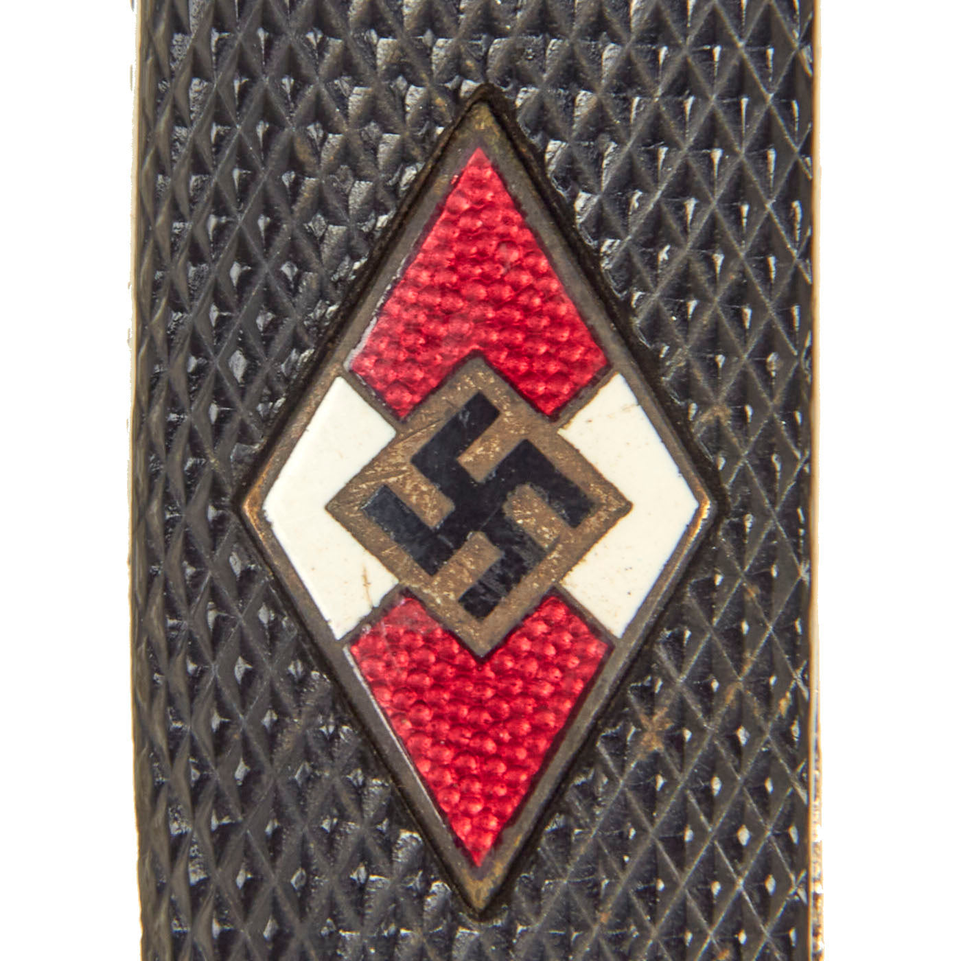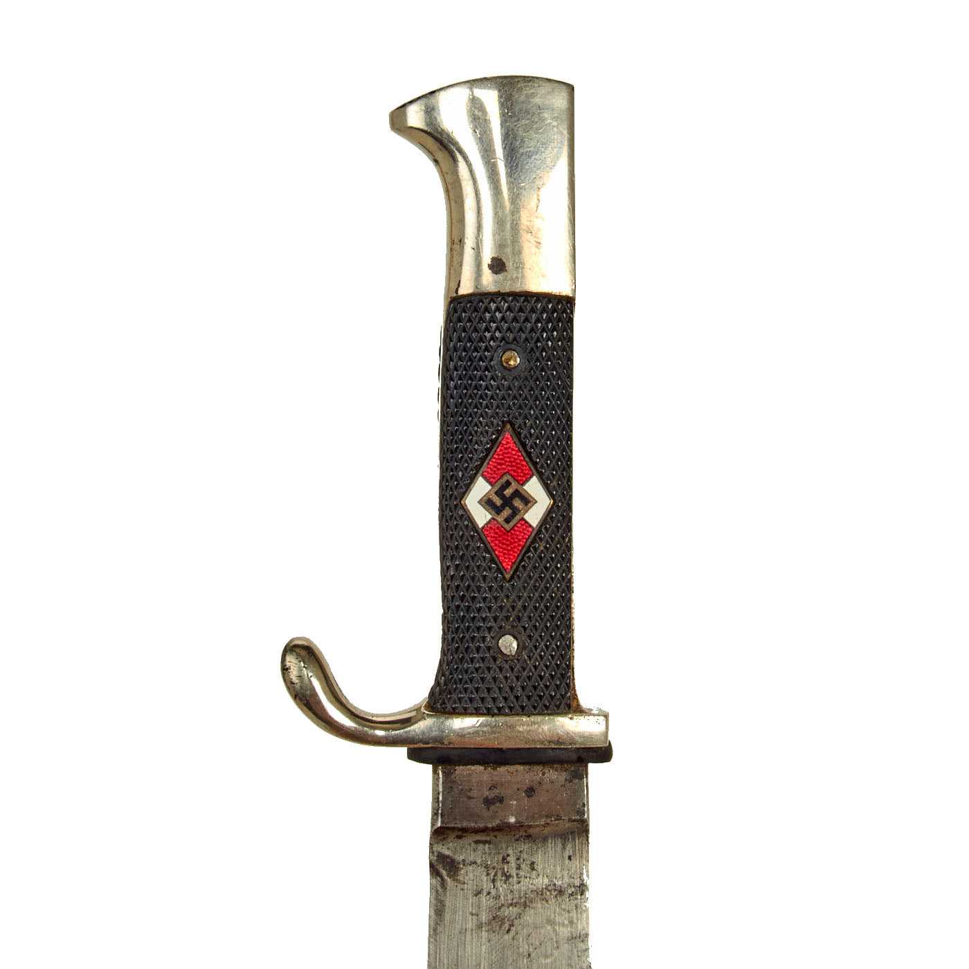 The HJ Leaders were professionals in charge of the training and NSDAP education of the German Youth. They wore a special dagger consisting of silvered hilt fittings with blue-black leather-covered scabbard. The grip was composed of tightly wrapped silver wire, over a wood base. The pommel cap featured an HJ diamond on top, complete with swas. The upper scabbard fitting portrayed an open-winged HJ eagle with swas cut into the bird's chest. The blade was etched with the HJ motto, Blut und Ehre!