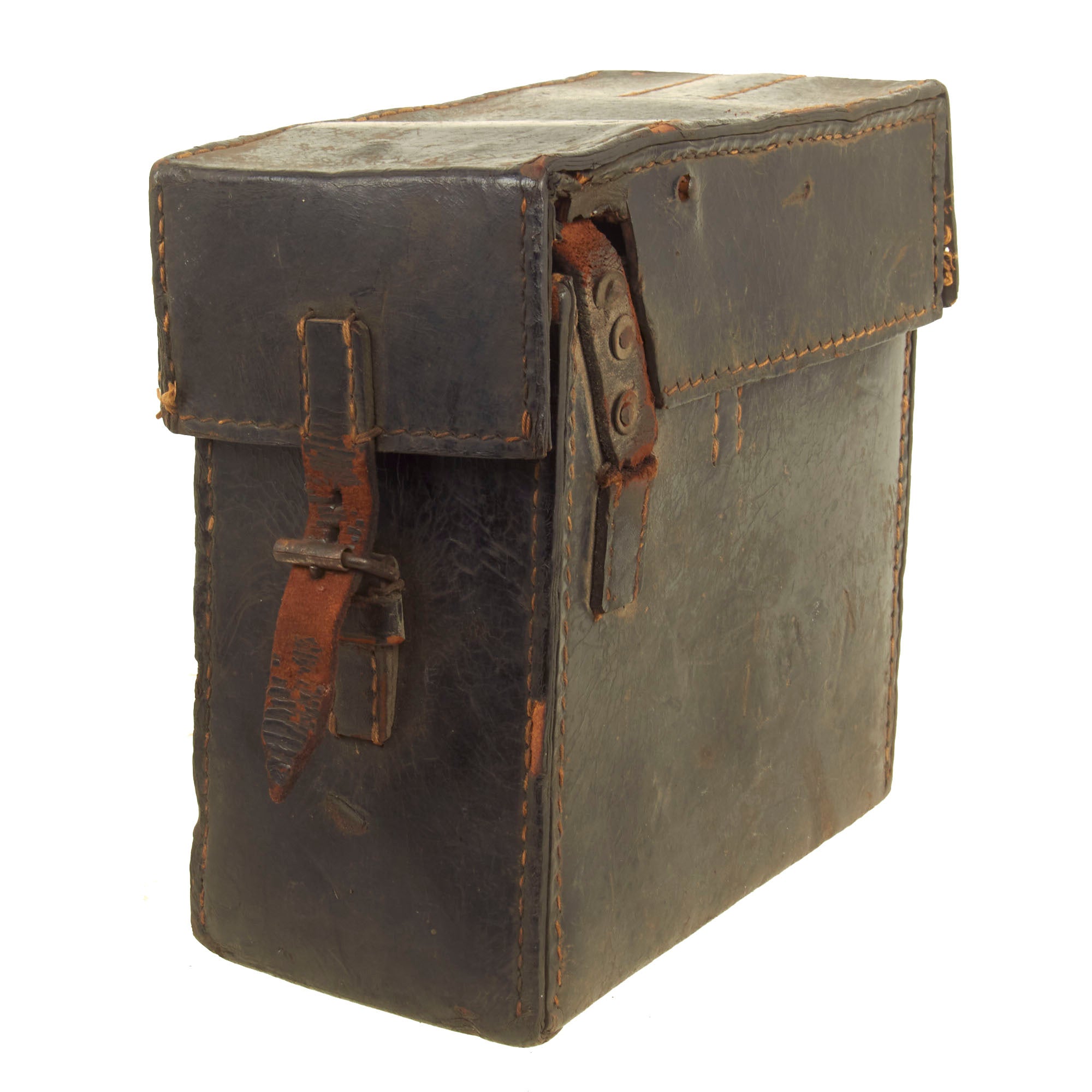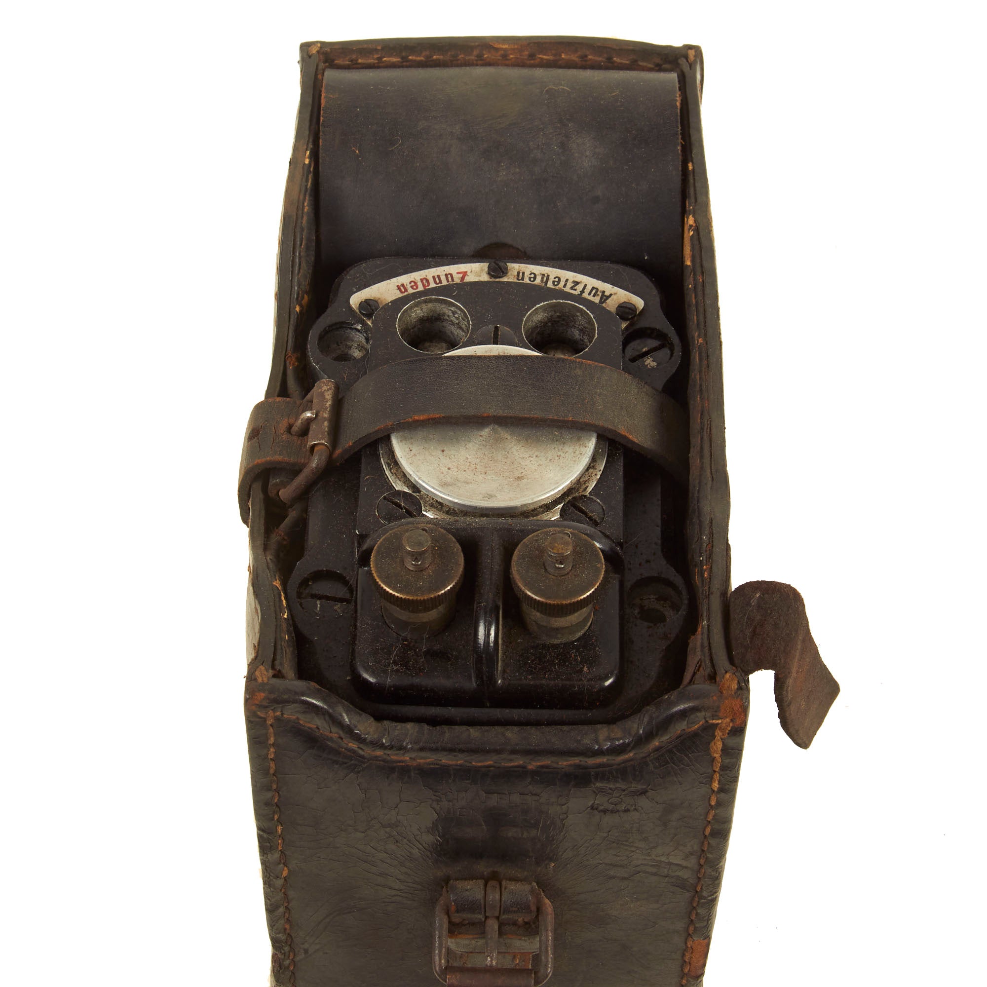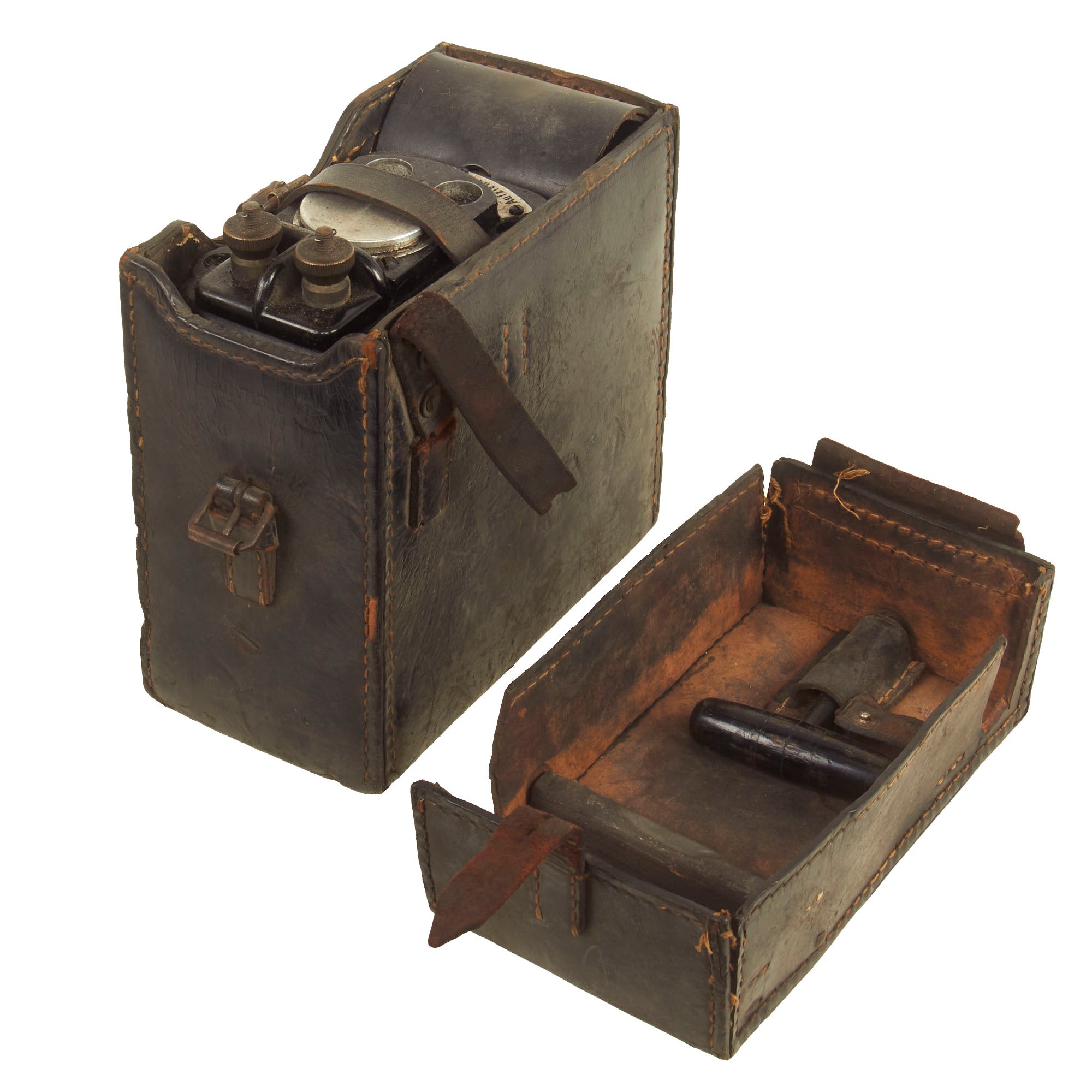 Included with the detonator are TWO handles, as well as a spare central spool insert. These are all stored along with the detonator in the original leather case, which measures 8 1/2" 8 1/2" x 4 1/2". The case is in good service used condition and it looks like it was field modified for a shoulder strap (now missing), with areas of the lid cut out. The stitching on the corners is a bit degraded, and the stitching for the lower portion of the lower leather "hinge" is completely pulled out, so the lid can be removed. This stitching might be possible to repair.