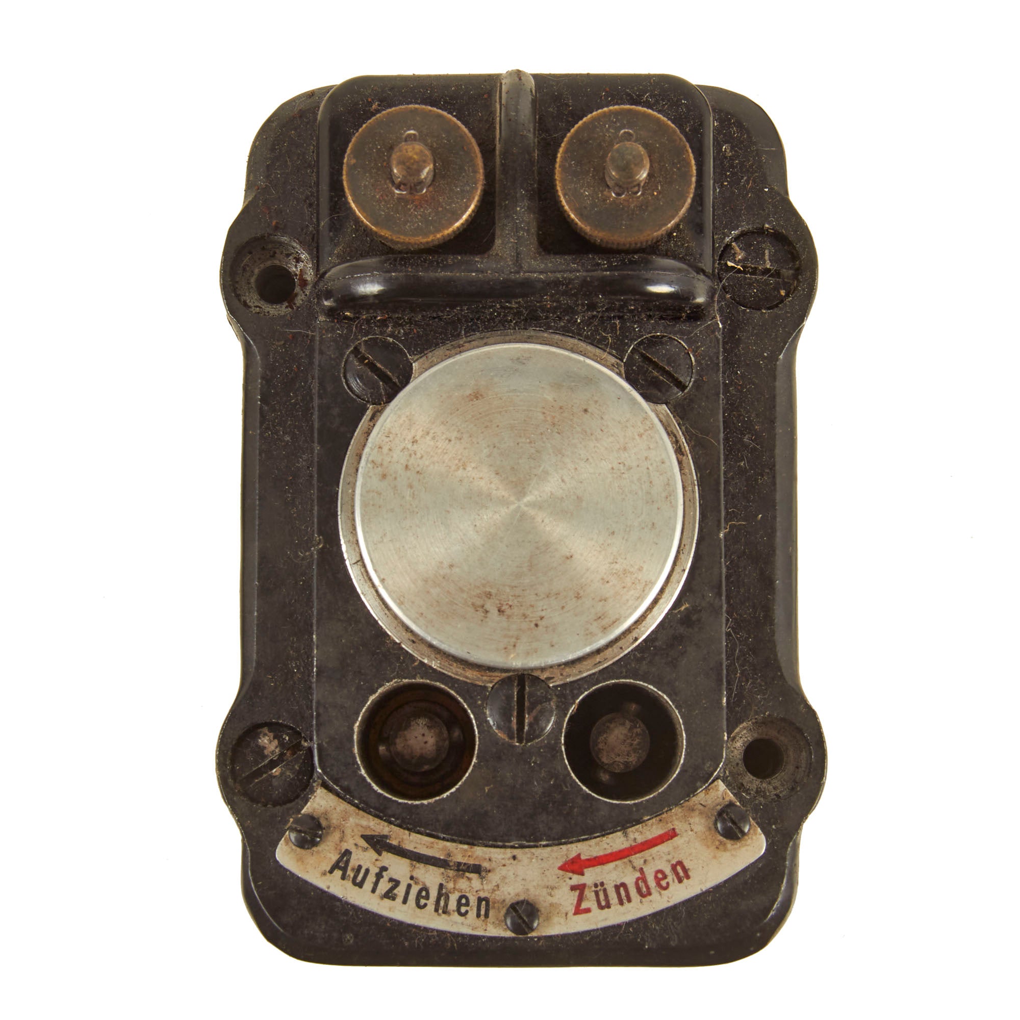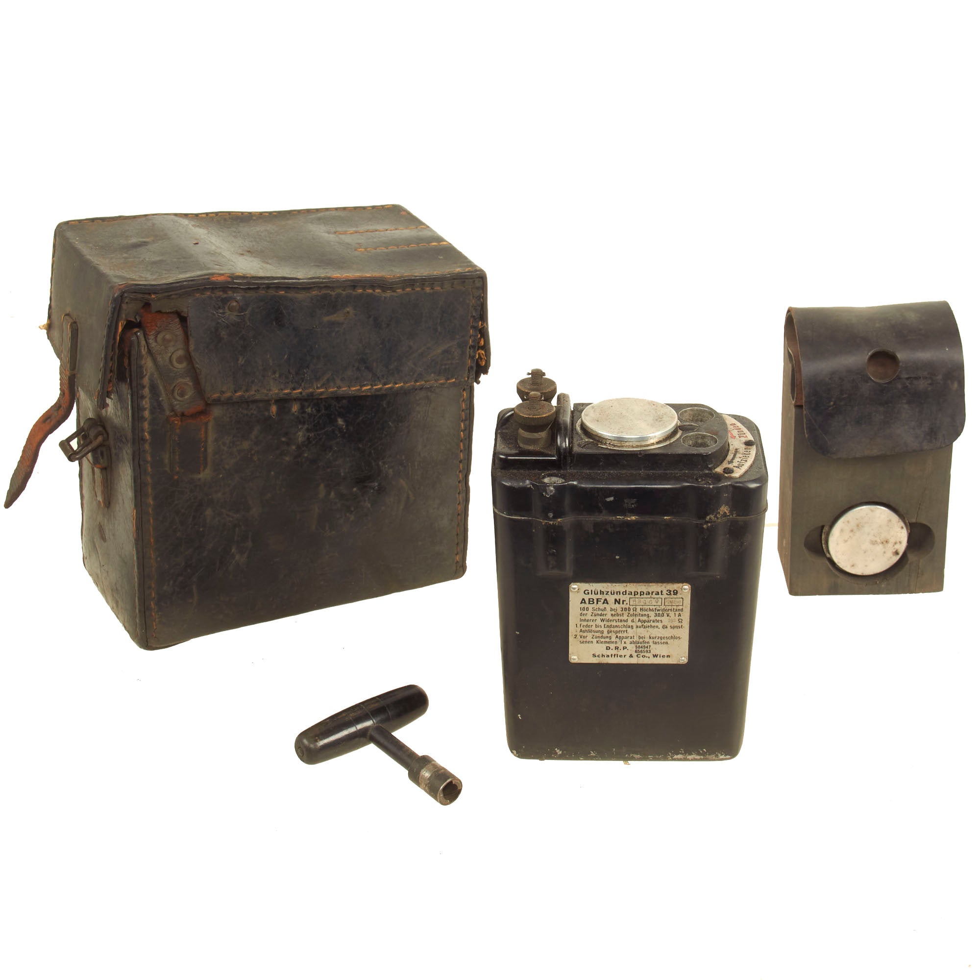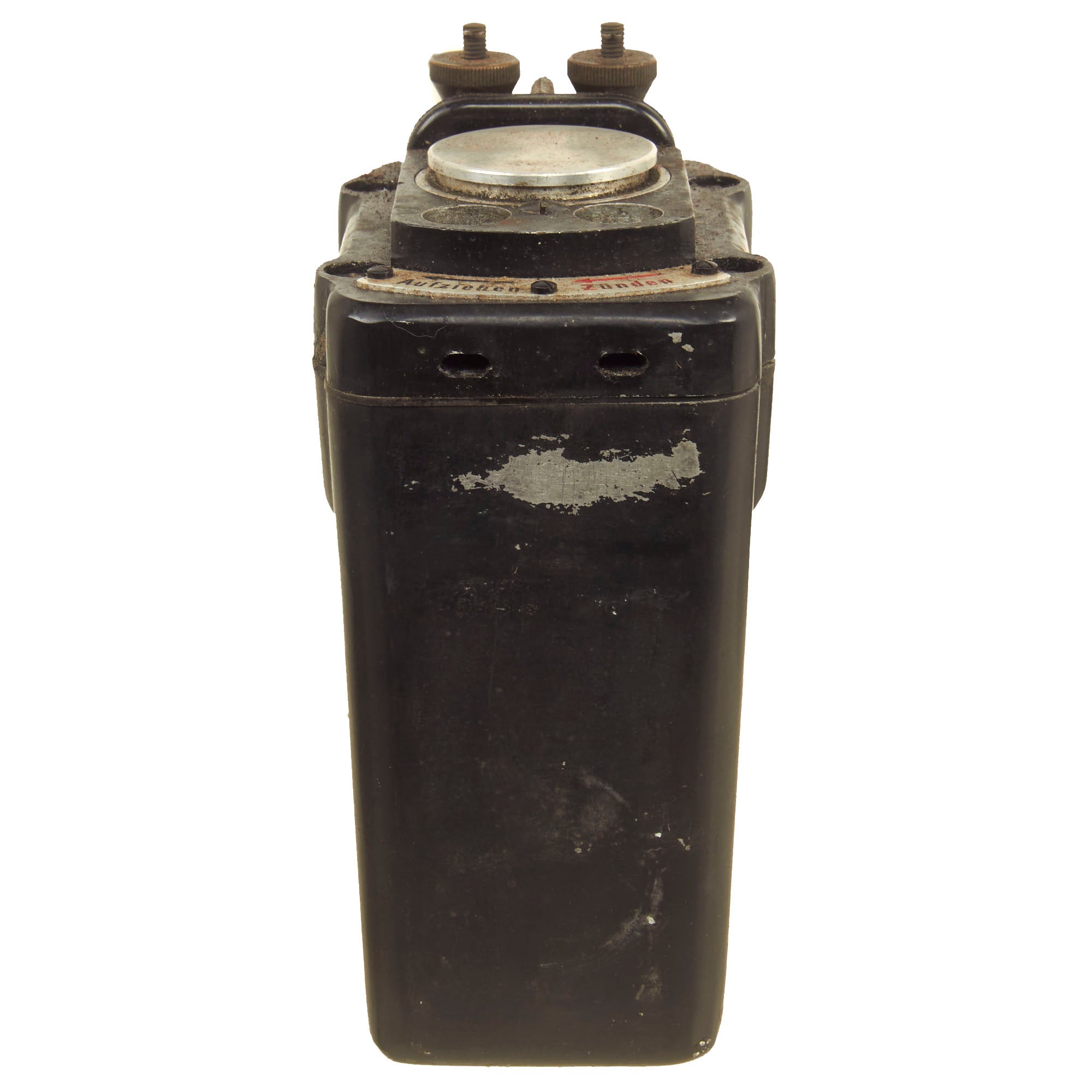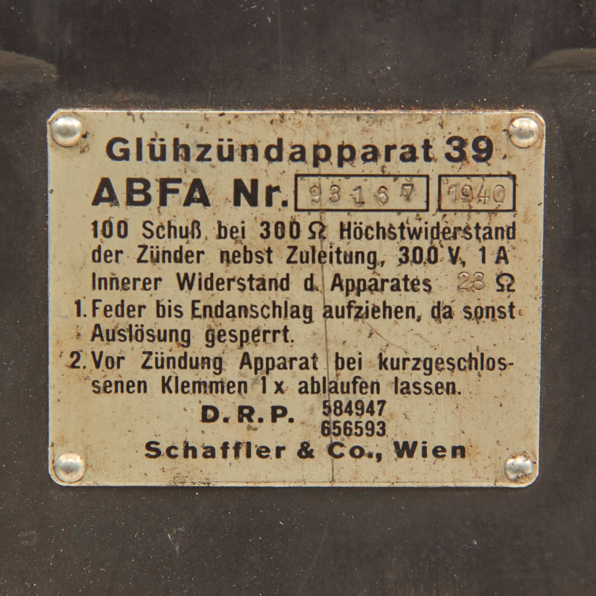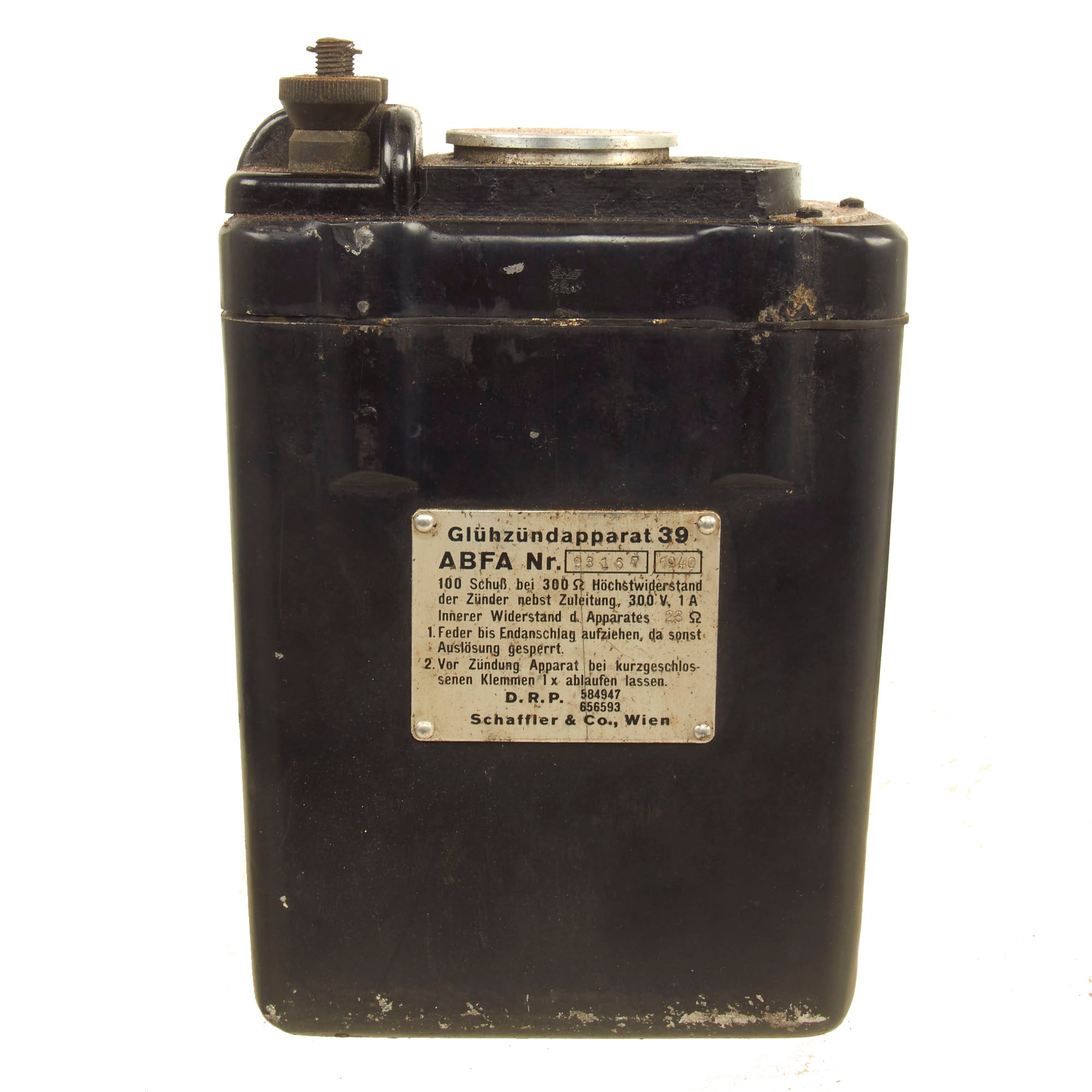 This is a very nice example of the M39 explosive detonator, officially termed the Glühzündapparat 39 (Glow Ignition Device 39), which was capable of producing 300 volts of electrical potential to detonate explosives. It still has thee original data plate on the side, which gives the model designation, serial number, and year of manufacture.