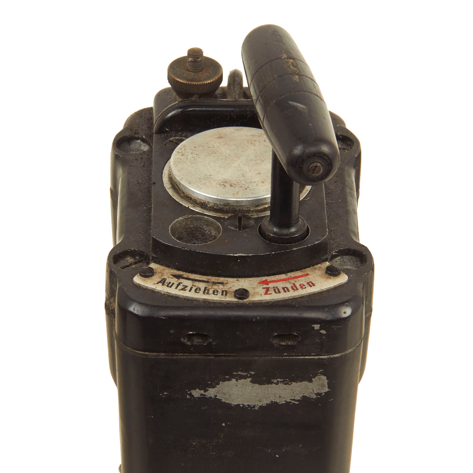 Under this are some instructions regarding shorting the device, and below this is the makers name of Schaffler & Co,. Wien. The top of the detonator has two terminals to attach wires to, and also has a central insert which we assume is some type of generator spool. It has two attachment points for a winding handle, which are labeled Aufziehen (Wind Up) and Zünden (ignite). Two of four screws that retain the top are still present, and the detonator will wind up, but we were not able to get it to fire. The detonator itself measures 8"H x 5 1/4" x 3 5/8".