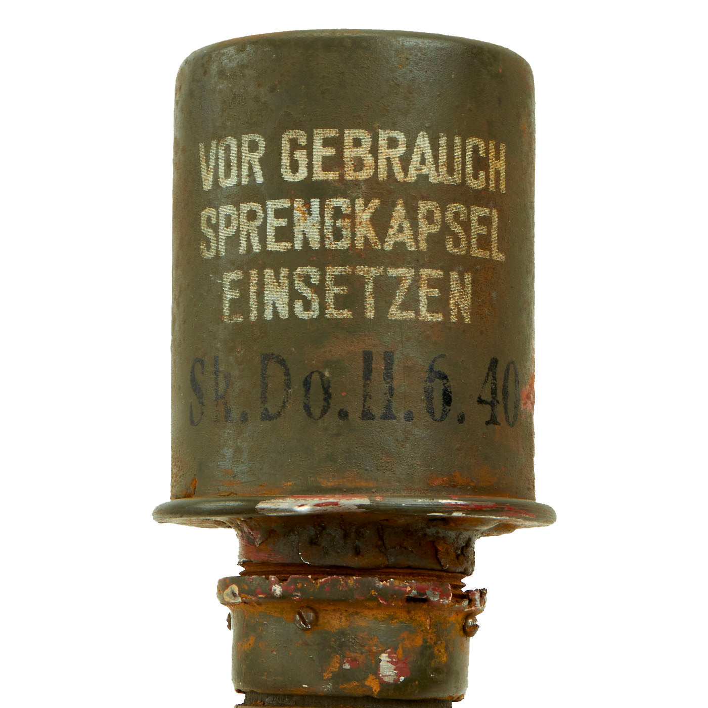 The warhead bears a manufacturer filling stamping to the front, which indicates it was filled in 1940: Sk. Do. 11.6.40. The top bears the Waffenamt, WaA65 in white paint. Warhead is empty and demilitarized, it screws off easily from the shaft. It is painted the correct green over a red primer, and the stencil on the front is still fully legible: VOR GEBRAUCH SPRENGKAPSEL EINSETZEN (Before use insert detonator).