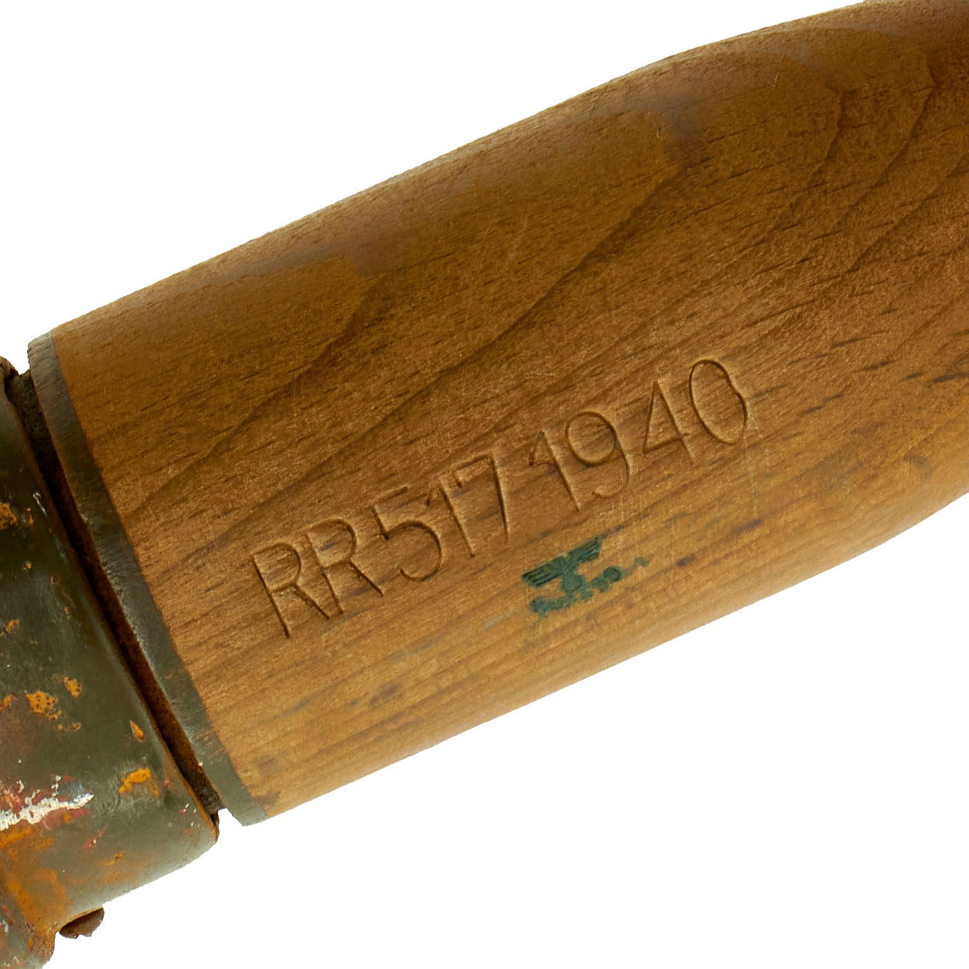The wood shaft of the grenade is clearly stamped with with ЯR 517 1940, which corresponds to the manufacturer Richard Rinker G.m.b.H. in Menden/Iserlohn, the original designer of the M24 grenade. This company had many factories and subcontractors, and records indicate that contractor "517" was Metallwarenfabrik Siegwerk Gebrüder Schuppener, located in Siegen, Westfalen. This was all done to obscure the location of the makers. The bottom end cap is no longer secured to the wood shaft, but the screw cap is still present, although the cap constructed of galvanized steel is heavily corroded.