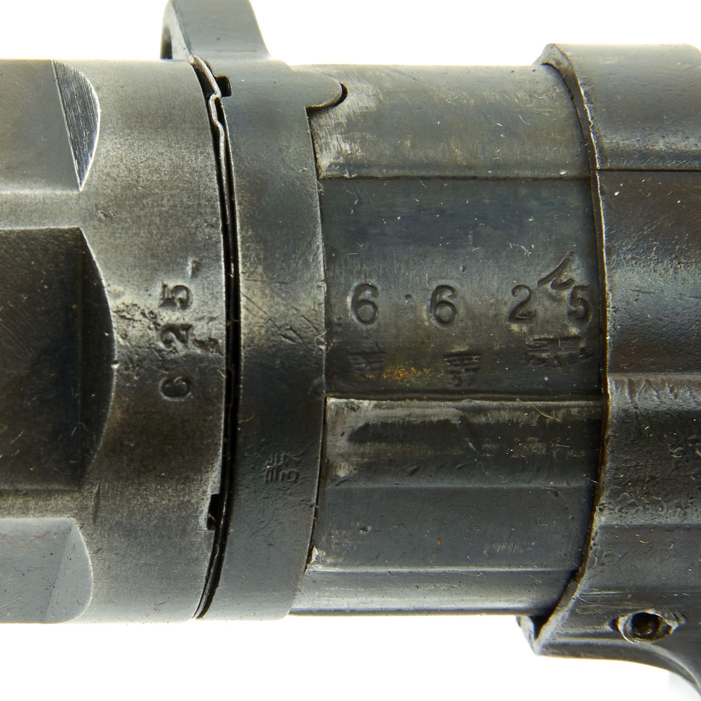 "122" is an older designation from the German Pre-WWII Zahlencode (Number Code) listing. This indicates 1940 manufacture by C.G. Haenel of Suhl, Germany, who manufactured many small arms and parts during the war. The rear receiver cup is marked on the left side with serial number 25958, and does not have any subcontractor markings. The folding butt stock is marked with shortened number 958, while the trigger guard is marked with 5408 / c. The barrel, barrel nut, front receiver and sight are all marked with matching number [6]625, so this is a "partial matching" set.