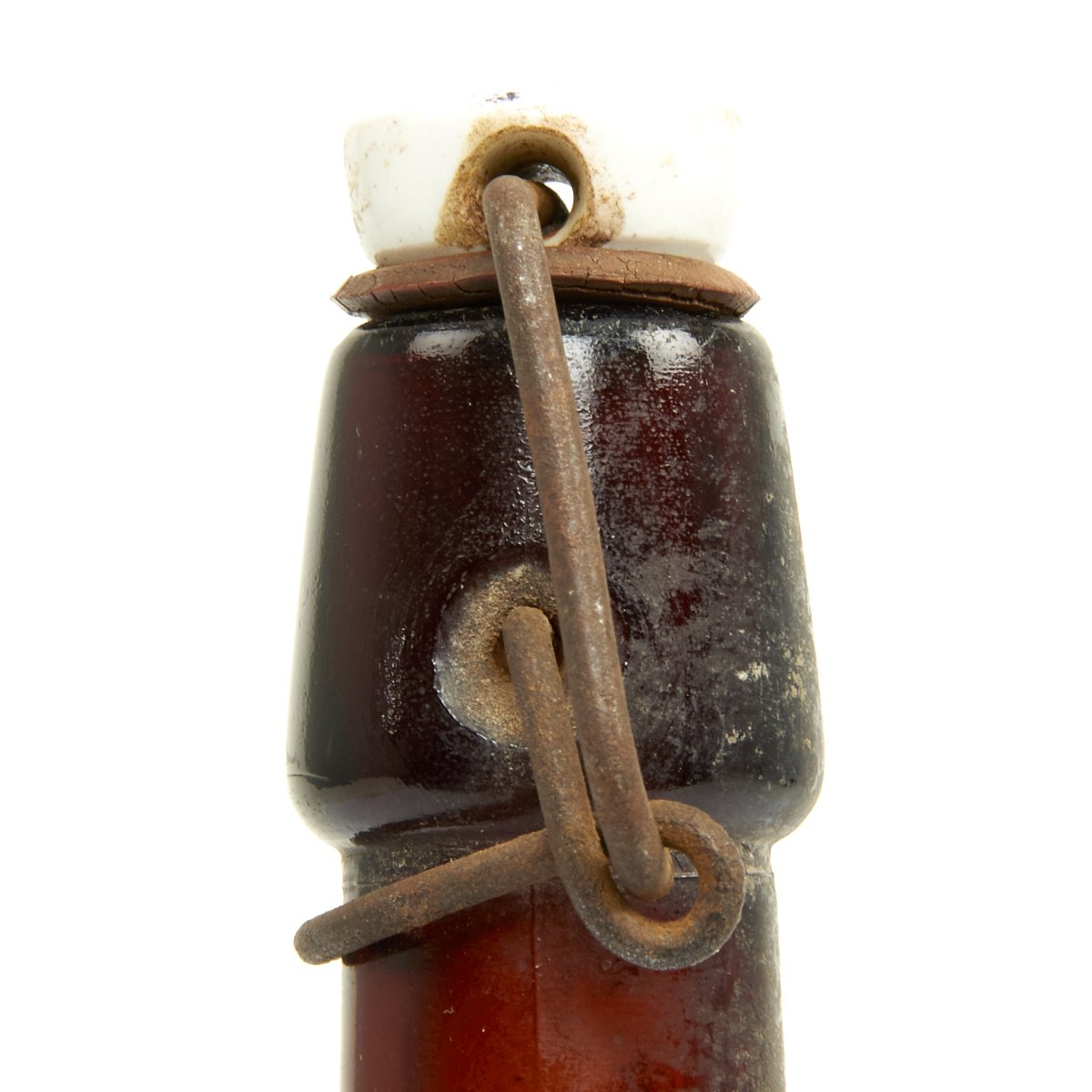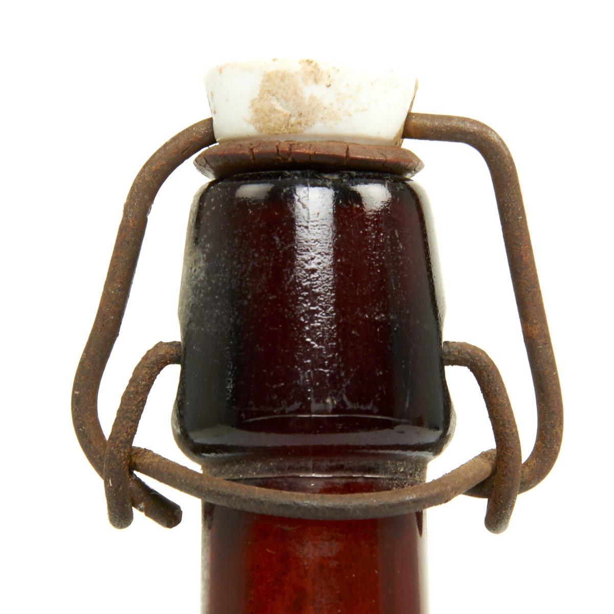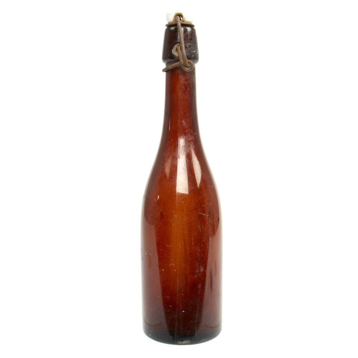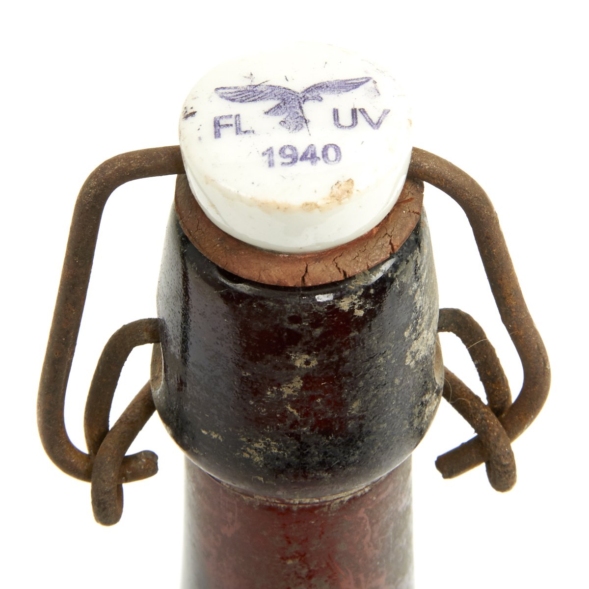 Original Item: Only One Available. Genuine German WW2 Luftwaffe marked beer / wine bottle offered in excellent condition with the original porcelain top and wire bail. Typically clear glass was used for beer while green or brown glass would have been for wine, but this was not a hard and fast rule. The white porcelain stopper is nicely dated 1940 and coded FL UV with a Luftwaffe eagle. FL UV stands for Flieger Unterkunft Verwaltung, or the Flight Barracks Administration, the agency responsible for Luftwaffe accommodations.
