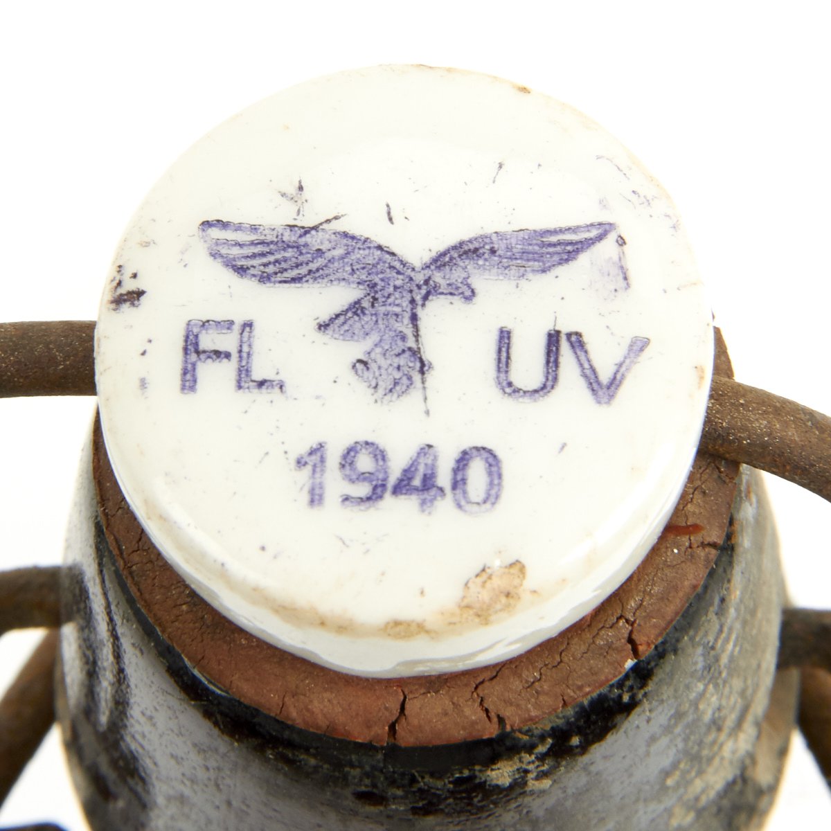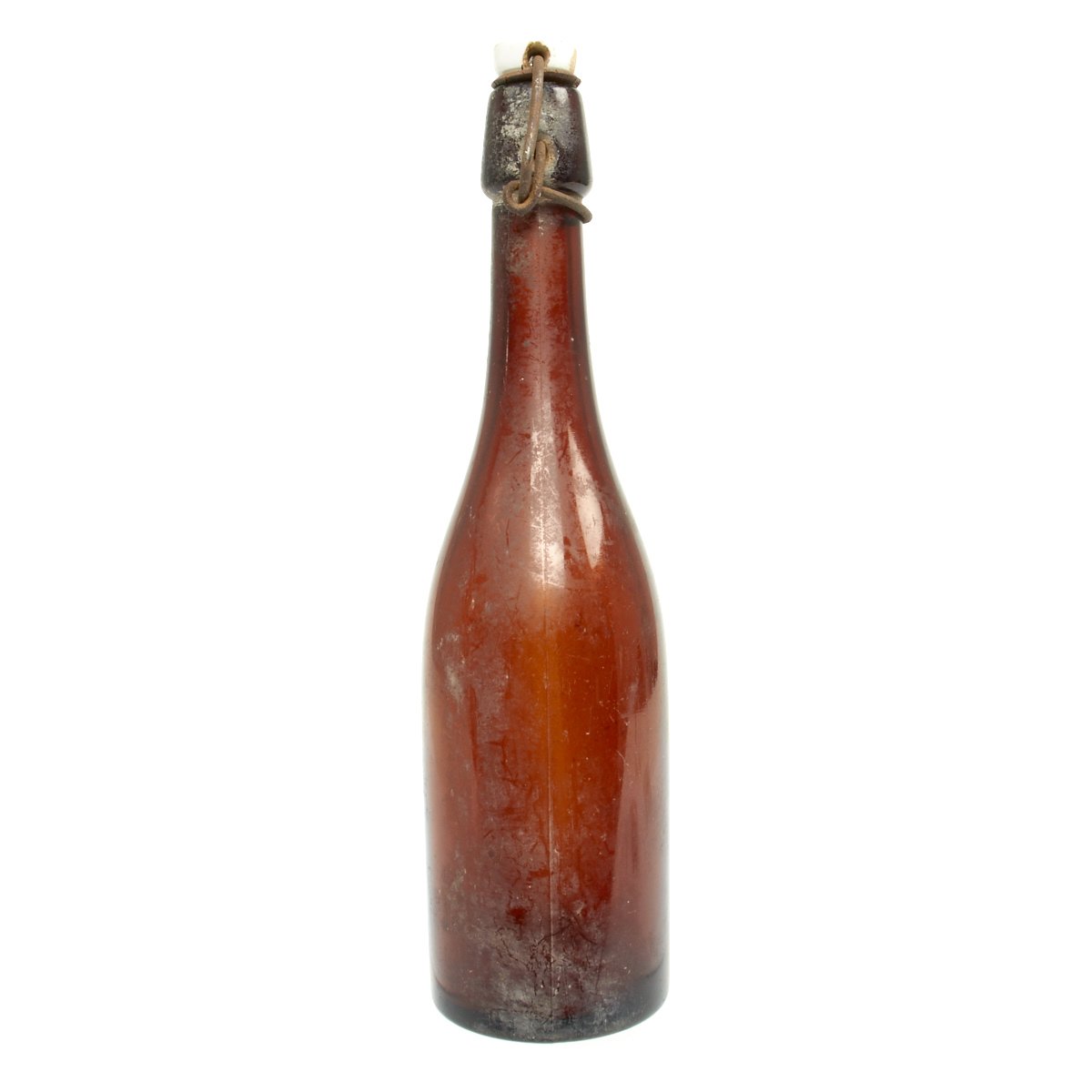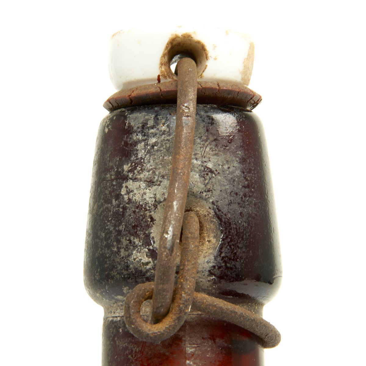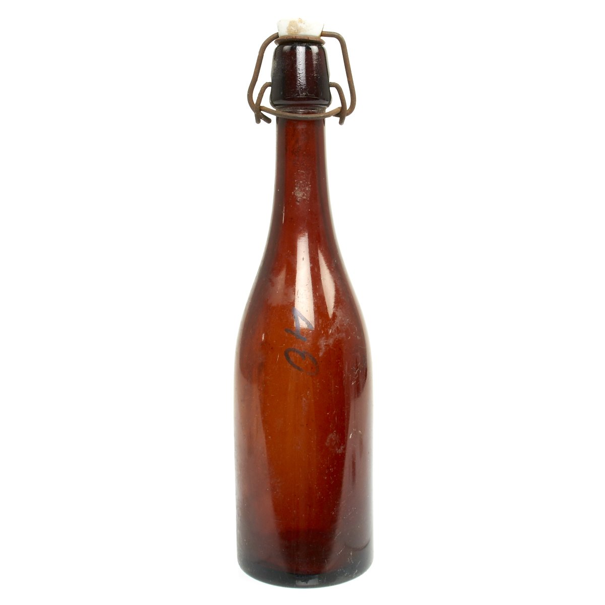 Original Item: Only One Available. Genuine German WW2 Luftwaffe marked beer / wine bottle offered in excellent condition with the original porcelain top and wire bail. Typically clear glass was used for beer while green or brown glass would have been for wine, but this was not a hard and fast rule. The white porcelain stopper is nicely dated 1940 and coded FL UV with a Luftwaffe eagle. FL UV stands for Flieger Unterkunft Verwaltung, or the Flight Barracks Administration, the agency responsible for Luftwaffe accommodations.
