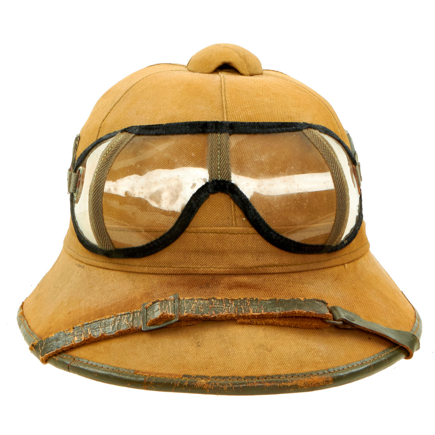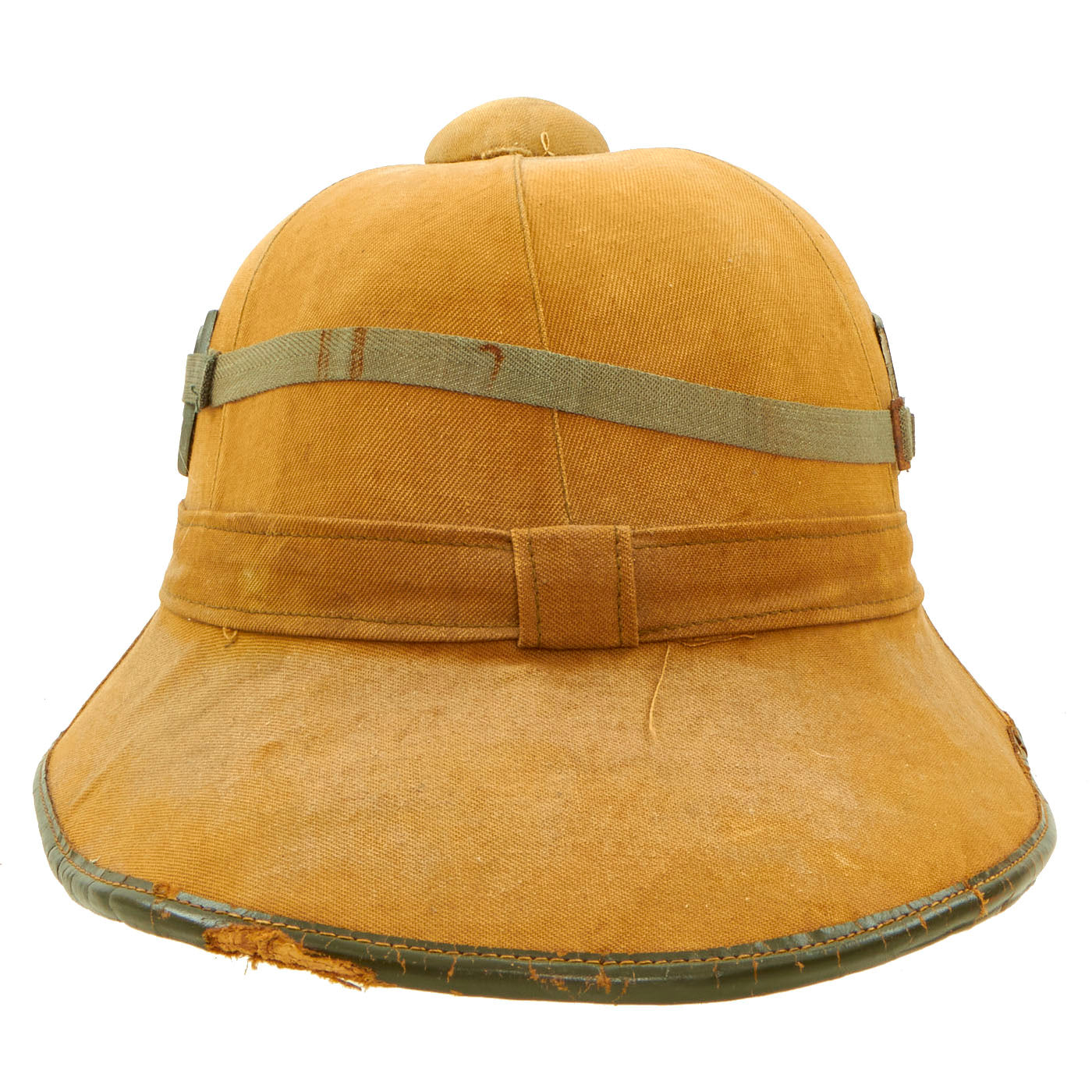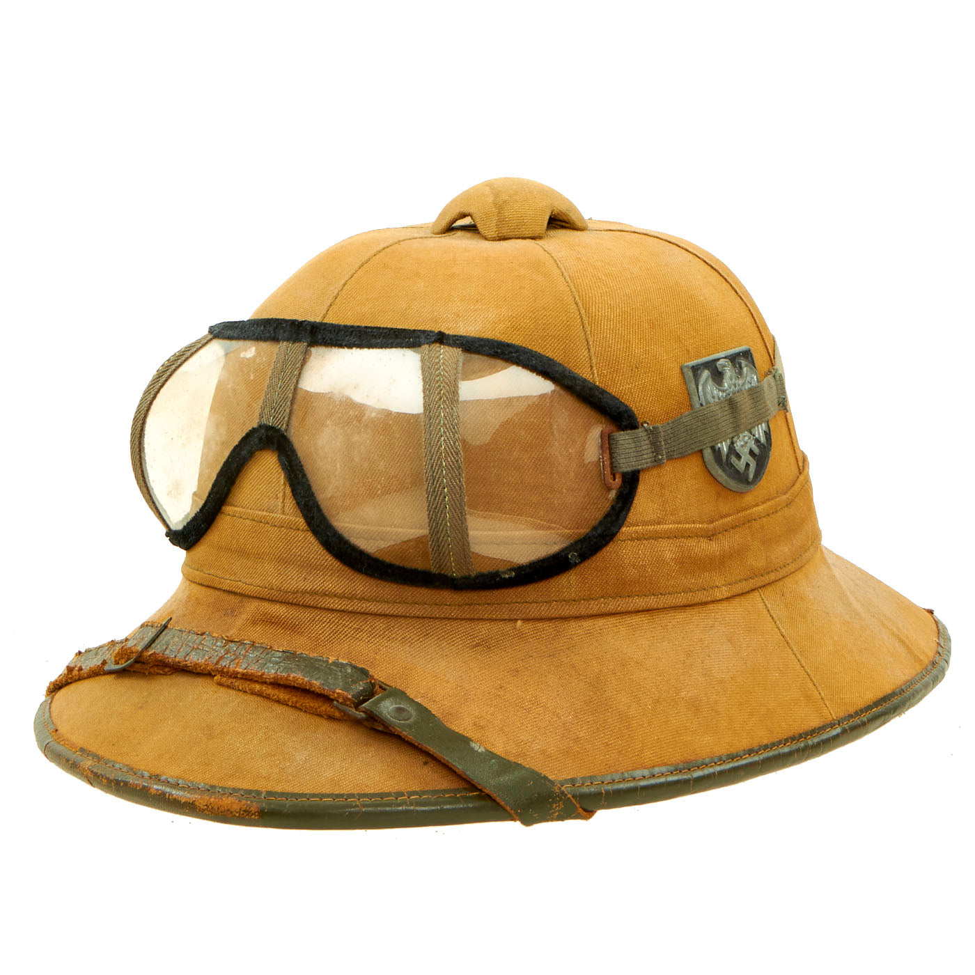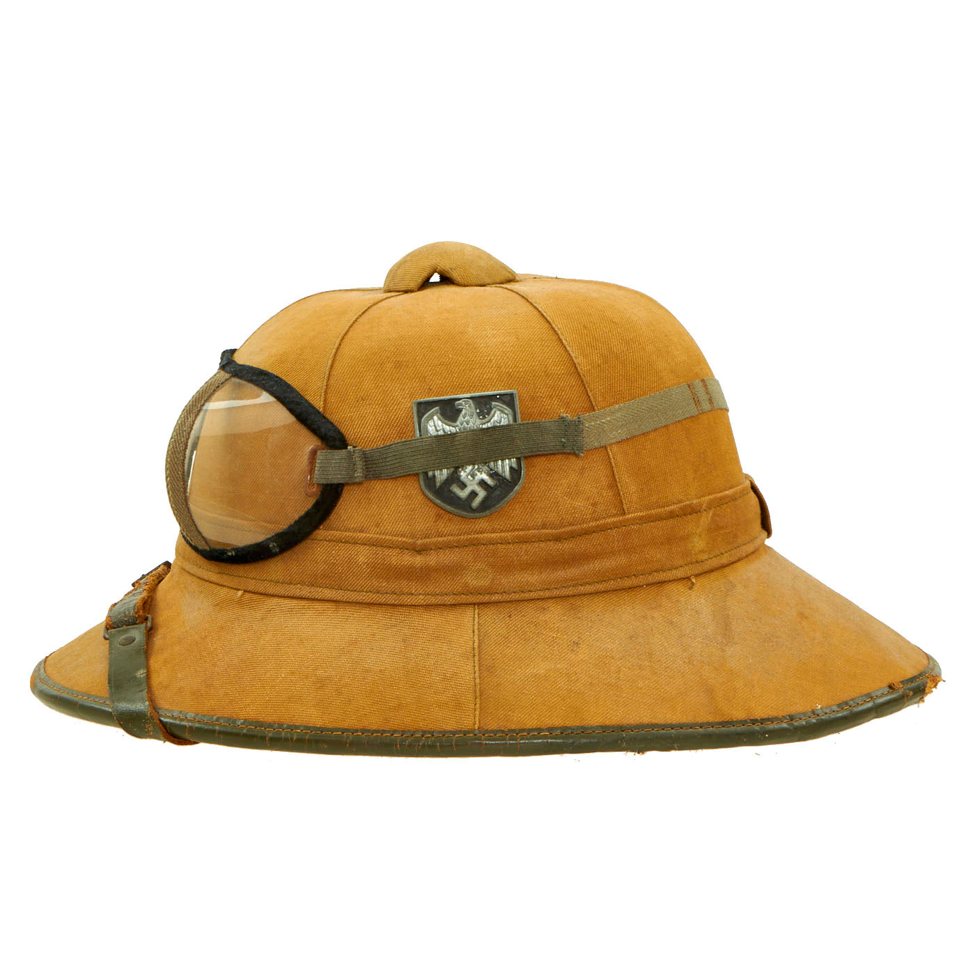 Original Item: Only One Set Available. On first deployment to North Africa in 1941, Afrikakorps infantry were issued with the traditional European sun helmet known as Tropische Kopfbedeckung (Tropical headgear), of the type known to the British forces as the solar topi (or topee). In the German case, these were made of pith, had prominent ventilation holes in the crown, were khaki in color and bore two metal shields; on the right the national colors and on the left the German eagle. There were several models made, with the first model like this having cotton outer covering made of fabric panels sewn together.
