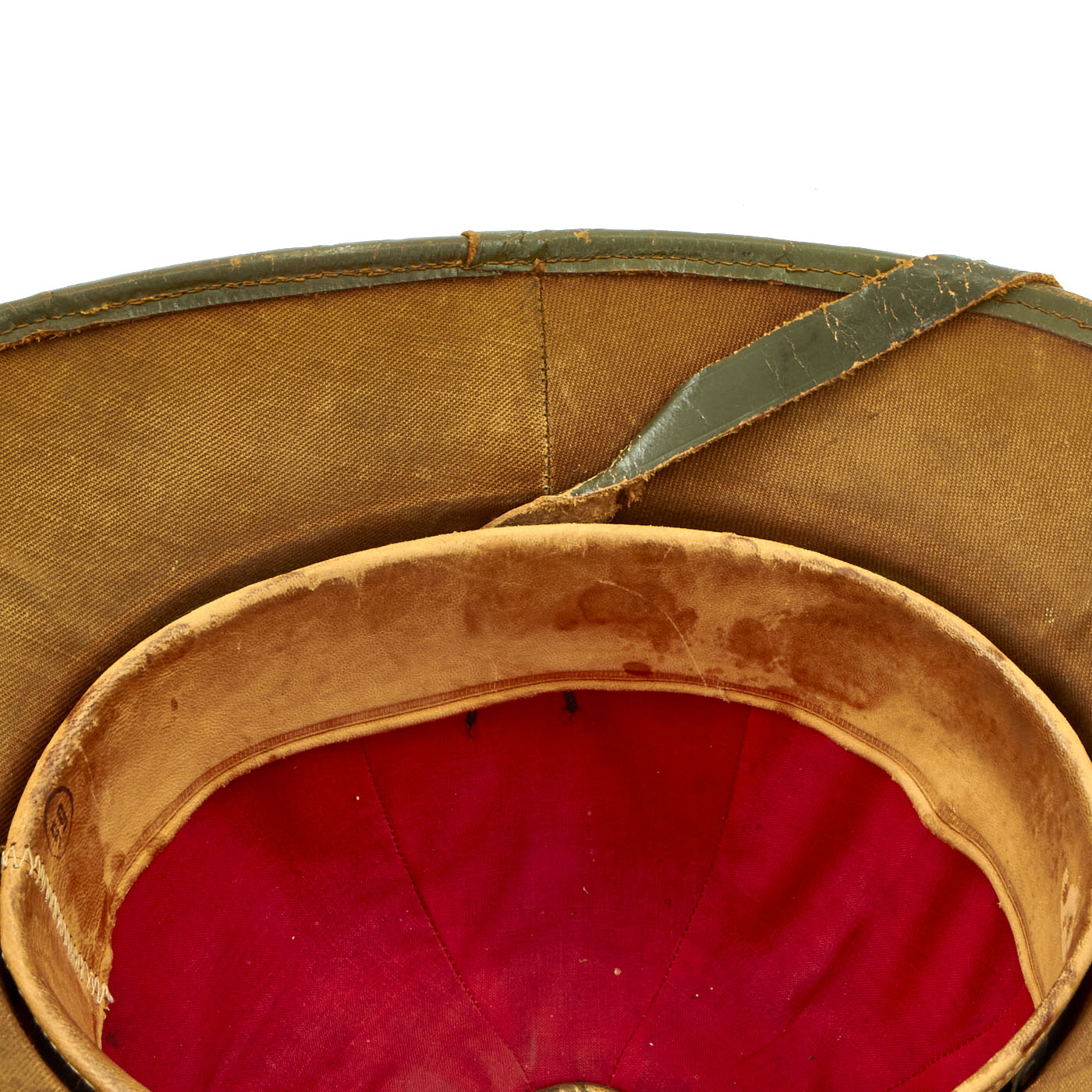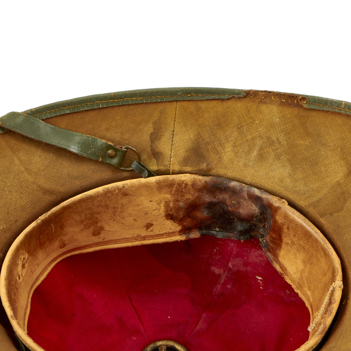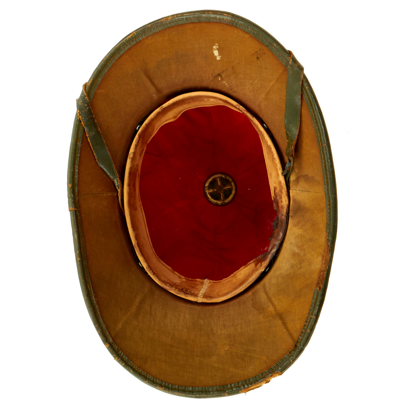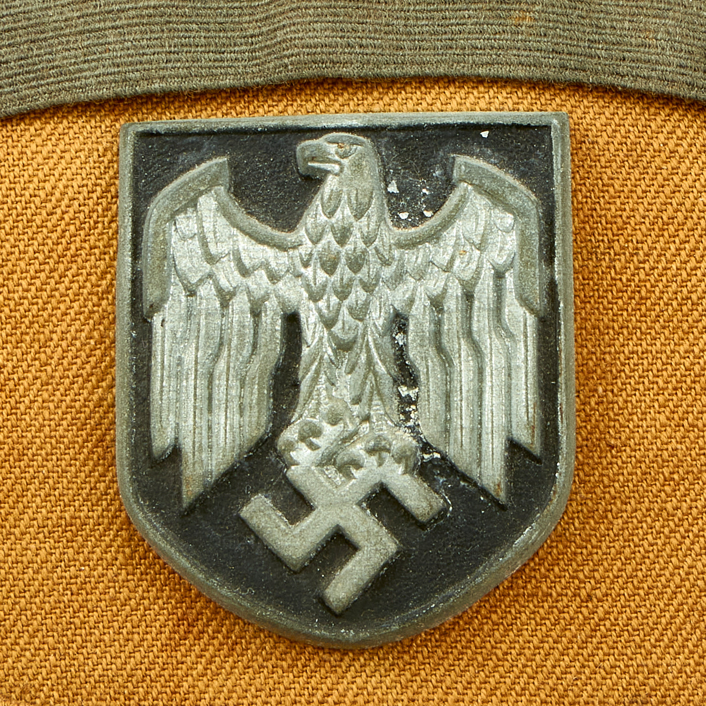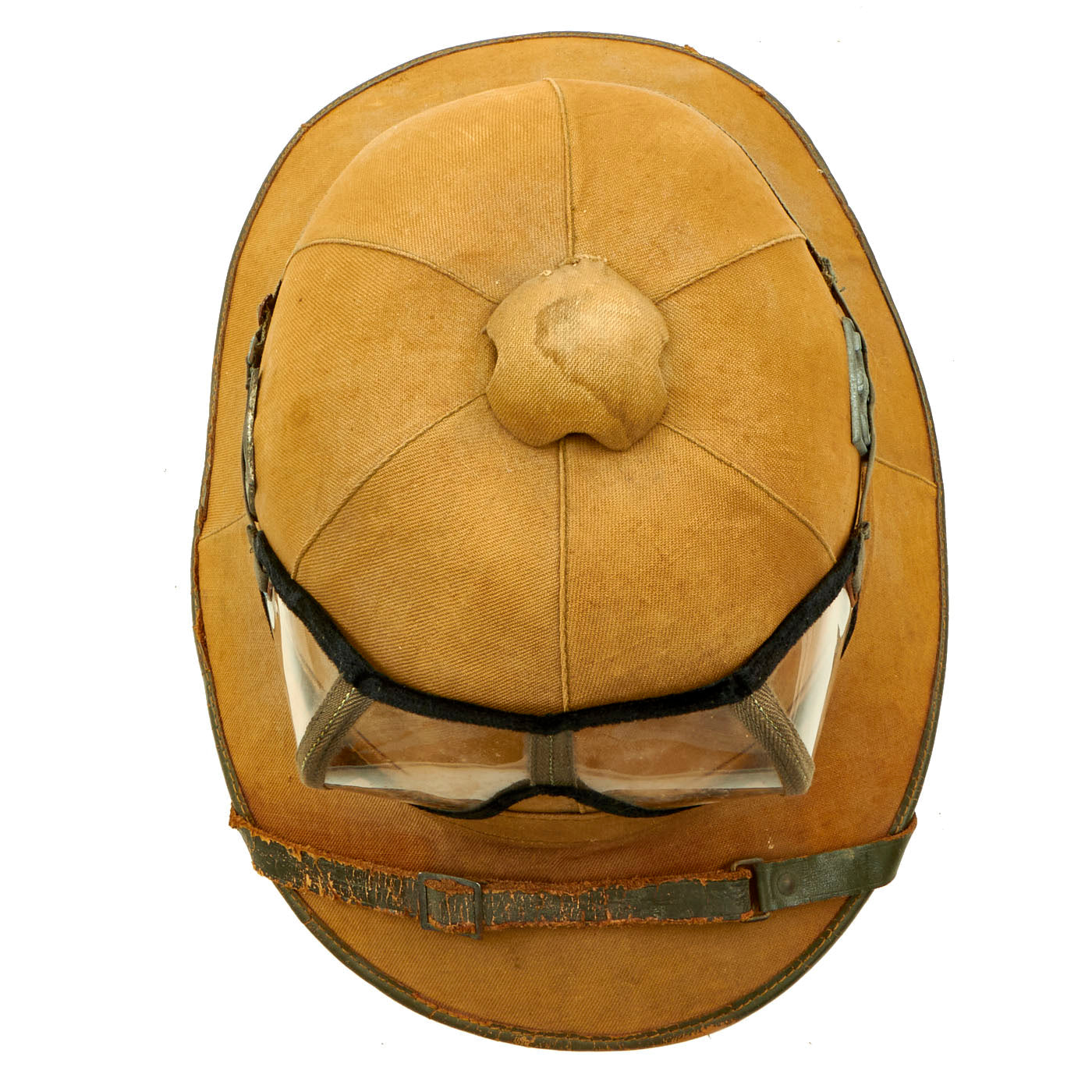 Original Item: Only One Set Available. On first deployment to North Africa in 1941, Afrikakorps infantry were issued with the traditional European sun helmet known as Tropische Kopfbedeckung (Tropical headgear), of the type known to the British forces as the solar topi (or topee). In the German case, these were made of pith, had prominent ventilation holes in the crown, were khaki in color and bore two metal shields; on the right the national colors and on the left the German eagle. There were several models made, with the first model like this having cotton outer covering made of fabric panels sewn together.