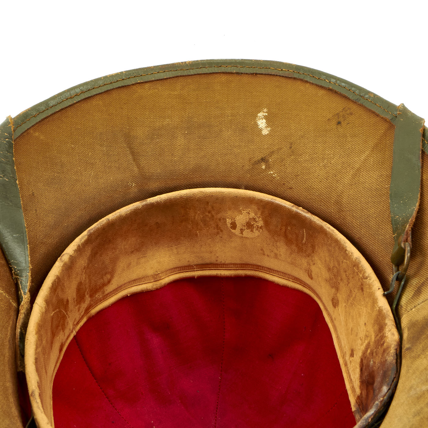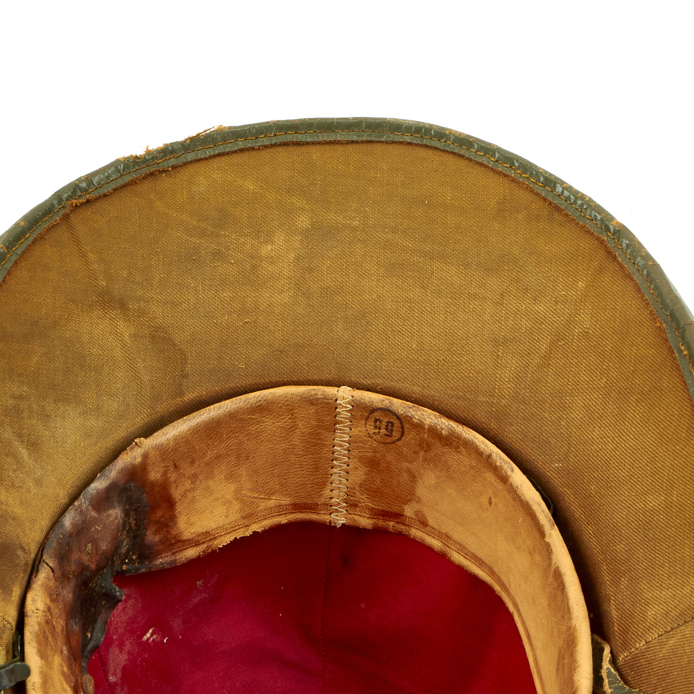 This example is in very good condition. All of the components are present including the often missing chinstrap. The original khaki cloth covering is intact and retains its original color, with some water staining and a few small tears. The helmet band is in good condition, and appears to have a bloodstain in the liner. Indicating this may have been recovered off the battlefield from a KIA German soldier. The leather trim is in good condition, with the expected wear from age and use. It is worn through or missing in a few small areas here and there. The markings are underneath the sweatband, with the maker code “B.K.” and date “41”. The interior of the helmet still has the original red cotton covering intact, with staining from water and wear.