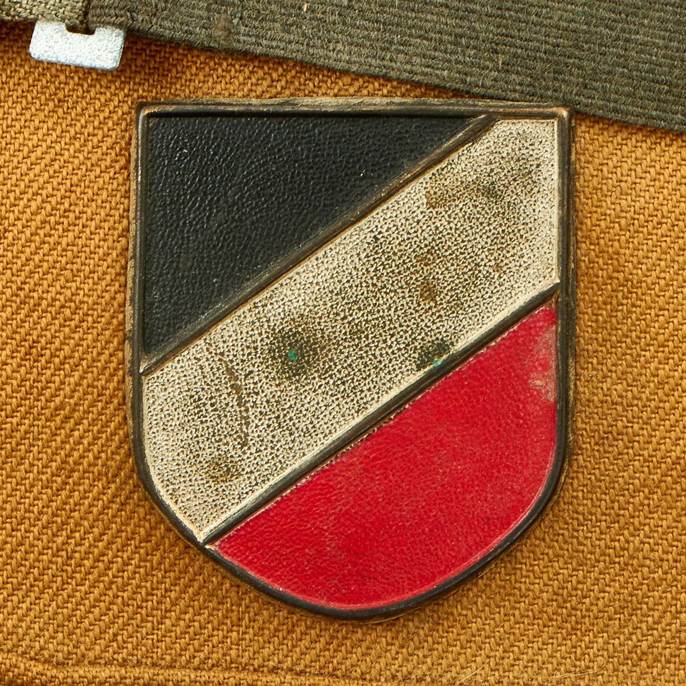 The metal badges are totally genuine and are in excellent condition with a nice finish and patina. The national colors looks to be made of aluminum, and is in great shape with fully intact paint, and all three back tabs still present. The Wehrmacht eagle is made of zinc, and has some oxidation. It also is missing one of the three securing prongs on the back, but is still solidly mounted.