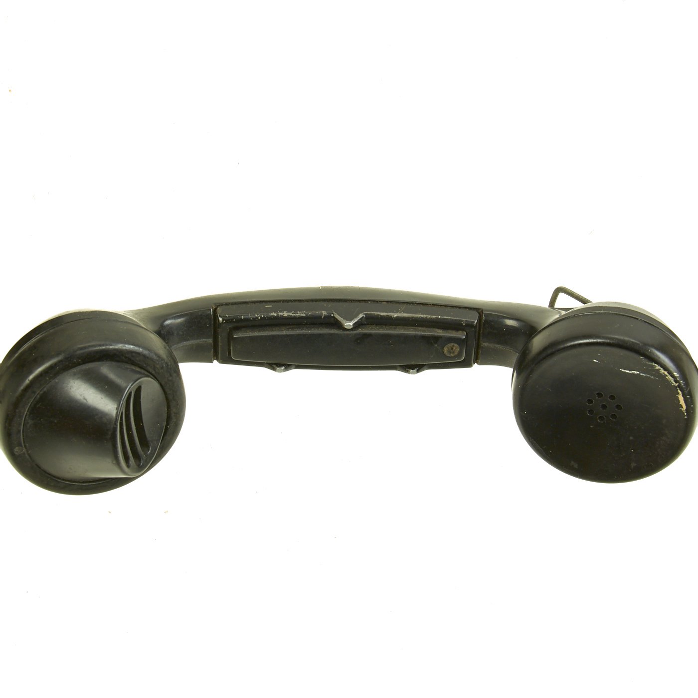 The bakelite handset is marked with a Waffenamt near the hanger clip, so it is definitely WWII Issue, though the cord has been wrapped with fabric electrical tape. There is also a Waffenamt on the metal housing under the white Prüftaste (test button). The housing measures approximately 11" W x 8 1/2" H x 4".