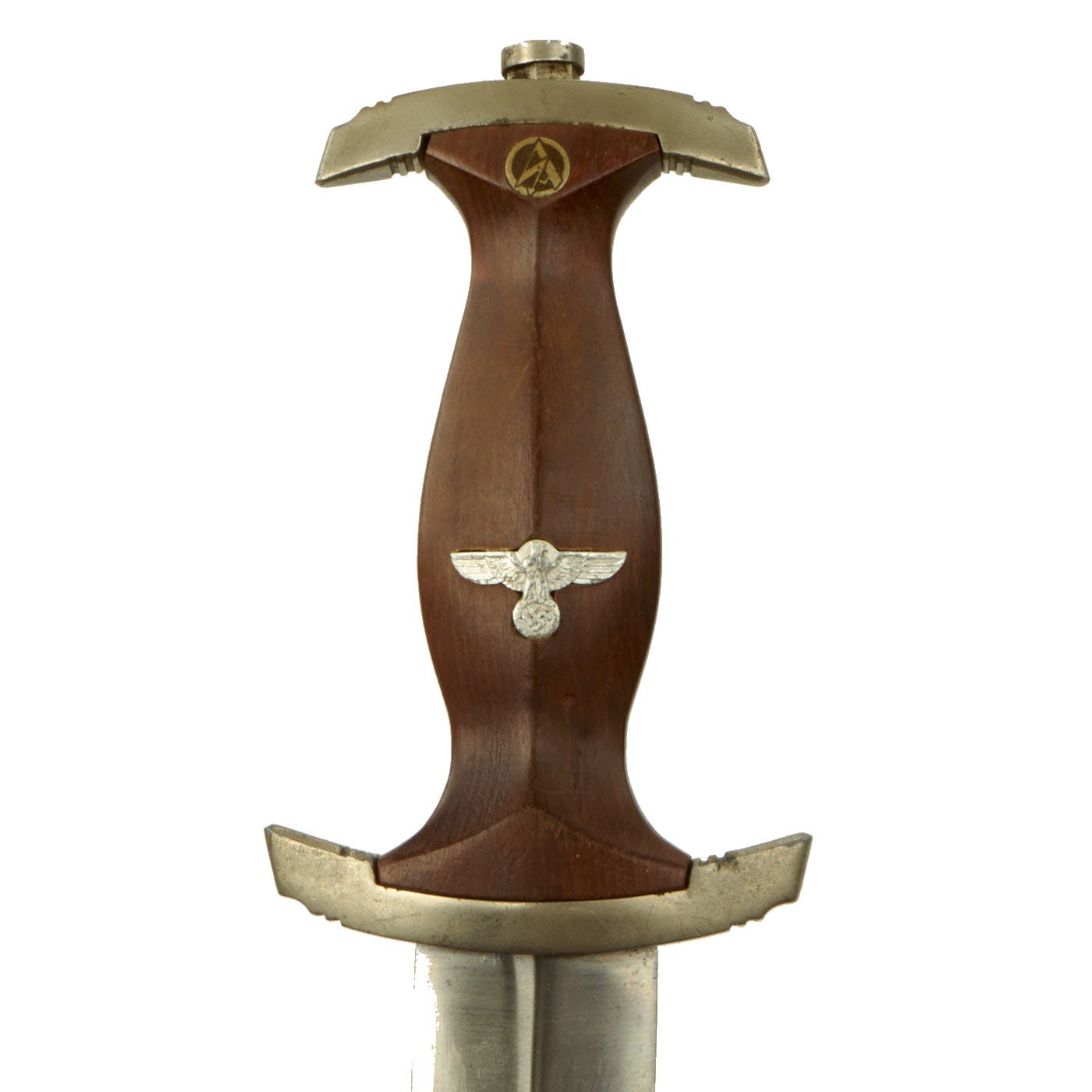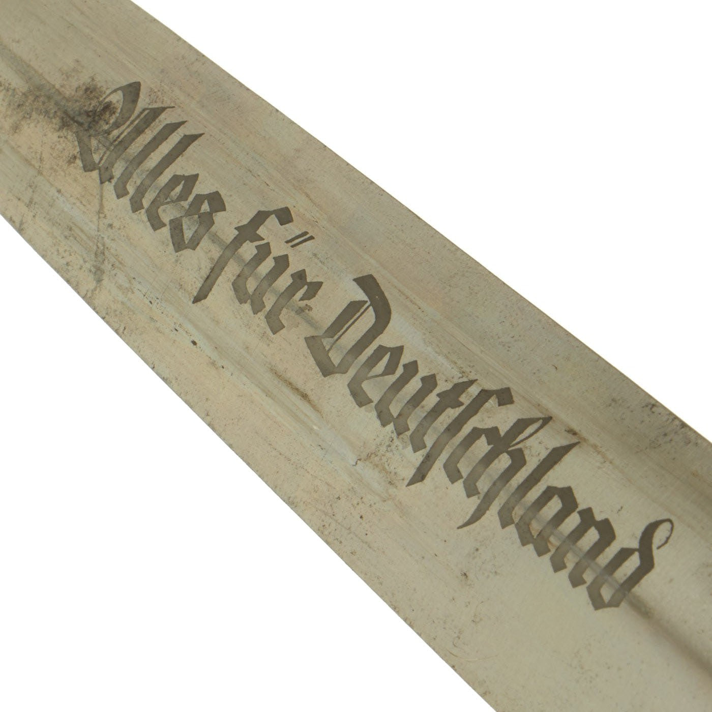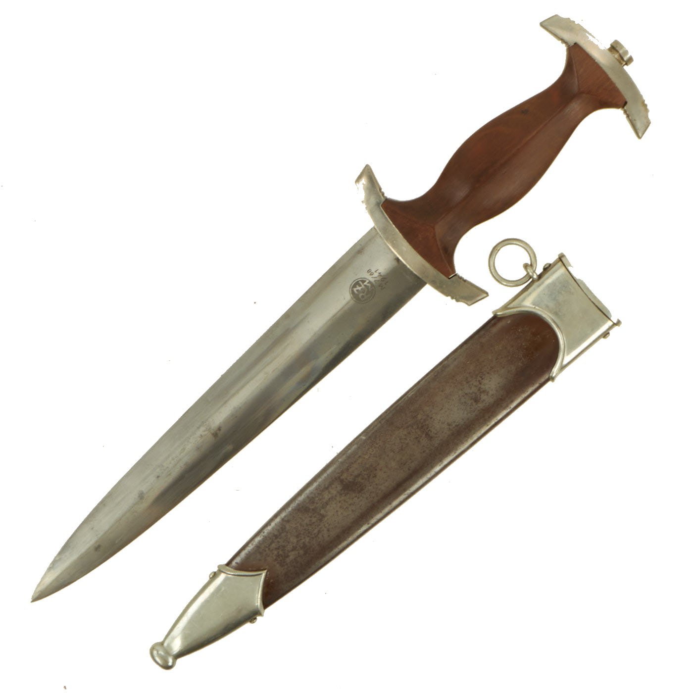 The blade was etched with the SA motto, Alles für Deutschland. Examples produced prior to 1935 were stamped with the German sector of the SA group on reverse lower crossguard. Later examples underwent standardization through the RZM ministry. These pieces were produced of cheaper plated zinc-base fittings and scabbards were simply painted brown.