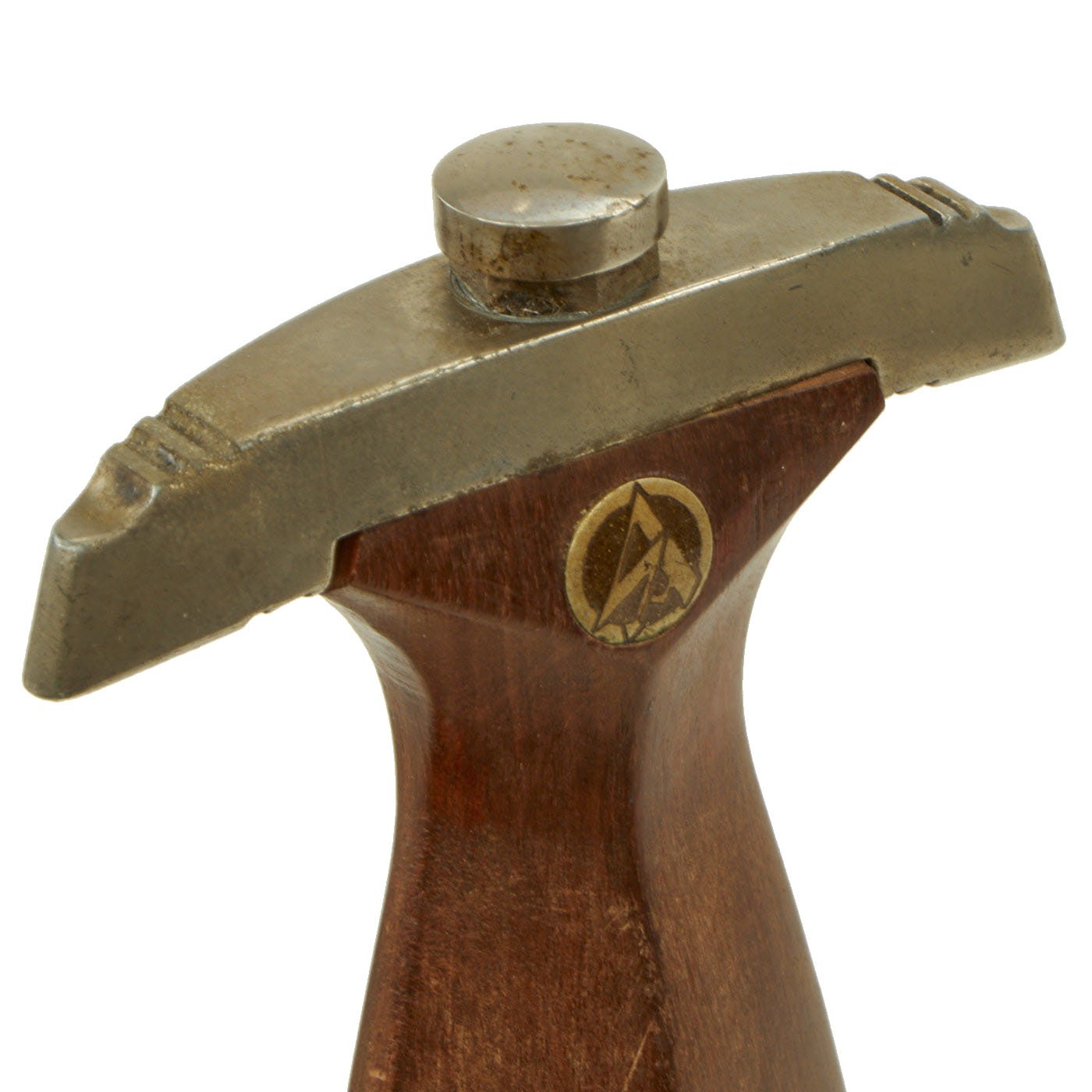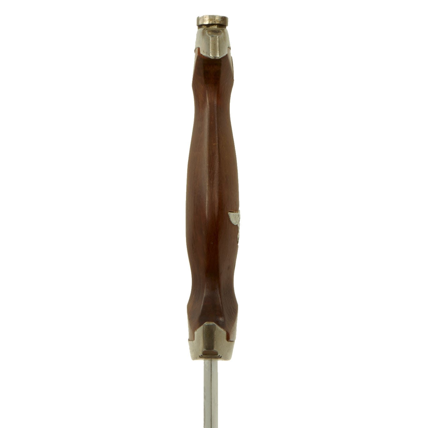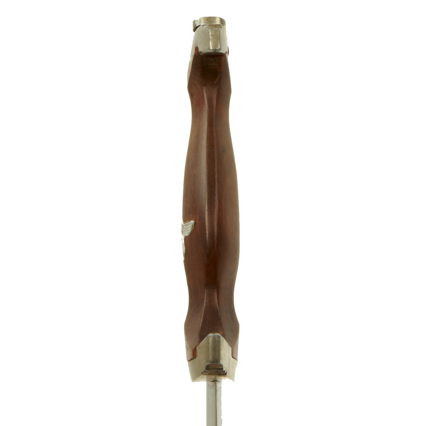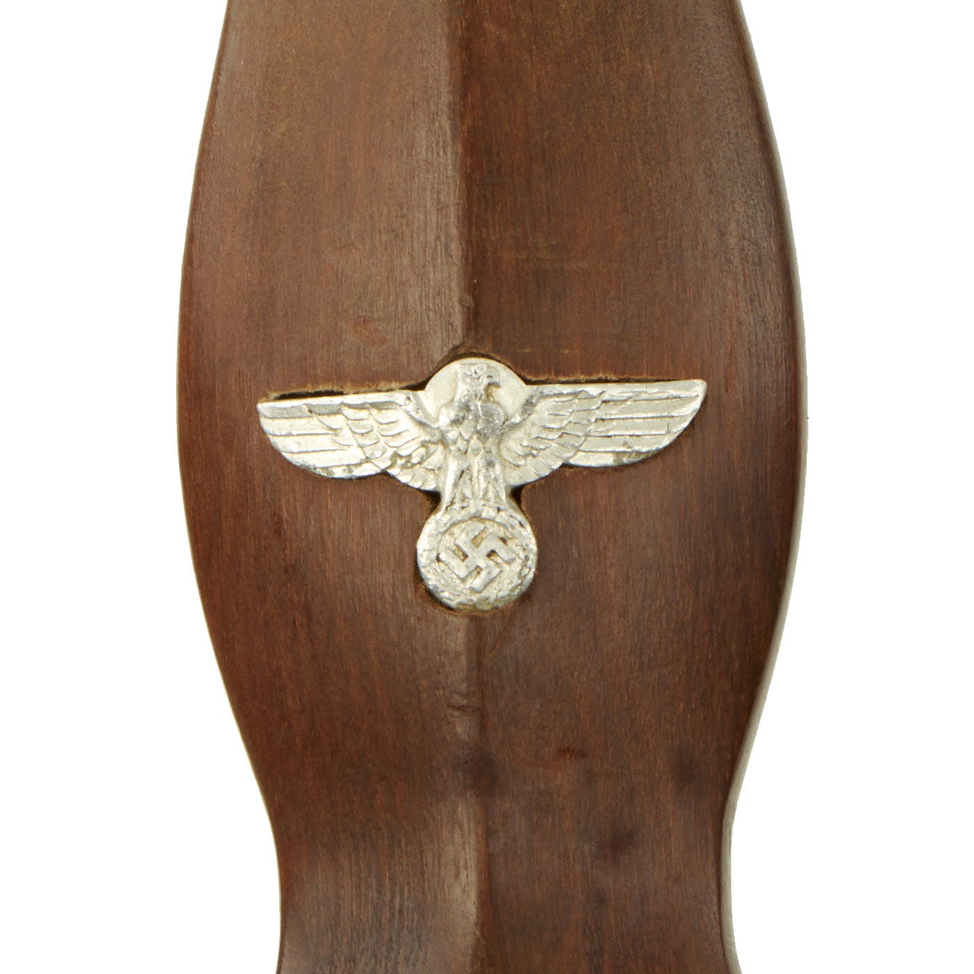 The grip is a fine product having a fine dark mahogany color tone in the surfaces and having medium center ridge construction. This grip is in very good condition with great grain, and fits the crossguards well, with no chipping or cracks that we can see. The symbol button is nicely set having fully intact enameling, and the plating intact with just a bit of verdigris and oxidation as shown. The details are still there to the inlaid aluminum eagle, including the beak, breast feathering, wing feathering, talons, wreath and mobile swas (hook cross).