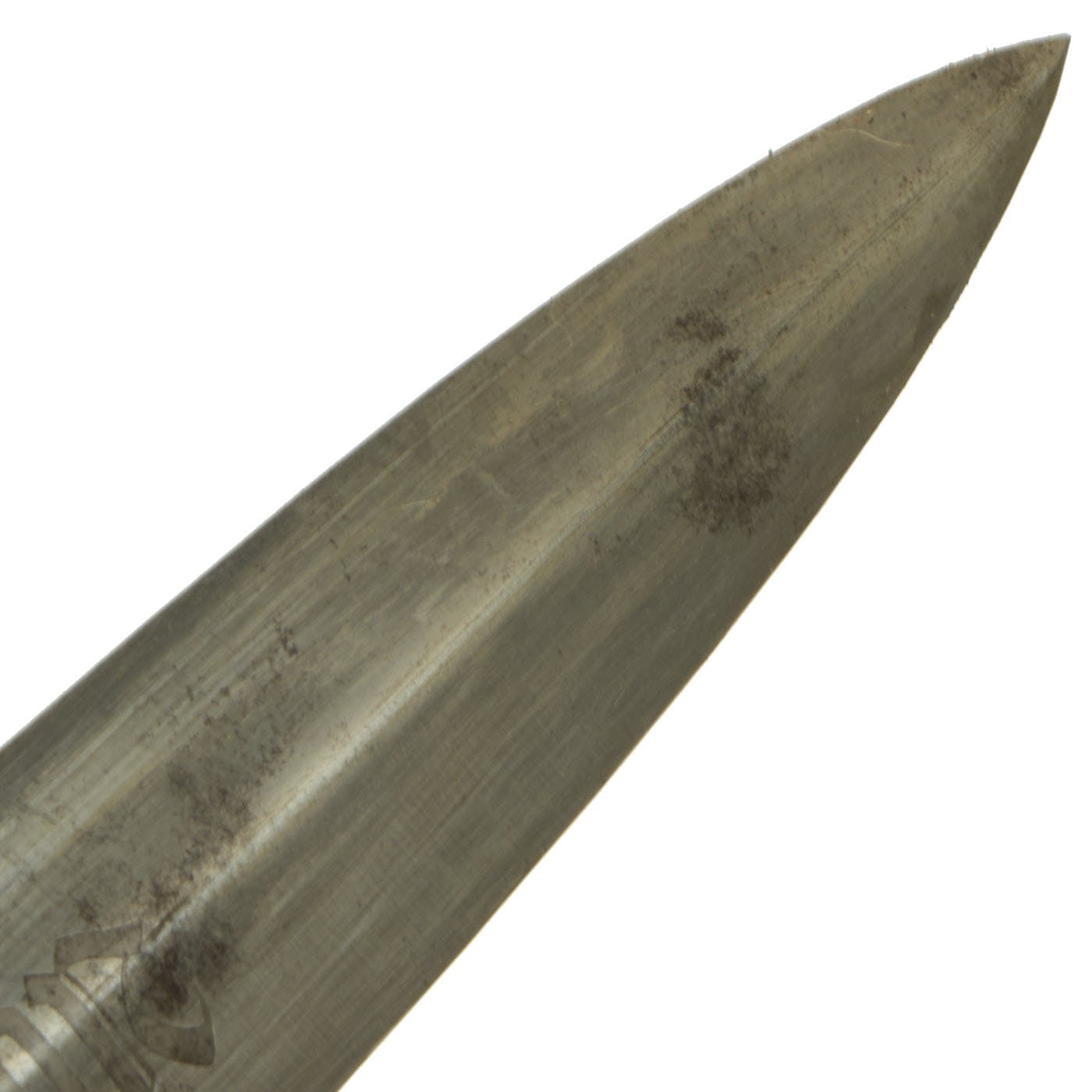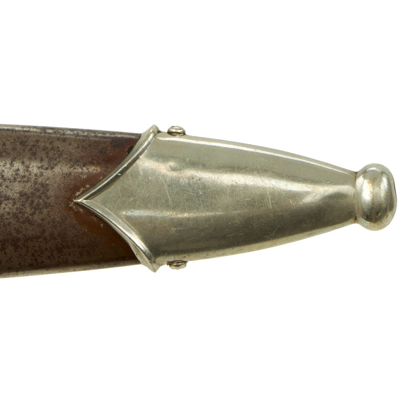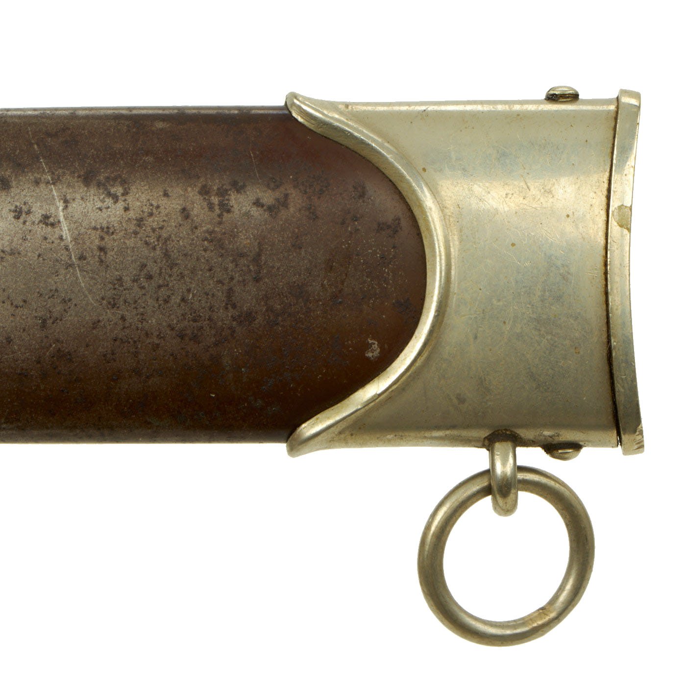 The scabbard shell is straight throughout and is the early-war style, which has a brown "anodized" finish on the steel, which was then lacquered. Most likely the scabbard was swapped at arsenal during servicing, or post war. It now is missing all of the original lacquer coating, which has allowed the original anodized color to wear, with the areas near the fittings retained. The rest is mostly worn away to a gray color. It has a dent on one side, but is overall in very good condition, with solid nickel alloy fittings.