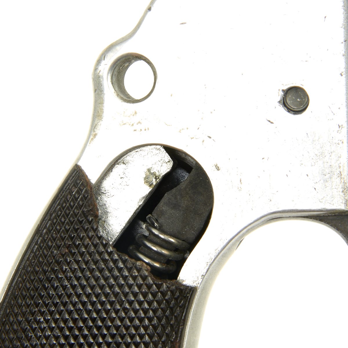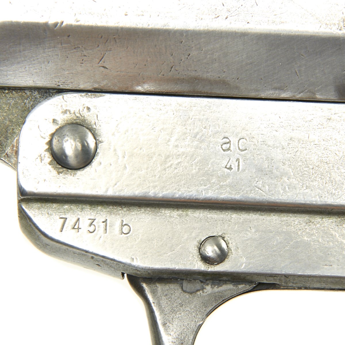 It has multiple eagle waffent amts and inspector marks indicate this is an early manufactured gun that bears the serial number 7431 on the frame. The checkered dark brown bakelite grips are in perfect superb condition with the exception of a 1 inch section that broke away on the right side upper panel. The frame is marked ac 41 for Waffenfabrik Walther, Zella-Mehlis 1941.
