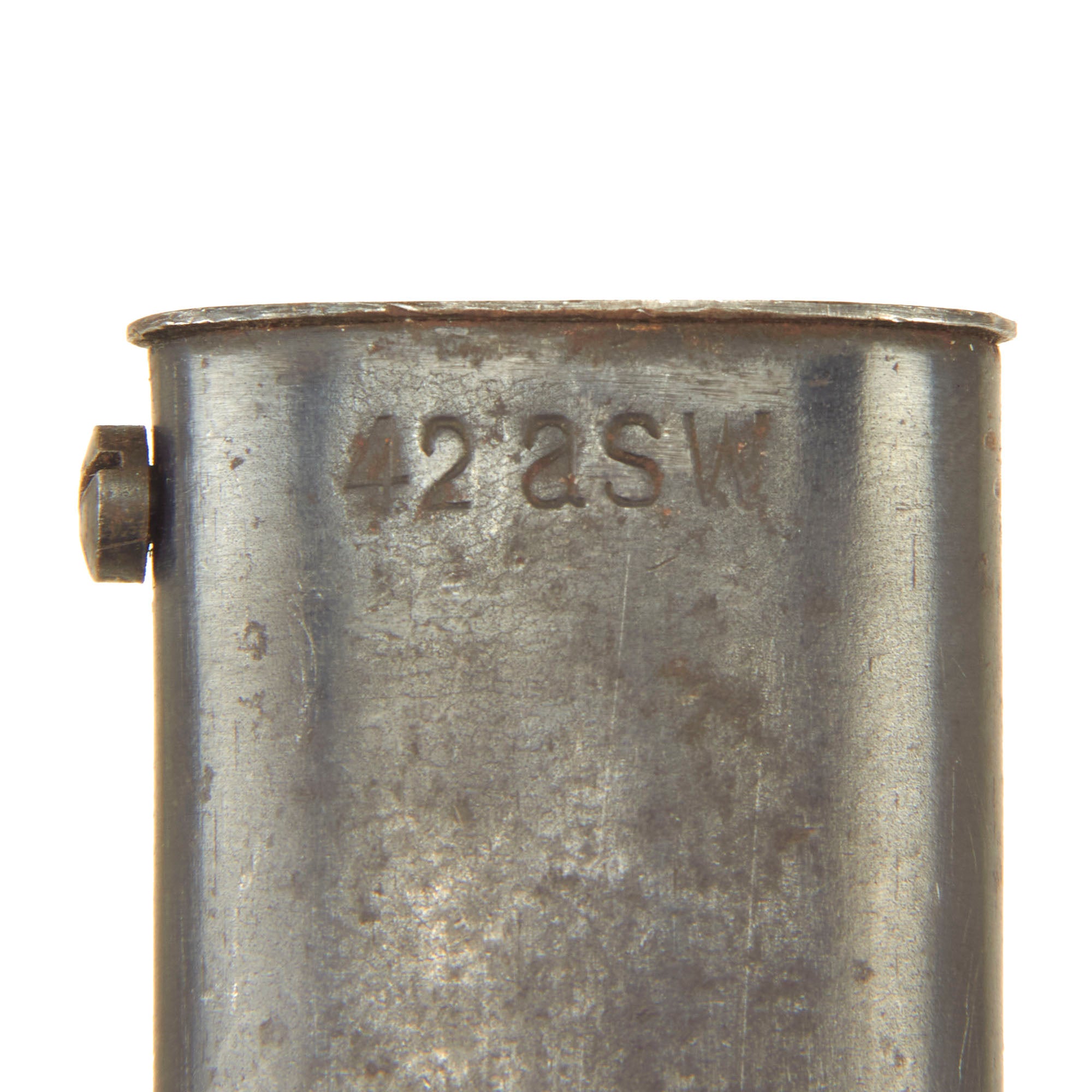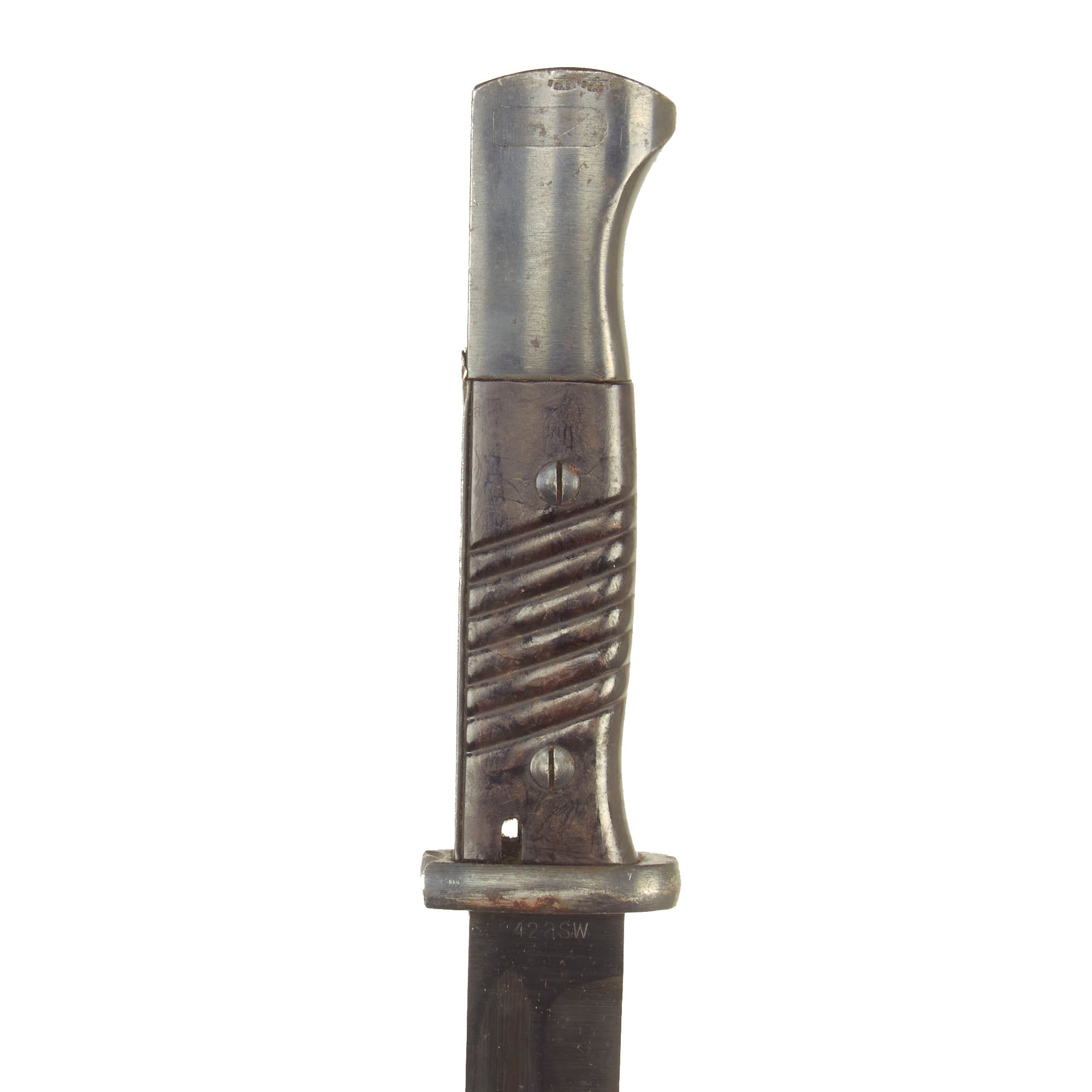 The total length of the K98 bayonet was 15.2 inches, far shorter than the 20 inch long GEW98 bayonet. The blade was also straighter in shape and the hand guard was omitted. The K98 bayonet was carried in a leather frog, or Seitengewehrtragetasche, on the left side on the equipment belt in combination with the shovel and its carrier. The maker marks on k98 bayonets where stamped onto the top of the blade. On the reverse the batch number and suffix were stamped. Early WWII bayonets from some makers also had markings on the spine.